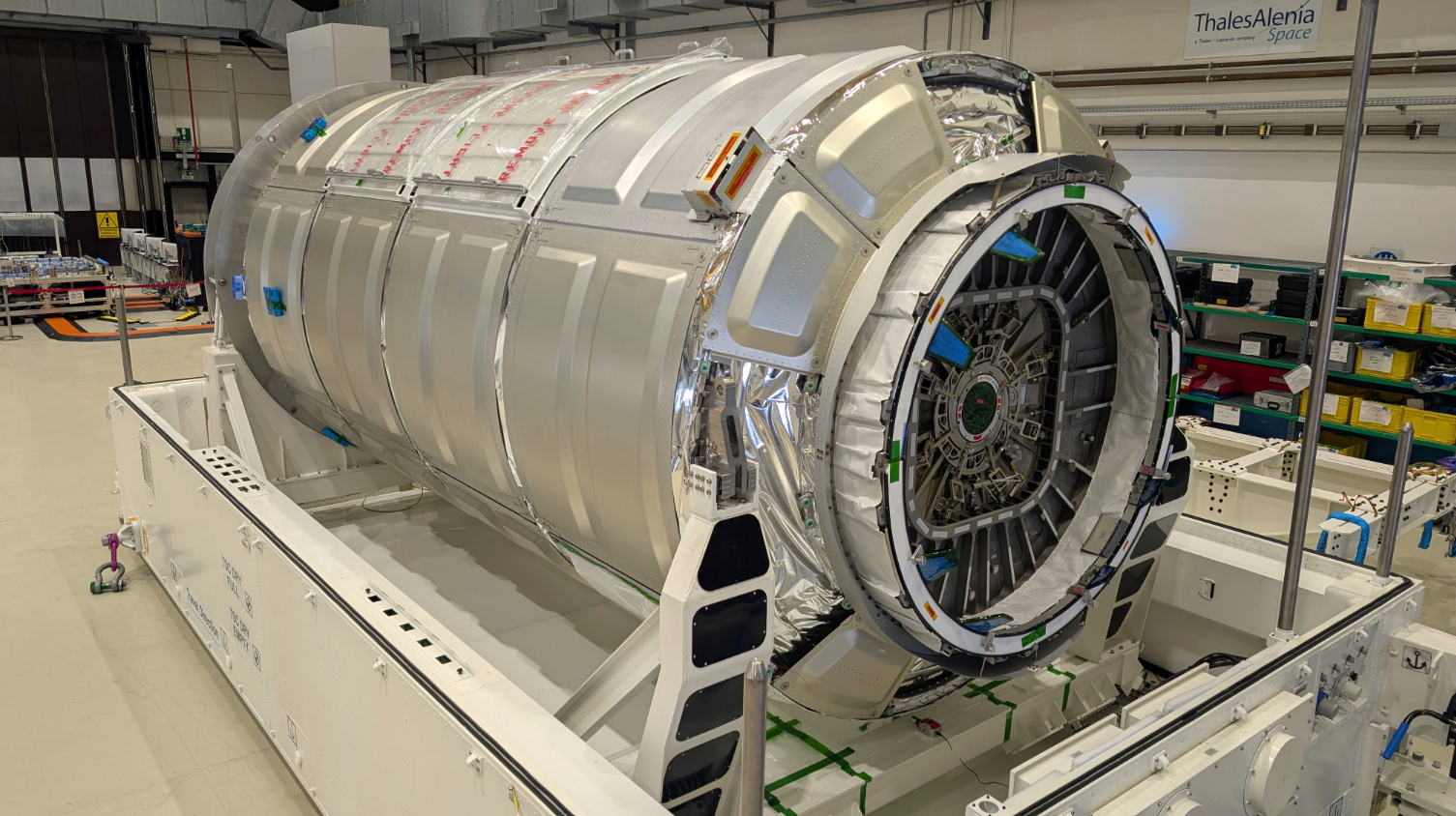 Le module pressurisé Cygnus 4 au KSC, le module de service en attente chez ATK, Virginie et modules en attente à Thales Alenia Italie.