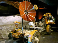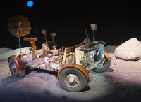 Maquette exposée au US Space & Rocket Center de Huntsville sur un terrain simulant le sol lunaire.   Une maquette du LM mis en place au cinéma du centre Apollo Saturn.