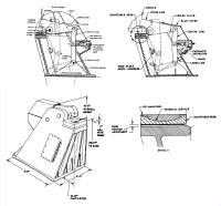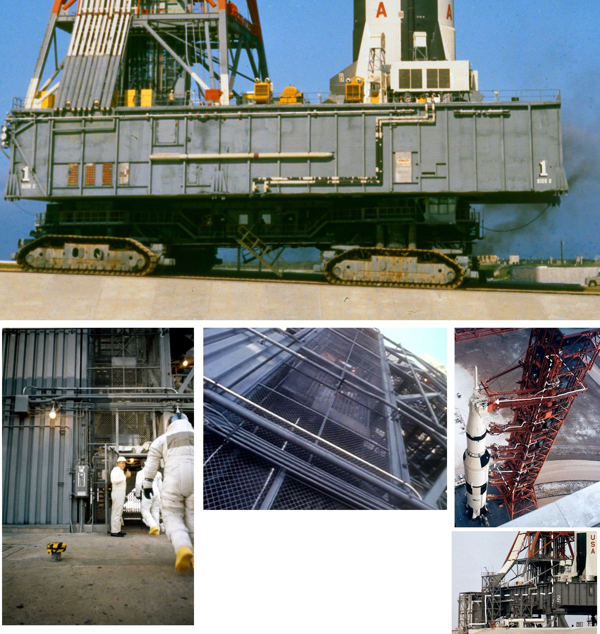 Les interface sol du LUT avec le Crawler et le pad. Interface 1,2,3,4,5 et 6. La plateforme est positionnée mécaniquement sur six piliers de 6,7 m de haut sur le pad ou le parking d'érection, appelés "Mount Mechanisms". Ils sont situés tout autour de la plateforme, 4 sont aux 4 coins de la plateforme et 2 autres sous le montant G14 qui supporte la tour ombilicale. Ils doivent assurer le maintien du LUT lors des ouragans et des mouvements de charges selon la température. Chaque pilier est numéroté, de 1 à 6, en partant du coin au N-E, side 3 et 4, le coté 4, 1 et 2. Ils sont de 3 types, avec 2 diagonales (pilier 2), une diagonale (pilier 1, 3 et 5) et fixe (piliers 4 et 6). Les diagonales assurent un réglage très précis de l'alignement de la plateforme. Les piliers de types 2 assurent un alignement dans une seule direction et ce de type 3 selon les 2 directions. Le pilier "2" du LUT parksite" près du VAB, du type 1 avec 2 diagonales. Le pilier "3", à l'angle des cotés 1 (Sud) et 4 (Est) de type 2, avec une diagonale. A gauche, un des 4 autres pieds qui soutiennent la tour MSS sur le pad. Des " pointes " de 22 cm de diamètre au maximum fixées sur le ML permettent un alignement parfait. La fixation est réalisée par 12 boulons attachant la plateforme aux piliers. Sur le pad 39A, les 6 pieds soutenant le LUT ont d'bord été peint en jaune pour l'opération AS500F et le vol Apollo 4. Depuis, ils ont été reprint en gris. Sur le pad 39B, ils ont jaune uniquement pour pour Apollo 10. Sur le parking des ML, près du VAB, les piliers des 2 places sont restés de couleur jaune tout au long du programme lunaire et jusqu'au début des années 80. Le réglage de la colonne et des diagonales sont de 91 cm et 45 cm. Dans le VAB, on retrouve les mêmes 6 piliers mais sous un design plus léger, les contraintes n'étant pas les mêmes en intérieur. Ces piliers là sont de 3 types aussi, un fixe (type 4), 2 avec une diagonale (type 5) et 3 fixes réglables (type 6). Le pilier fixe de type 4 est aussi plus court (6,4 mètres). Interface 7,8,9 et 10 Quatre interfaces permettent au crawler transporter de soulever la plateforme. Elles sont situées sur les montants G 3, G 4, G 9 et G 10. Les deux points sur le coté 1 sont situé exactement sous l'axe du lanceur. Interface 11,12,13 et 14 Quatre piliers extensibles sont utilisés pour absorber le poids additionnel de carburant et la charge dynamique au moment du décollage. Ces piliers sont essentiellement des vérins hydrauliques réglés en conséquence. Ils sont situés sous les montants G4 et G 10 et au bout des montants G 15 et G 18, encadrant pratiqument la fosse des moteurs du lanceur. Dans les premiers projets, les concepteurs avaient imaginé que ces colonnes soient enfouies dans le sol et télescopiques. Les 8 piliers de soutien du Saturn 5 vue dans un champs de la zone industrielle du KSC dans les années 80-90 avec le reste du LUT 1 et la trace au sol sur le pad où se fixaient les piliers extensibles.
