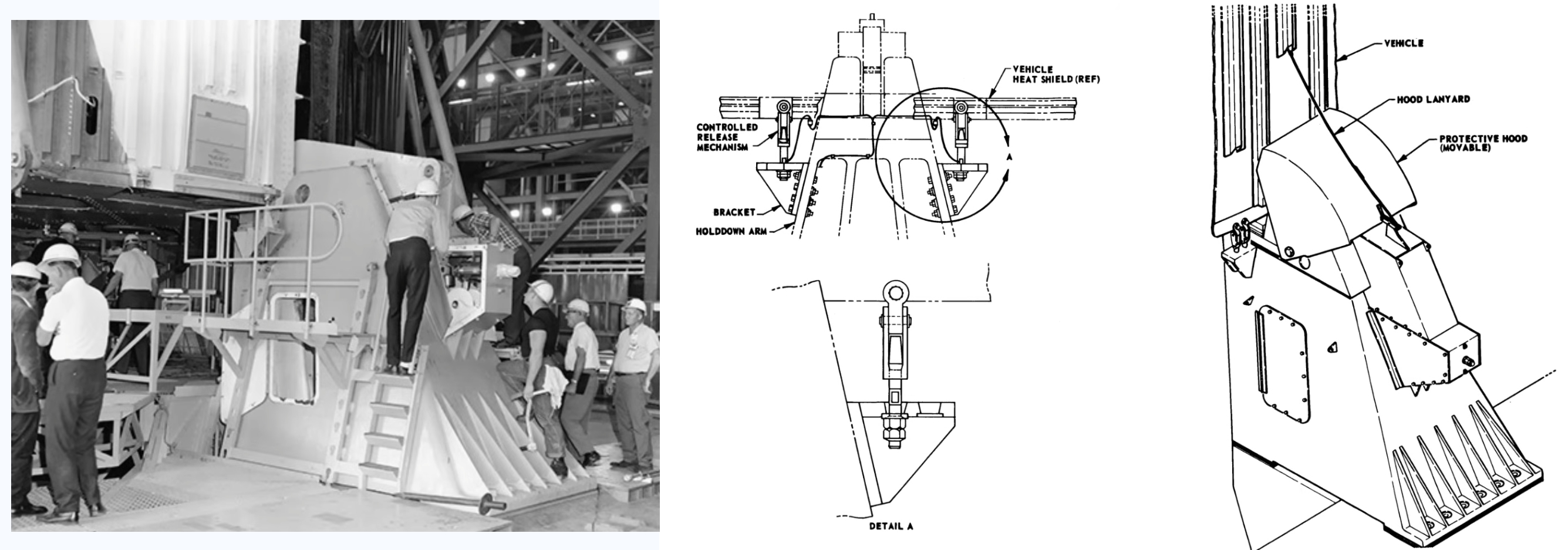 Au moment de l' allumage du premier étage, le lanceur est retenu au sol tant que les moteurs n' ont pas atteint le plein régime. L' intervalle d' ouverture des crochets ne peut excéder 0,050 secondes. Si aucune séparation pneumatique n' intervient après 0,180 secondes, des charges explosives libèrent le lanceur. Chaque crochet s' ouvre rapidement, mais le lanceur est retenu d' une ascension trop rapide par un mécanisme de contrôle qui fait passer la force à zéro en 0,6 secondes. Ce système est constitué à la base d' une attache conique maintenu dans une cavité elle même fixée à la base de l' étage du lanceur. Une fois le lanceur libéré, l' attache conique glisse dans la cavité pendant les 15 premiers centimètres de l' ascension. Ces crochets sont protégés des flammes des moteurs du premier étage par des capots amovibles. Le lanceur, dans son ascension entraîne leur fermeture (grâce à des câbles attachés au lanceur ). Vue d'un des câbles attachés sur le capot protecteur d'un HDA et relié à l'étage S1C. Une étude avait conclu le risque principal d'explosion au décollage serait du à une collision avec la tour ombilicale. Selon cet étude, 7 facteurs pouvaient influencer le décollage du Saturn 5: une variation de la force dans les HDP de plus ou moins 15%, variation de la poussée de 4%, mauvais alignement d'un moteur, décalage du centre de gravité, le vend, la panne ou la casse d'un moteur. Le principal problème pour les ingénieurs étaient d'éviter une collision avec la tour ombilicale pendant les 7,5 premières seconde de vol. Toutefois le vent ou un mauvais alignement moteur ne pouvaient causer une collision directe avec la tour, seul une combinaison de ces raisons avec une défaillance ou une casse moteur pouvait le faire. Pour éviter le risque de collision avec la tour, le lanceur partait avec une trajectoire qui l'éloignait de la tour durant les 10 premières secondes. Pour la petite histoire, lors du premier vol du Saturn 5, Apollo 1, Rocco Petrone, le patron du KSC regardait le lancement depuis la "firing room" du LCC à 5 km de distance assis dans son fauteuil. Sa main était posée sur le bouton qui fermerait les panneaux de protection devant les grandes vitres du bâtiment si le lanceur explosait au décollage. Si Saturn 5 avait explosé au décollage, une étude a montré en 1965 que cela aurait été comparable à une petite bombe atomique 543 000 kilogrammes de TNT, la moitié d'un kilotonnes en langage militaire, soit 1/26 de la bombe d'Hiroshima. L'explosion détruirait la tour et le Mobil Launcher ainsi que les installations au sol. Le feu se répandrait tout autour du pad sur des kilomètres brûlant végétations et animaux. L'explosion du lanceur soviétique N1 en juillet 1969, l'équivalent de 250 kilo de TNT avait détruit toutes vitres autour d'un rayon de 50 km. Normalement l'explosion du Saturn 5 sur le pad devrait détruire le module de commande. Seul la présence de son bouclier thermique pourrait le sauver ainsi que l'équipage en l'expulsant au loin. Quel serait l'intérêt d'avoir un module de commande intact retombé au sol en parachute et voir les sangles et le tissu brûler par la chaleur de la boule de feu. Selon les calculs des ingénieurs, la boule de feu résultant de l'explosion durerait 33 secondes avec une température de 1390°C, la chaleur rayonnant sur un rayon de 600 mètres. Ces informations ont alors été intégré dans l'étude sur le système d'éjection du CM. En février 1964, la NASA contracte Space Corporation de Dallas pour la fabrication de ces HDA. 676320 $ sont donnés pour la réalisation de 16 crochets en 16 mois. Les travaux se terminent en octobre 1964 et les premiers crochets sont livrés en mars 1965 pour des essais au centre Marshall. Après toute une série de tests de vibration et de charges, il rejoint le KSC en mai avec les 15 autres crochets pour installation le 25 sur le LUT 1. Un des problèmes majeur du système était une parfaite synchronisation des 4 crochets lors de la libération du lanceur. Si un crochets reste fermé, le résultat pouvait être catastrophique pour le lanceur et son équipage. Comme l'informatique de l'époque n'était pas aussi précise que maintenant, il a fallu redonder tous le système pneumatique assurant le maximum de sécurité. De part leur masse, ils exigeaient une base relativement solide, réalisée par la division "équipement" du KSC sur la plateforme, ce qui valut aux techniciens et ouvriers du centre le prix du Steel Founder's Society of America 1965. Entre 1967 et 1972, les 12 HDA des trois Mobil Launchers ont parfaitement fonctionnés au cours des 13 lancements de Saturn 5. Les 4 crochets du LUT 1 ont été démontés en 1970 pour laisser la place au "milkstool" des Saturn 1B, tandis que ceux des autres plateformes était démontés et exposés un temps au KSC Visitor. Leur localisation est aujourd'hui incertaine. En plus de ces quatre crochets, trois mats de service TSM (Tail Service Mast) sont installés à la base du lanceur. Ils servent de support pour les liaisons électriques, lignes carburant, hydraulique, et pneumatique du premier étage S1C. Au lancement, après déconnexion du lanceur, un système de bascule les fait pivoter en arrière, 2 mâchoires se referment alors sur les prises ombilicales pour les protéger des flammes. Le vol Apollo 4 utilisa ces TSM sur le LUT 1, mais le décollage les endommagea sérieusement, les capots ont littéralement volé en éclat sous la puissance des moteurs F1. Un nouveau dessin est réalisé: les capots ainsi que tous leurs mécanismes de fermeture et hydrauliques sont abolis, mettant à leur place, la protection la plus simple imaginable. Une tour métallique en treillis est érigée au-dessus de chaque TSM au sommet de laquelle était montée une capuche avec une visière, un peu comme le casque blindé d'un chevalier. Pour le lancement, la visière est relevée et verrouillée en posi