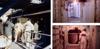L'accès vertical aux compartiments intérieurs de la plateforme est possible par 16 ouvertures de 1,5 m par 2,4 découpées sur le pont principal au niveau " 0 ". Les plaques qui recouvrent ses écoutilles sont fabriquées à partir d'un montant de 2,5 cm, et sont encastrées dans le pont et maintenues au niveau de la surface. Les couvercles sont tenues en place grâce à des boulons de 1,9 cm avec joint. Quatre élévateurs sont prévus pour les déplacer. Huit repères ajustables définissant les lignes longitudinales et transversales du lanceur sont encastrés sur le pont. Ils sont protégés par des plaques en acier attachés sur le pont. Interface du LC39B en 1969 Photos des interfaces sur le coté 2 de la plateforme. Elles servent pour l'eau potable, de refroidissement, l'air conditionné et le système de déluge et anti incendie. LES HOLD DOWN ARM "HDA" ET LES TAIL SERVICE MAST "TSM" Un trou carré de 12 m de coté est aménagé dans la plateforme pour permettre le passage des moteurs du premier étage du Saturn 5 (la chambre des moteurs ou fosse des moteurs). Ce trou est constitué des montants G 6, G 7, G 16 et G 17 dont l'épaisseur varie de 8 à 20 cm. Quatre crochets disposés à 90°, les Hold Down Arm maintiennent les 2900 tonnes du lanceur Saturn 5 sur sa table de lancement au niveau du premier étage. Pièce maîtresse et majeure de la plateforme, ces crochets assurent la stabilité du lanceur dès son montage dans le VAB, le transport et l' attente sur le Pad. Les vibrations induites dans le lanceur sont absorbées 110 m plus haut par un "bars amortisseur" situé au niveau de la tour LES. Ces HDA d'une masse de 18 tonnes mesurant 1,93 m de large, 2.92 m de long sur 3,16 m de haut sont boulonnés au bord de la fosse moteurs. Ils maintiennent le lanceur avec une force de 350 tonnes chacun grâce à un système pneumatique. Détail de la chambre moteur et des Hold Down Arm. Mécanise de retenue du lanceur et couvercle de protection du HDA