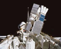 SPACELAB, Les seules vues du Spacelab dans la soute de l'Orbiter dans l'espace sont prises par l'équipage de la station spatiale russe MIR 1 à laquelle Atlantis va s'amarrer en juin 1995 lors de la mission STS 71. Le Spacelab est en configuration module long, STS71, Atlantis se sépare de MIR, photographié par l'équipage MIR19 du Soyouz TM21, Solyvyev et Budarin, le 4 juillet 1995 CONFIGURATIONS Le Spacelab, laboratoire de l'espace est constitué de 2 éléments principaux, logés dans la soute de l'Orbiter, le module pressurisé habité et les palettes extérieures. Le module est relié au compartiment habitable de l'Orbiter par un tunnel. Le module est configuré à l'intérieur pour recevoir les appareils et les expériences dans des racks standards. Les palettes à l'extérieur sont exposées au vide spatial. Sont associé à ces palettes, l'Igloo, une structure cylindrique abritant, en configuration palettes seules, les équipements du sous système et l'IPS, le système de pointage nécessaire pour les télescopes par exemple. Le Spacelab peut voler en 8 configurations de vol, dont 4 de base : _