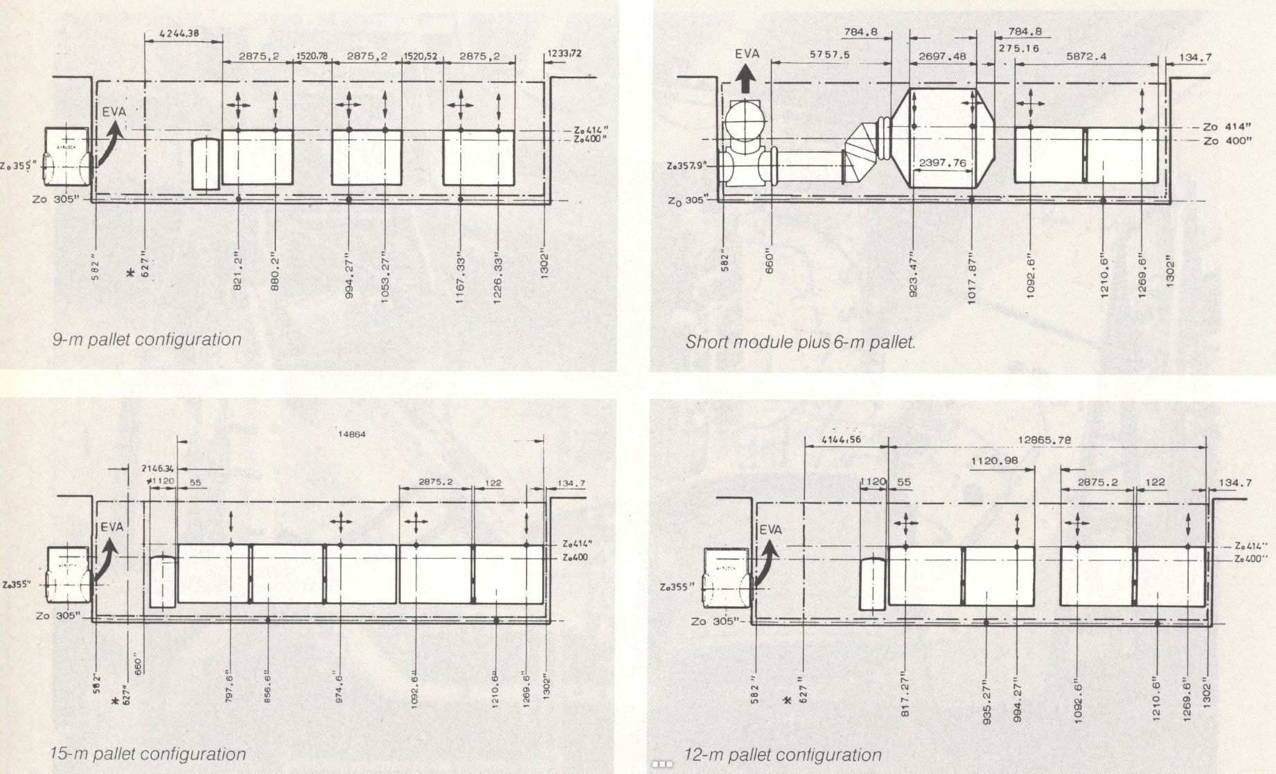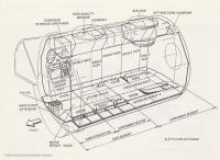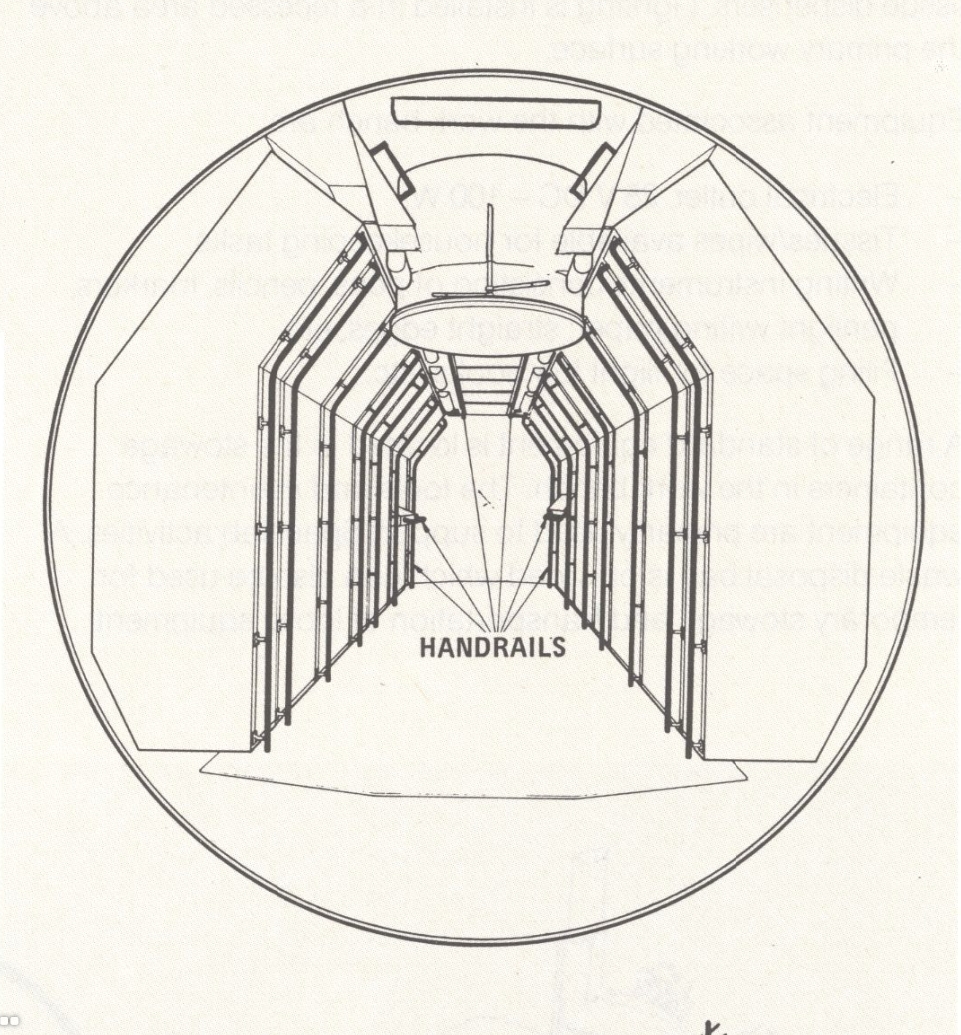 Module long, 7,2 m. Configuration 1 à 4 et 5 à 8 pour le Spacelab. Seules les configurations avec modules long voleront dans l'espace, soit seul, dans la majorité des cas, soit associé à une palette (SL1) ou un train de 3 palettes dans la soute (Spacelab 2). LES MODULES Le module pressurisé est constitué d' une combinaison d' un ou deux segments cylindriques, chacun de 4 m de diamètre et 2,7 m de long. Il est fermé de chaque coté par des sections coniques appelées " cône final ". La première configuration, module court est constituée d' un segment et de deux cônes. Avec deux segments, un principal, l' autre pour les expériences et deux cônes, on constitue le module long. L' entrée dans le module se fait à partir de la cabine de l' Orbiter par un tunnel de liaison qui l' alimente en énergie, eau, oxygène. Toutes les configurations de vol contiennent les mêmes arrangement intérieurs. Le sous système essentiel est installé dans le premier double " rack " sur chaque coté et sous le plancher du segment principal. Le reste de l' espace des " racks " du segment principal et de tous les " racks " du segment expérience peuvent être utiliser pour les expériences. Chaque segment est équipé au plafond d' un container de 1,3 m de diamètre intérieur destiné au logement du CPSE, l' équipement support de charge commune à savoir le haut du sas pour le segment expérience ou l' ensemble adaptateur hublot ou la fenêtre haute qualité/ l' ensemble hublot. Quand les hublots ne sont pas utilisés, il sont obturés par des couvercles plats. Le hublot de derrière donne une vue complète des palettes dans la soute. STRUCTURE DE LOGEMENT DU MODULE Vue en coupe du module double Tableau des ressources pour les utilisateurs du Spacelab sur les 5 configurations type du Spacelab Dans le module, les expériences sont logées dans des " racks " simples ou doubles ou dans des containers en hauteur ( sous le plancher dans le segment expérience). Les expériences qui doivent être contrôlées directement par l' équipage sont logées soit dans le sas, soit sur les hublots, ou les deux à la fois pendant la mission (ils sont rangées à l' abri au lancement et au retour). Les racks standards sont des 19 pouces, soit 48 cm de large. Dans ces rangements sont fixées toutes les expériences et appareils de mesures, contrôle, visualisation… Ils sont réalisés en aluminium 7075 T73 et assemblés par rivets et boulons. Les points d' attache supérieur sont usinés en titane 6AL4V. Pour l'aménagement intérieur, les ingénieurs ont suivi les conseils des astronautes de Skylab, Owen Garriott et Bob Parker. Ils ont finalement opté pour un sol plus sombre et un plafond plus clair, car les astronautes préfèrent s'orienter ainsi. Au départ, il était envisagé des chaussures à fixer au sol, mais ils avaient déjà essayé sur Skylab. À la place, il a été opté pour des boucles en tissu souple dans lesquelles on pouvait glisser les pieds, car en apesanteur, les jambes gênent. Deux doubles racks offrant un volume de 1,75 m3 et une capacité de 580 kg chacun, plus deux simples racks offrant 0,9 m3 et 290 kg chacun peuvent être installés dans le segment principal du module. Quatre doubles et deux simples racks peuvent être installés dans le segment expérience.