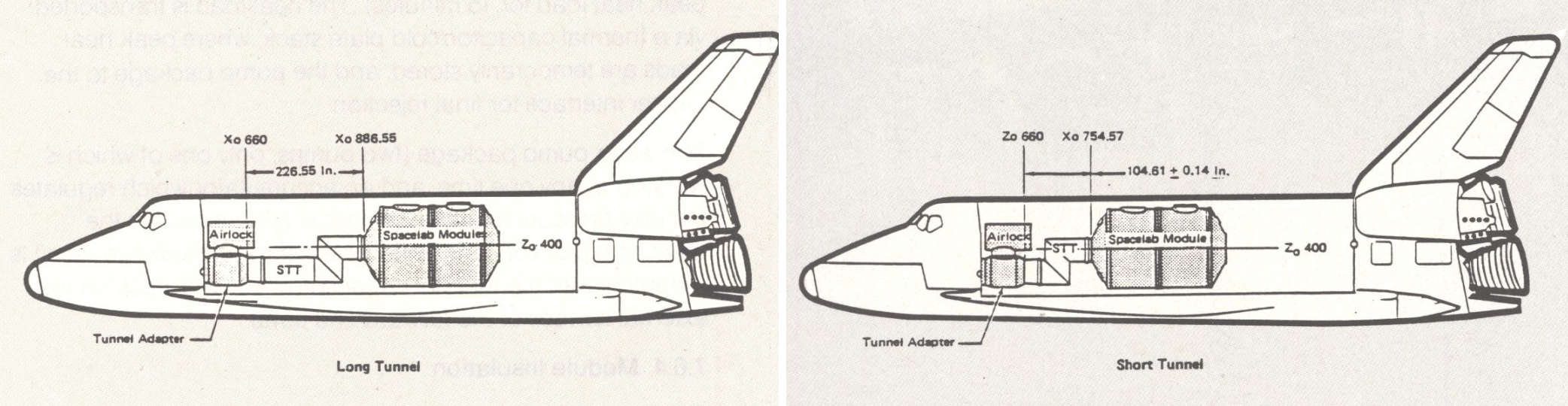 en Viton protégé par du Nomex. C'est Mc Donnel Douglas qui a conçue le tunnel du Spacelab en 1977. Dès 1974, la NASA avait décidé de mettre le module pressurisé à 2 endroits dans la soute de l'Orbiter, ce qui impliquait 2 tunnels, un court ou un long. De plus, l'entrée du module étant centrale, il a été décidé de placer la partie centrale en bas de la soute, ce qui impliquait une section décalé pour rejoindre le middeck de l'Orbiter. La partie en "Z" fut délicate à réaliser et du être renforcées. La revue critique de conception a eu lieu en septembre 1980 et le tunnel livré au KSC début 1982 Le tunnel est attaché dans la soute à la quille et sur les parois par des entretoises et des ferrures, au niveau de la section de 3 m et sur la partie en " zizag ". Extérieurement, le tunnel est recouvert d' une protection blanche, la même que sur le module, fait de 36 couvertures pour le tunnel long et 33 pour le tunnel court. Des "mains courantes" sont fixées le long de la ligne médiane supérieure du tunnel pour faciliter les déplacements lors des EVA.À l'intérieur du tunnel, deux jeux de mains courantes, placés sur des parois opposées, permettent le passage de deux membres d'équipage voyageant en sens inverse. Installation du tunnel long dans la soute Vues depuis le module vers le tunnel et à l'intérieur de celui-ci Le TATA, Tunnel Adapter Truss Assembly est une structure placée dans la soute de l'Orbiter fournissant une atmosphère pressurisée supplémentaire permettant à l'équipage de se déplacer entre le module Spacelab et l'Orbiter. Sur les missions Spacelab, le TATA permet à l'équipage de passer du pont intermédiaire de l'Orbiter au tunnel du module. L'écoutille, qui est normalement ouverte dans le TATA reste normalement ouverte pendant l'utilisation du tunnel et du module. Cependant, quand le TATA et le sas EVA sont utilisés, la zone habitée peut être isolée en fermant l'écoutille. Il n'y a pas d'écoutille à l'ouverture du module Spacelab. Le Tunnel Adapter vole 21 fois pour le programme Spacelab (STS-9, 40, 42, 50, 55, 58, 65, 71, 74, 76, 78, 83, 89, 94, 91, 95, 96, 101, 106, 116 et 118).