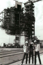 Photo prise le 8 juin 1978 montrant les 6 éléments de la tour ombilicale du LUT 2 qui seront amenés sur le pad 39 B pour constituer la tour FSS du pad. Juste devant les éléments restants qui seront découpés et vendus. Le 15 août, un autre contrat est passé avec Algernom Blair Industrial Contractors Georgie pour le changement des systèmes d' alimentation en LOX et LH2 et en divers gaz ainsi que la mise en place d' une nouvelle protection contre les flammes du lancement sur la plateforme. Le 30 septembre suivant, la première plate-forme de lancement mobile pour le Shuttle, le MLP 1 est déclarée opérationnel. Elle recevra les premiers éléments des boosters pour l' Orbiter Enterprise destiné à valider les installations au sol. Application de matériaux ablatif sur le déflecteur du pad 39A, 3e trimestre de 1978 Le 2 novembre, un contrat est passé avec Yvey 's Steel Erectors pour la consolidation du dessus de la plateforme MLP 2 afin de la protéger des flammes des boosters lors du lancement. Les travaux sont prévus sur 120 jours.