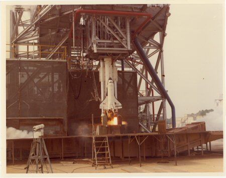 L'approche des considérations de charges acoustiques sur le STS était similaire à celle du Saturn 5. Les charges acoustiques initiales ont été prédites en utilisant une maquette motorisée à échelle réduite et les données du Saturn 5. L'allumage des SRB fait naitre une énorme surpression, dite IOP. De nombreux composants avaient été qualifié en utilisant bon pour le service parce qu'ils avaient auparavant voler sur Saturn 5. mais le lanceur lunaire ne générait pas cette IOP. Saturn 5 utilisait une plateforme avec la tour ombilicale intégré, le STS utilise la même plateforme, nue avec la tour ombilicale en fixe en bordure du pad.