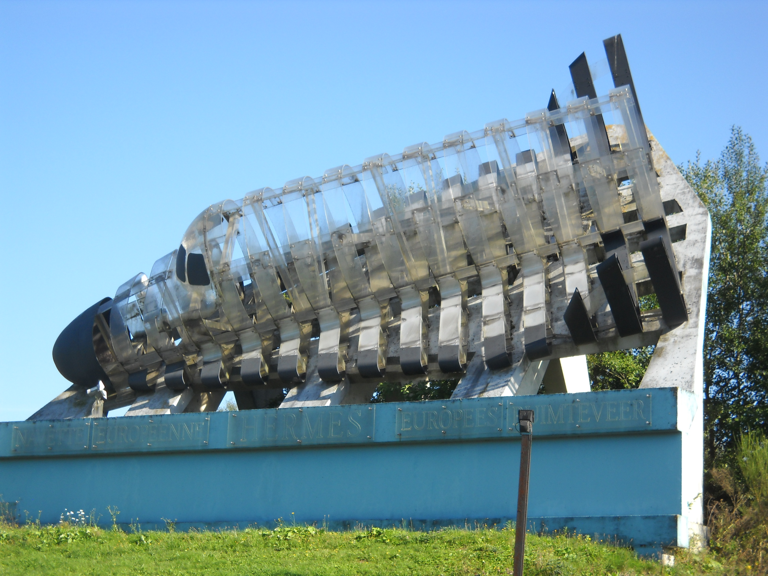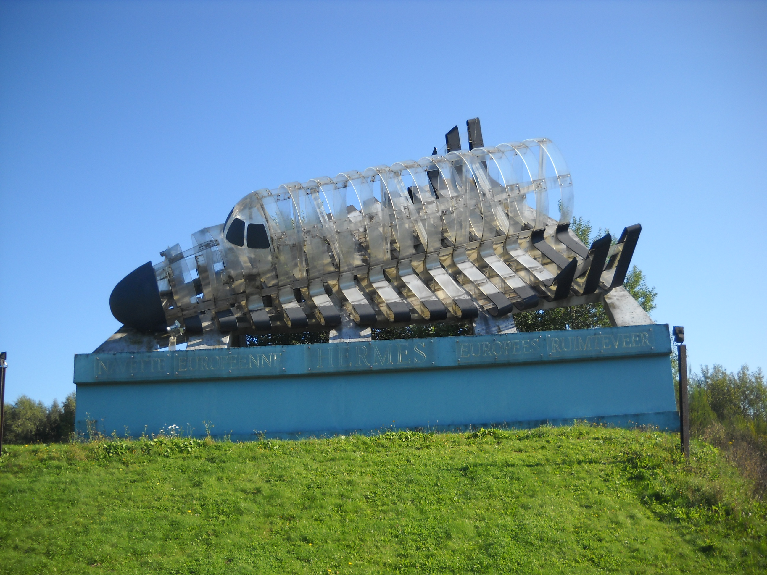 Peut on encore voir Hermès aujourd'hui quelque part ? La seule maquette à l’échelle encore en état d’exposition de la navette Hermès est une oeuvre d’Art de la compagnie Italienne Pansironi. Située en Belgique, sur le site de l’Eurospace Center de Redu (un centre de l’ESA à la vocation similaire que le Space Camp). Conçue en 1991 et jongée sur un imposant socle en béton, la maquette est constituée de sections fines de plexiglas transparents. La navette est présentée sans son module orbital et peut être admirée lorsqu’on visite le Space Center au milieu d’un parc rempli de maquettes de fusées. Elle est aussi visible le long de l’autoroute E411 Bruxelles-Luxembourg, dans une configuration originale, au milieu de la foret des Ardennes.