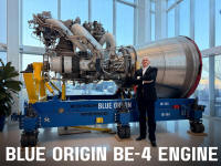 LES MOTEURS BE, "BLUE ENGINES" Les moteurs BE, Bleu Engines de Blue Origin sont conçus et développés au siège social à Kent, WA. BO produit les moteurs BE-4, BE-3U et BE-7 à Huntsville, AL. Les moteurs et sous-systèmes de propulsion sont minutieusement testés et qualifiés près de Van Horn, Texas et au banc d'essai 4670 à Huntsville, AL. BE-3U Le BE-3 a effectué son premier vol en 2015 en propulsant la fusée monoétage New Shepard. Il brûle des ergols liquide, LOX et LH2 et développe une poussée de 49 tonnes. Les ergols sont injectés dans la chambre de combustion grâce à des turbopompes. Celles-ci sont mises en mouvement par les gaz de combustion prélevés dans la chambre de combustion du moteur (cycle tap-off, analogue à un cycle générateur de gaz dont la turbine serait alimentée par la chambre de combustion principale plutôt que par un générateur de gaz séparé). Le moteur est réallumable. Pour répondre aux besoins de la fusée New Shepard, la poussée peut être modulée entre 100 et 20%. Le développement du BE-3 est officialisé en janvier 2013. L'entreprise n'a aucune expérience antérieure dans le domaine de la propulsion spatiale. Le moteur est développé pour propulser la fusée monoétage New Shepard construite par la même société dans le but de proposer des vols suborbitaux de quelques minutes à des amateurs de voyage dans l'espace. En 2013, des tests complets sur bancs d'essais simulant la durée du vol et le rallumage du moteur sont effectués avec succès. Le premier vol du New Shepard équipé du BE-3 a lieu le 29 avril 2015. Il emporte la fusée jusqu'à une altitude de 93,5 kilomètres. Un deuxième vol est effectué le 23 novembre 2015 au cours duquel la fusée s'élève jusqu'à 100 km puis le moteur est rallumé pour un atterrissage couronné de succès. Une variante du moteur, le BE-3U, a été proposée en 2015 pour propulser l'étage supérieur de la future fusée Vulcan de United Launch Alliance (ULA). En 2018, c'est une version améliorée du RL-10 qui fut choisie par ULA pour la Vulcan. Pour la fusée orbitale de Blue Origin, la New Glenn, l'entreprise développe la version BE-3U avec cycle à expandeur de gaz, le BE-3U, afin de propulser l'étage supérieur. Il est prévu d'en utiliser deux sur l'étage supérieur. Le BE-3U est un moteur cryogénique de 71 tonnes de poussée dans le vide, avec une accélération jusqu'à 53 tonnes et une IPS de 447 secondes. Deux moteurs BE-3U réallumables propulsent l'étage supérieur de New Glenn, permettant un large éventail de missions, notamment l'injection directe sur orbite géostationnaire. En novembre 2015, le moteur est prévu pour avoir une poussé dans le vide de 670 kN. En janvier 2016, l'US Air Force finança le développement d'une tuyère extensible du BE-3U pour une possible utilisation sur un lanceur de prochaine génération de Orbital ATK. En août 2018, le premier moteur de test a accumulé plus de 700 secondes de test, confirmant les performances prévues. En février 2019, Blue Origin a mis à jour la poussée du BE-3U à 71 tonnes dans le vide. Il est conçu pour se rallumer plusieurs fois.