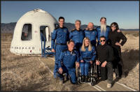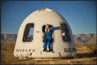 deviendra la personne la plus âgée à aller dans l'espace. Le 20 juillet 2021, prévu pour marquer le 52e anniversaire de l'alunissage d'Apollo 11, le premier vol habité , mission NS-16 avec le New Shepard 4 embarque 4 passagers, dont Jeff Bezos lui-même et son frère cadet Mark. Le troisième siège est remporté le pour la somme de 28 millions de dollars au cours d'une vente aux enchères mais le vainqueur se désiste et est remplacé par Oliver Daemen. Le quatrième passager est l'aviatrice Wally Funk, membre des Mercury 13. Daemen (18 ans) et Funk (82 ans) deviennent respectivement la personne la plus jeune et la personne la plus âgée à aller dans l'espace. Le vaisseau atteint une altitude de 107 km. 26 aout 2021, mission NS-17 avec le New Shepard 3 qui monte à 105,6 km d'altitude. Mission inhabitée composée de 18 charges utiles commerciales à l'intérieur de la cabine "H G Wells", d'une démonstration de la technologie d'atterrissage lunaire de la NASA installée à l'extérieur du booster et d'une installation artistique à l'extérieur de la capsule.