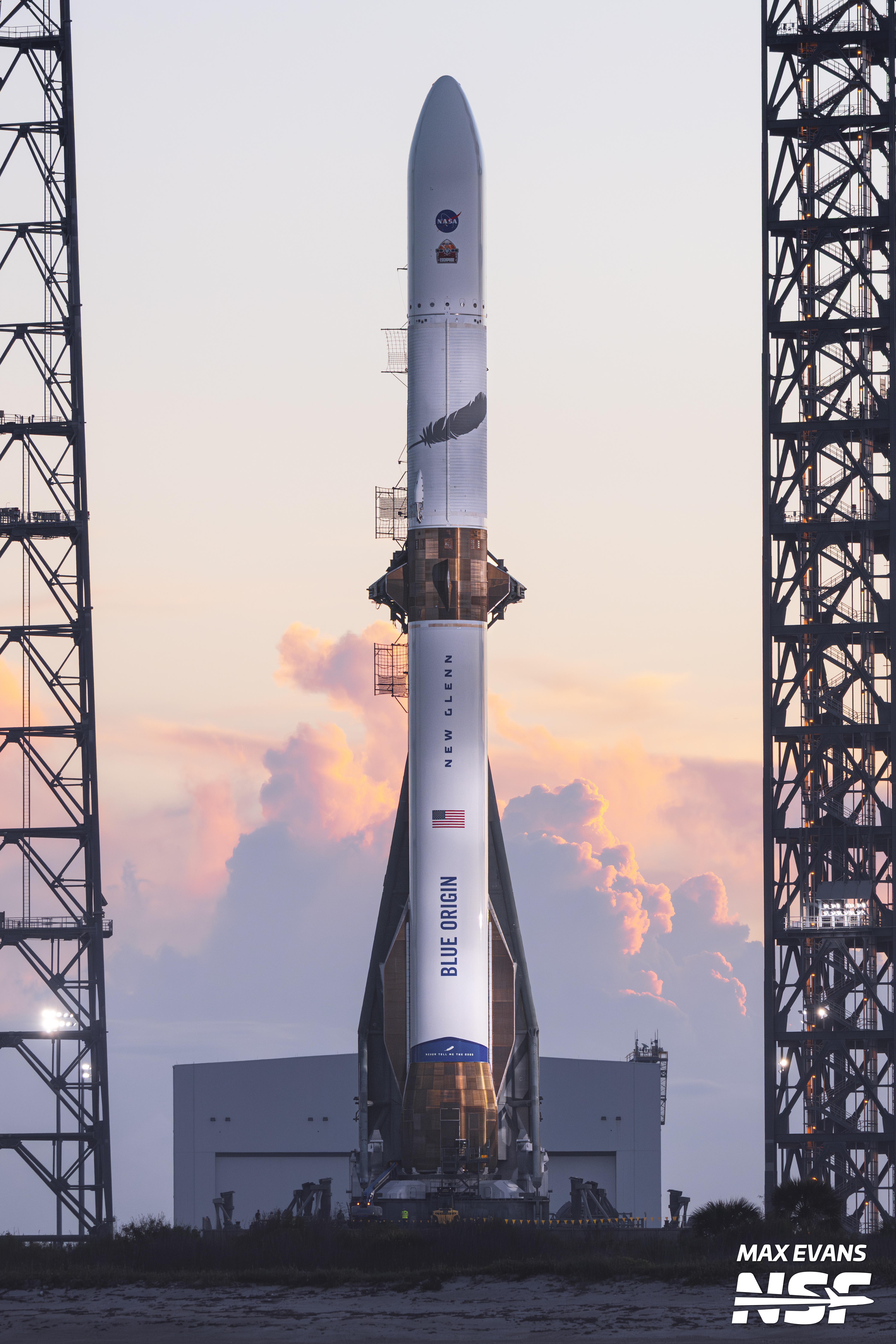 9 novembre, la tentative est ajournée suite à une mauvaise météo sur l'océan Atlantique, un problème de systèmes sol et un navire de croisière se déplaçant dans la zone interdite autour du pad. Avec la FAA, BO planifie un décollage pas avant le 12 entre 19h50 et 21h17 TU, l'agence US interdisant à partir du 10 novembre, les lancements de jour. Le lancement a été coordonné par le programme de services de lancement de la NASA, basé au Centre spatial Kennedy. Le lanceur a été attribuée dans le cadre du contrat de services de lancement VADR (Venture-Class Acquisition of Dedicated and Rideshare) de l'agence. Le contrat global a une valeur maximale de 300 millions de dollars sur une période de cinq ans. Lorsqu'il a été attribué à Blue Origin avec sa fusée New Glenn, la mission ESCAPADE devait être lancée fin 2024 lors du vol inaugural de la fusée. Cependant, comme New Glenn n'était pas prêt à voler à temps, la mission a été reportée au deuxième lancement de la fusée. L'étage GS 2 effectuera deux allumages des moteurs BE-3U avant le déploiement des deux satellites, environ 33 minutes après le décollage. La démonstration technique de Viasat débutera environ cinq minutes après le largage du second satellite ESCAPADE, Gold. 12 novembre, le lanceur New Glenn est prêt au lancement. Cependant, en raison d'une activité solaire très intense et de ses effets potentiels sur le vaisseau spatial ESCAPADE, la NASA reporte le lancement jusqu'à ce que les conditions météorologiques spatiales s'améliorent. Nous évaluons actuellement les possibilités de définir une nouvelle fenêtre de lancement en fonction des prévisions météorologiques et de la disponibilité des sites de lancement.