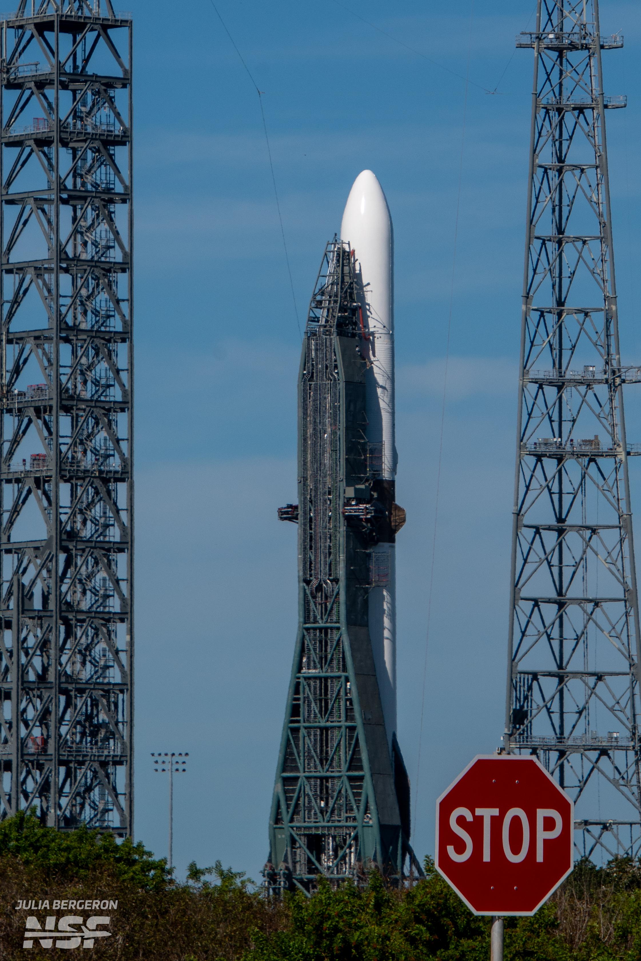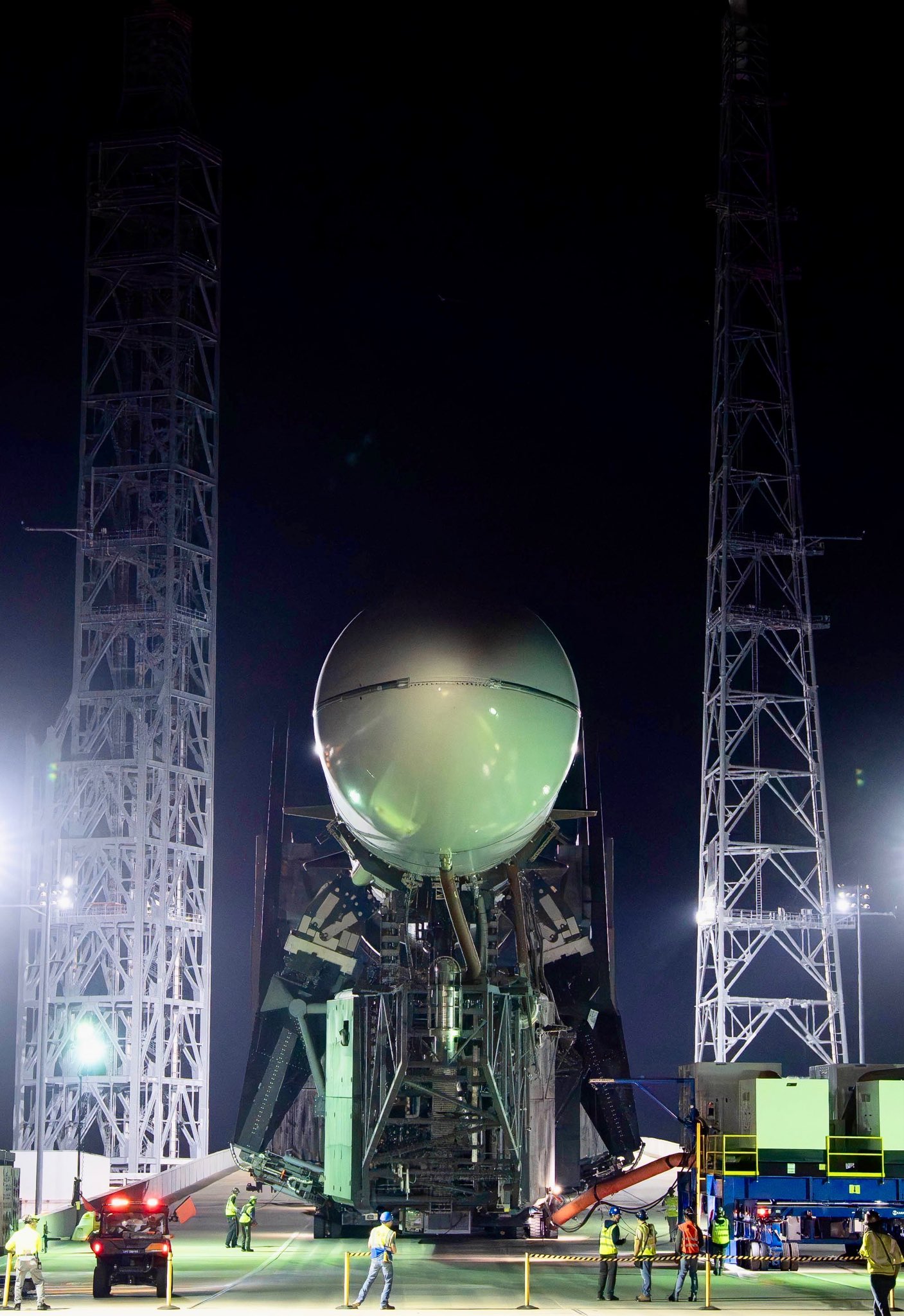 L'étage principal de 57 m de haut, Glenn Stage 1 (GS1), connu sous le nom de « So You're Telling Me There's a Chance » ou GS1-SN001, tentera d'atterrir sur le Landing Platform Vessel 1 (LPV1) de Blue Origin nommé Jacklyn en l'honneur de Jeff. La mère de Bezos. L'étage utilisera 3 de ces 7 moteurs BE-4 et également des ailerons et des propulseurs pour guider son chemin vers Jacklyn , qui se déroulera dans l'Atlantique à des centaines de kilomètres au large des côtes de Floride. 10 janvier, le lanceur NG-1 est sur le pad de tir. La coiffe du New Glenn contient des milliers de signatures d'employés de Blue Origin - un hommage au travail acharné et à la passion pour la mission que nous avons tous ici à Blue.