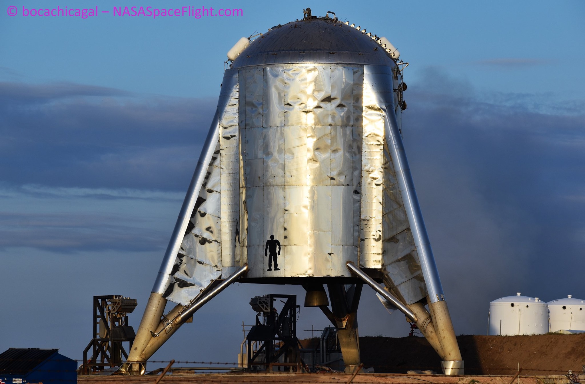 Janvier 2019, le Starshiphopper de test est en assemblage à Boca Chicca. Le véhicule mesure environ 40 mètres. le modèle de vol lui sera plus haut, 55 mètres monté sur l'étage SuperHeavy de 63 mètres. 8 janvier, les 2 paries du "hopper" sont assemblées. Vue artistique du véhicule de test "Starship" en assemblage à Boca Chica lorsqu'il sera complètement terminé. Le vaisseau opérationnel comportera aussi des hublots. Ce "hopper" ou sauterelle réalisera des essais en vol à basse altitude comme le Grasshopper pour le F9. Le "Starhopper" fera ses premiers vols, à raison de 3 par semeine en décollant verticalement jusqu'à une altitude de 500 m pendant 100 secondes avant d'atterrir au sol. Par la suite, les essais se feront une fois par semaine jusqu'à une altitude de 5000 mètres pour une durée allant jusqu'à 6 minutes. Le vaisseau réel quand à lui sera construit dans une zone à environnement contrôlé et expédié en zone de lancement. Janvier 2019, le StarshipHopper est partiellement démonté afin de procéder à l'installation du dôme arrière d'un réservoir dans la structure. Les maquettes de moteurs "Raptor" installés sous le StarshipHopper sont aussi enlevés. Selon Musk, les véritables "Raptor" seront à Mc Gregor. Le 23 janvier, de fortes rafales de vent font tomber la partie haute de la maquette du Starship Hopper en construction. Le dome avant est détruit. Une tente sera construite pour abriter la construction du Hopper.