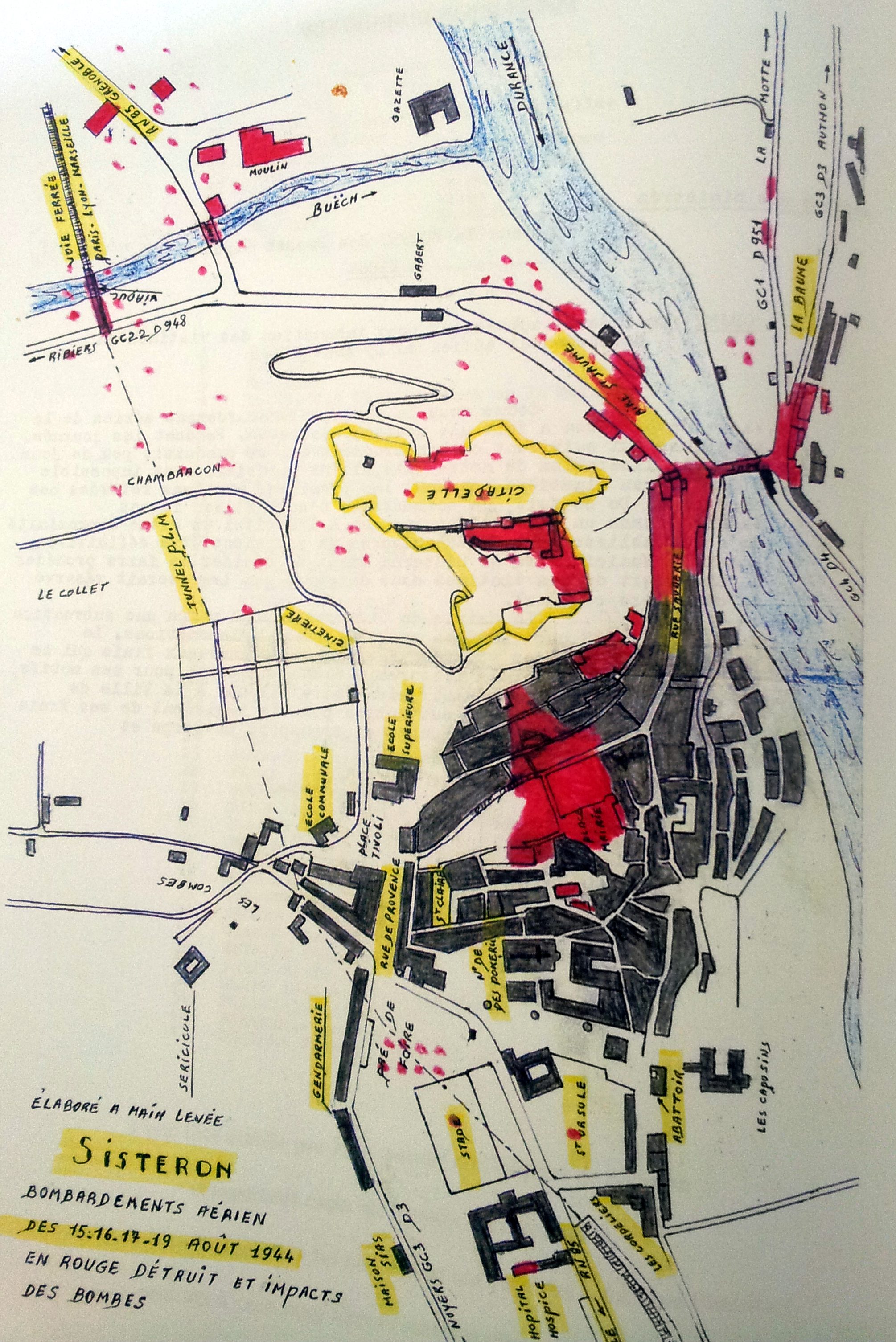 SISTERON, UN INTERET STRATEGIQUE A cette époque, la ville présente un intérêt stratégique certain. La RN 85 qui va de Grenoble à Cannes via Gap, rejointe par la RN75, reliant Grenoble à Sisteron par le col de la Croix Haute passe justement par les rues étroites de Sisteron. La Citadelle sur son rocher surplombe la ville, fermée au nord par la porte du Dauphiné avec ses souterrains et escaliers qui la relie directement. 160 soldats allemands y sont cantonnés équipés de batteries anti-aériennes. La RN85 enjambe le Buech par un pont à 3 arches, avec parallèlement le pont ferroviaire et par le pont de la Baume, la route Napoléon traverse la Durance. 240 BOMBES EN 23 MINUTES ! Dans le ciel, venant du Nord Ouest, 72 bombardiers B26 Marauder du 42e Bomber Wing américains, dont la moitié sont Français survolent la cité de Paul Arène avec pour objectif de couper la retraite à l’ennemi nazi en détruisant les 3 ponts de la ville. Cette opération baptisée « Ducrot » est déployée parallèlement à Arles, Aramon, Avignon, Tarascon, Pont St Esprit et Montfaucon ainsi que sur une soixantaine de batteries côtières Allemandes installées sur la cote. Volant à 4000 mètres d’altitude, les aviateurs ne distinguent presque rien de leur cible. Chaque appareil a dans son ventre 8 bombes de 250 kg d’équivalent de TNT. 36 avions Américains arrivent par la vallée de la Durance pour la 1er et 4e vague et 36 autres Français descendent la vallée du Buech pour la seconde et 3e vague. Ils lâchent leur bombe un peu au hasard. Les premières bombes tombent à 16h20, la toute première serait tombé sur un mariage, mais on n'ignore si il y avait des personnes dessous. . Les accès sont atteints, mais les ponts ne sont pas détruits. Le wing de l'USAAF, forcé à une manœuvre d'évitement après son premier passage se libère des bombes non larguées et plusieurs tombent sur la ville arrosant la place de l’horloge où se trouve la mairie, le centre ville et la Citadelle. Une 3e puis une 4e vague suit avant que l’ensemble de la flotte reparte vers le Sud à 16h40. Au total, en 23 minutes, 240 bombes sont tombées sur la ville. Plan montrant les dégats sur la ville après le bombardement des alliés. Les ponts routiers et le viaduc SNCF sont détruits, comme le moulin bordant le Buech. L'aire St Jaume est partiellement détruite à la sortie Nord de la ville, tout comme la porte du Dauphiné et la moitié de la rue Saunerie, le pont de la Baume et les premières maisons proches. Les bombes ont aussi frappées le quartier de la Coste en bordure de la Citadelle et le centre ville, la place de la mairie. des impacts sont relevés dans le pré du foire, sur le stade, à St Ursule