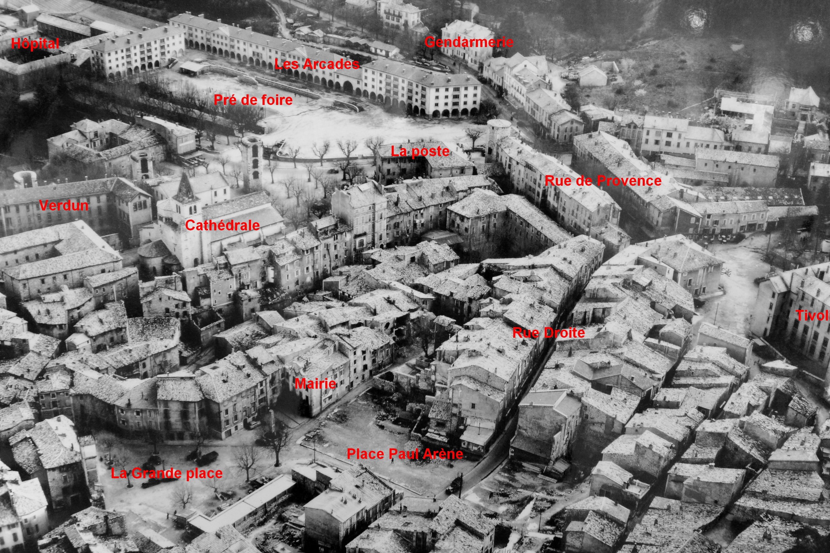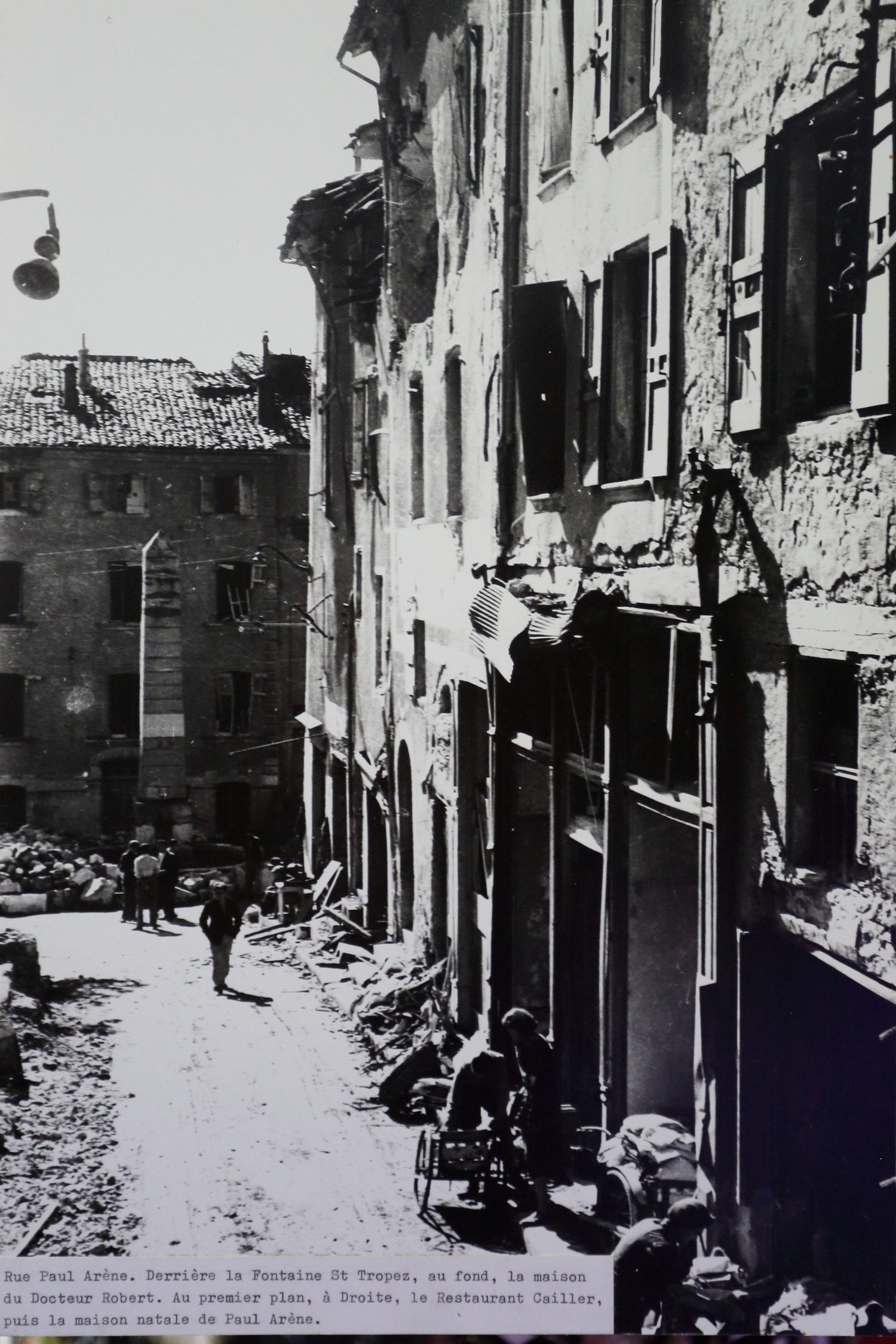 forteresse ont été également détruits. La place de l'Horloge, aujourd'hui, place du Dr Robert La port du Dauphiné, elle se sera jamais reconstruite. Le pont de la Baume et le haut de la rue Saunerie. Rue Paul Arène, qui deviendra Avenue Paul Arène. Toutes les maisons de chaque coté ont été détruites par les bombes. A gauche, le faontaine St tropez avec en fond la maison du Dr Robert, decant le restaurant Gailler et la maison de Paul Arène. Au centre, la maison Beck (l'agence de voyage et le salon de thé Canteperdrix) avec en fond , la rue Droite. maison Samuel A droite, vue de la maison de Paul Arène.