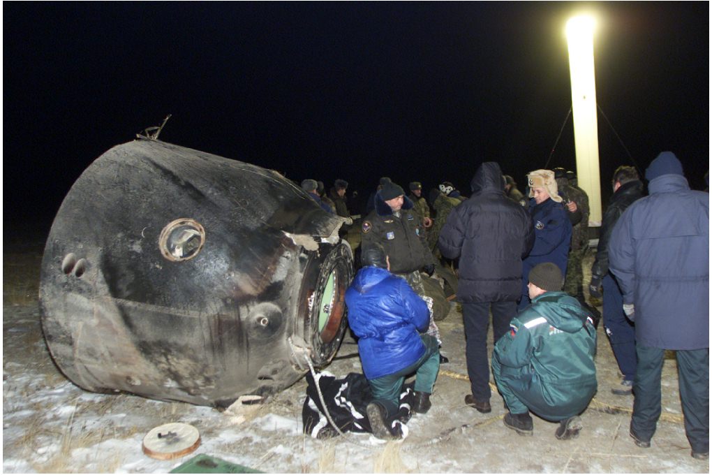A son bord trois cosmonautes le Russe Yuri Gidzenko, l' Italien Roberto Vettori