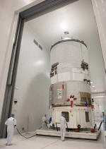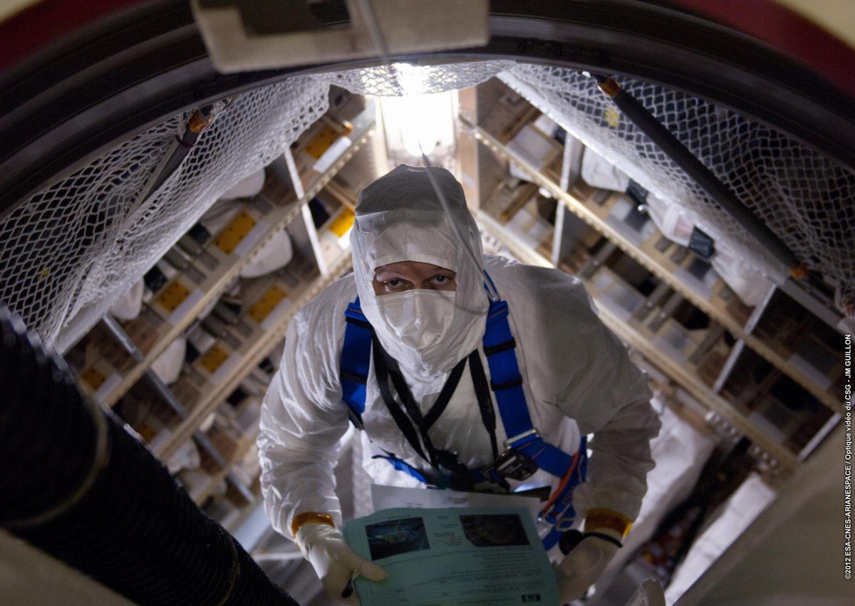 Photo: CNES/Frédéric Maligne 27 février, mise en place de la coiffe sur le lanceur. Les techniciens ont chargé le compartiment pressurisé de 600 kg d'équipements pour la station en 2 jours depuis le 14 février, avec notamment des paquets pour les équipages et une pompe de 50 kg pour le système de traitement des urines (Fluids Control Pump Assembly) placé dans un sac spécial de grande taille le M-01 monté sur un plaque d'adaptation devant les racks de stockage. L'installation de ces équipements alors que l'ATV est en position verticale a nécessiter un équipement spécial. Une maquette de l'ATV a été construite en Suisse pour simuler cette opération. L'écoutille a été ferme le 16 février, puis le vaisseau a été préparé pour le lancement, les protections thermiques vérifiées et les couvertures de sécurité enlevées. Le lanceur sera amené en ZL3 le 7 mars. Le lancement reste prévu pour le 9 mars à 10h 05 TU. Le cargo ATV s'amarrera à ISS le 18. ATV CC Toulouse, pour l'équipe CNES qui