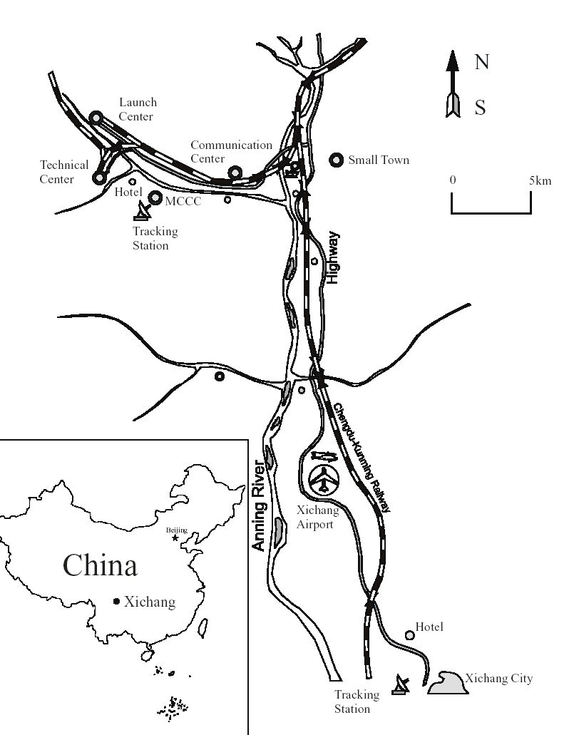 LES INSTALLATIONS DE LANCEMENT XICHANG La seconde base est celle de Xichang situé plus au Sud du pays par 28,25°N et 102°E, sur la province de Sichuan. Elle sert aux lancements en GTO avec les lanceurs CZ 2E et les CZ 3. La base restée longtemps mystérieuse a "entrouverte" ses portes en octobre 1996 à l'occasion du 47eme congrée de l'IAF (fédération internationale d'astronautique) qui se tenait à Pékin. Près de 1000 personnes de 70 pays sont venus assister à quelques 900 communications. Le congrée initialement prévu en 1989 a été annulé en dernière minute suite aux évènements de Tianan Men. Le site a été construit dans les montagnes à 1800 m d'altitude entre 1978 et 83. Il est à 65 km au Nord de Xichang. On y accède par la route nationale qui passe devant l'aéroport (le 10eme du pays). Les satellites arrivent par cet aéroport tandis que les éléments des fusées arrivent par rail traversant 2000 tunnels entre Chengdu et Kuming depuis les usines de Shangai ou Pékin. Le centre de contrôle est à 6 km des pads.