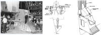 Les interface sol du LUT avec le Crawler et le pad. Interface 1,2,3,4,5 et 6. La plateforme est positionnée mécaniquement sur six piliers de 6,7 m de haut sur le pad ou le parking d'érection, appelés "Mount Mechanisms". Ils sont situés tout autour de la plateforme, 4 sont aux 4 coins de la plateforme et 2 autres sous le montant G14 qui supporte la tour ombilicale. Ils doivent assurer le maintien du LUT lors des ouragans et des mouvements de charges selon la température. Chaque pilier est numéroté, de 1 à 6, en partant du coin au N-E, side 3 et 4, le coté 4, 1 et 2. Ils sont de 3 types, avec 2 diagonales (pilier 2), une diagonale (pilier 1, 3 et 5) et fixe (piliers 4 et 6). Les diagonales assurent un réglage très précis de l'alignement de la plateforme. Les piliers de types 2 assurent un alignement dans une seule direction et ce de type 3 selon les 2 directions. Le pilier "2" du LUT parksite" près du VAB, du type 1 avec 2 diagonales. Le pilier "3", à l'angle des cotés 1 (Sud) et 4 (Est) de type 2, avec une diagonale. A gauche, un des 4 autres pieds qui soutiennent la tour MSS sur le pad. Des " pointes " de 22 cm de diamètre au maximum fixées sur le ML permettent un alignement parfait. La fixation est réalisée par 12 boulons attachant la plateforme aux piliers. Sur le pad 39A, les 6 pieds soutenant le LUT ont d'bord été peint en jaune pour l'opération AS500F et le vol Apollo 4. Depuis, ils ont été reprint en gris. Sur le pad 39B, ils ont jaune uniquement pour pour Apollo 10. Sur le parking des ML, près du VAB, les piliers des 2 places sont restés de couleur jaune tout au long du programme lunaire et jusqu'au début des années 80. Le réglage de la colonne et des diagonales sont de 91 cm et 45 cm. Dans le VAB, on retrouve les mêmes 6 piliers mais sous un design plus léger, les contraintes n'étant pas les mêmes en intérieur. Ces piliers là sont de 3 types aussi, un fixe (type 4), 2 avec une diagonale (type 5) et 3 fixes réglables (type 6). Le pilier fixe de type 4 est aussi plus court (6,4 mètres). Interface 7,8,9 et 10 Quatre interfaces permettent au crawler transporter de soulever la plateforme. Elles sont situées sur les montants G 3, G 4, G 9 et G 10. Les deux points sur le coté 1 sont situé exactement sous l'axe du lanceur. Interface 11,12,13 et 14 Quatre piliers extensibles sont utilisés pour absorber le poids additionnel de carburant et la charge dynamique au moment du décollage. Ces piliers sont essentiellement des vérins hydrauliques réglés en conséquence. Ils sont situés sous les montants G4 et G 10 et au bout des montants G 15 et G 18, encadrant pratiqument la fosse des moteurs du lanceur. Dans les premiers projets, les concepteurs avaient imaginé que ces colonnes soient enfouies dans le sol et télescopiques. Les 8 piliers de soutien du Saturn 5 vue dans un champs de la zone industrielle du KSC dans les années 80-90 avec le reste du LUT 1 et la trace au sol sur le pad où se fixaient les piliers extensibles.