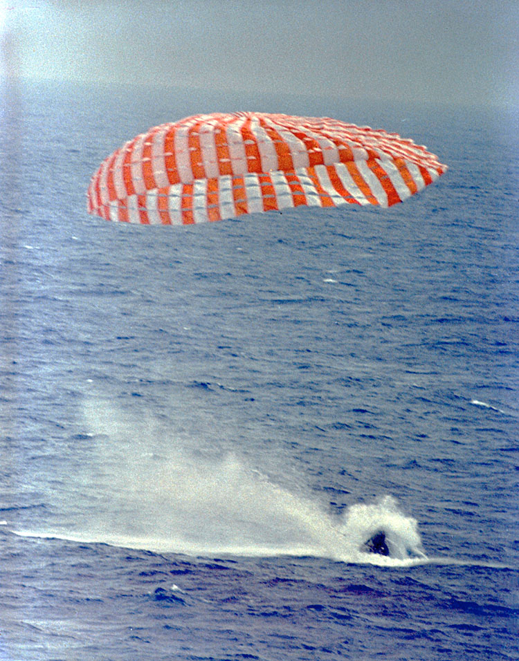 perplexité générale : Aidé par son ordinateur de bord, GT 9 amerrit le 6 juin par 27° 52 mn N et 75° 0,4 mn O à 38 km du point prévu réalisant le meilleur amerrissage de tout le programme en touchant l'océan à moins de 2,5 kilomètres de l'objectif fixé. L' équipage reste 52 mn dans leur cabine en attendant la récupération par le USS Wasp. Comme pour GT6, les astronautes restent dans leur cabine jusqu'à son hissage sur le porte-avion. Une nouvelle méthode de simulation est mis en oeuvre au sol. Pour simuler les EVA, les astronautes s'entraînaient dans un avion de la NASA le "Vomit jet", un KC 135 qui réalise des paraboles dans le ciel pour 20 secondes d'apesanteur. Désormais, une piscine permettra de simuler plus précisément cet état de non gravité. Dans un bassin seront immergés les vaisseaux Gemini et Agena et l'astronaute pourra comme lors de sa véritable mission apprendre les gestes et mieux travailler sa sortie. Une fois sur Terre, Cernan se plongera en piscine afin de simuler sa propre sortie. L'analyse des photos prises en orbite ont élucidé la cause de la non ouverture de la coiffe de la cible ATDA. La coiffe a été fabriqué par Douglas Aircraft, l'étage par Lockheed et les techniciens du Cap ont été entrainé pour l'installer. L'ATDA a été amené d'un seul tenant par Mc Donnell et leurs techniciens ont installé la coiffe eux même. Utilisant leur propre procédure, ils ont mis les lanières de façon incorrecte et l'ont attaché sur place alors qu'ils ne devait pas le faire. Le superviseur de Lockheed a été appelé ailleurs et ses instructions verbales pour terminer le travail n'ont pas été bien comprises. |