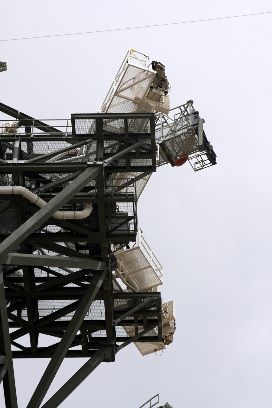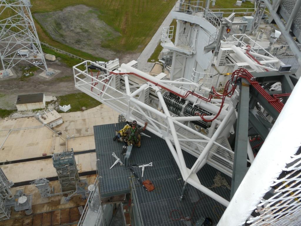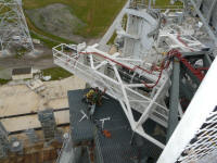 Détail du système d'accroche du VSS (photos NSF) La plateforme d'accès au premier étage FSAM Access, monté sur la tour RSS pour accéder au "spacer" (contrôle de l'avionique et de la mise en place du système ECS). Le rapport de la commission augustine sera remis à la Maison Blanche fin octobre, juste après l'envol d'Ares 1X dont l'issue déterminera l'avenir du programme Constellation. Prévu pour fin septembre, le rapport doit optimiser les différentes options qui seront présenté au président Obama concernant l'exploration spatiale américaine. Dans l'intervalle, la Maison Blanche a déjà indiqué qu'elle allait rétablir 670 millions de dollars sur les 3,96 milliards qui avaient été retirés du budget prévisionnel en juin. Le président serait prêt aussi à approuver l'augmentation du budget de la NASA pour les vols habités. Avec ce rapport semble se jouer l'avenir des vols habités US. La NASA devra choisir entre maintenir la flotte des Shuttle au delà de 2010, l'avenir d'ISS après 2020 et les futurs programmes de conquête de la lune et Mars. Le maintien du programme Constellation permettra de protéger l'emploi dans le secteur spatial et ainsi stabiliser l'économie spatiale. 18 octobre, le rollout d'Ares 1X prévu initialement pour le 19 est repoussé au 20 à minuit, heure locale. Une fuite a été détecté sur le système hydraulique sur le premier étage qui a été remplacé. De plus, le CT 2 prévu pour le transport jusqu'au pas de tir avait un problème de roulement qui sera résolu pour le 20. Le lancement reste prévu pour le 27 ou le 28 octobre.
