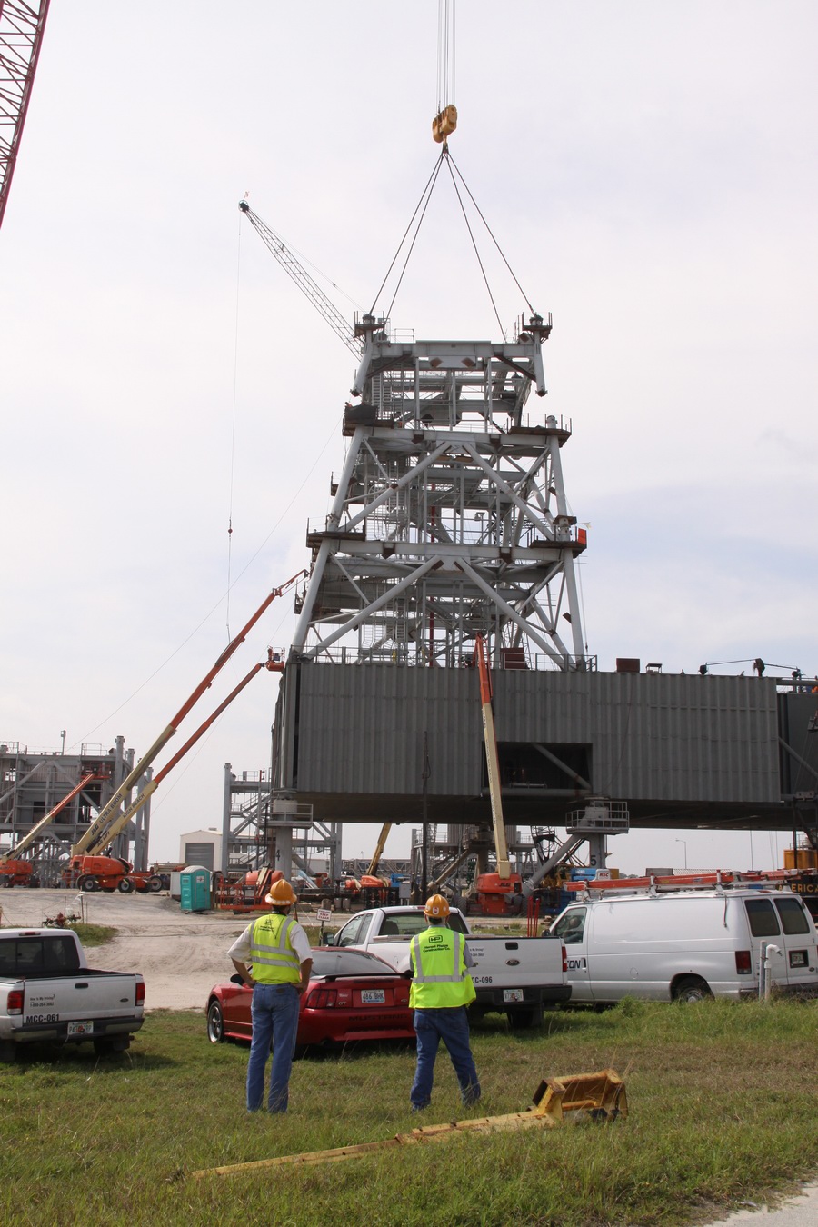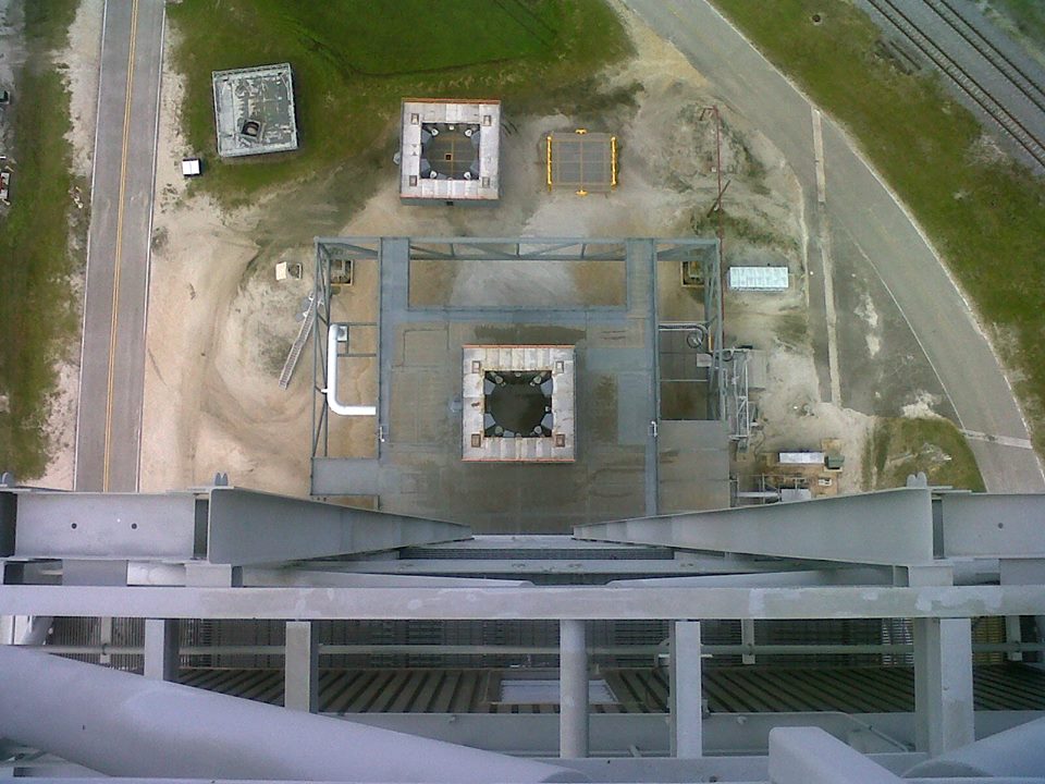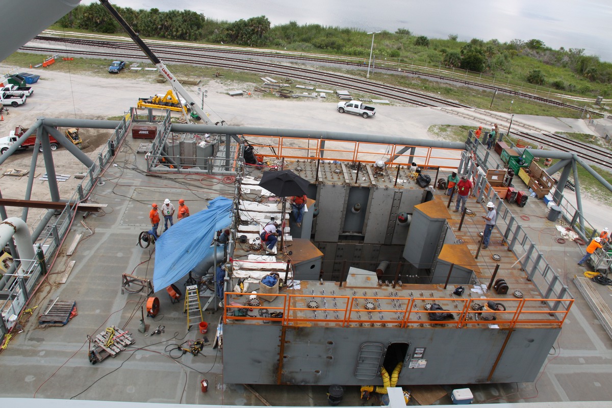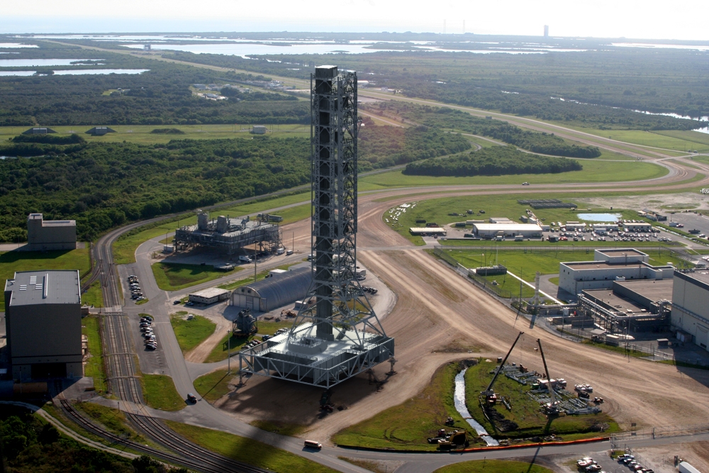 supérieur) et 285 (module de service Orion). C'est Hensel Phelps d'Orlando qui en assurera la construction grâce à un contrat avec la NASA passé en mai 2008 pour un montant de 29 897 000 $. Ivey Construction fait partie des équipes de Hensel Phelps pour la construction du ML. Il assurera la fabrication des 1300 tonnes de structures en acier de cette tour de 118,5 m de hauteur au sol avant de les assembler à l'aide d'une grue. Chaque section qui pèse entre 65 et 180 tonnes est complète et équipée d'escaliers, cage d'escaliers, barrières, salles électriques, et cage d'ascenseur. Iveys Construction avait réalisé les tours du LC 41 des Titan, le VIB du SLC 41 pour les Atlas, la rénovation des tours du SLC 36, l'installation des grues 350 tonnes dans le VAB, le hangar SSME PF, les tours paratonnerre du LC39B, le SLC3 de Vandenberg pour les Atlas 5 entres autres.
