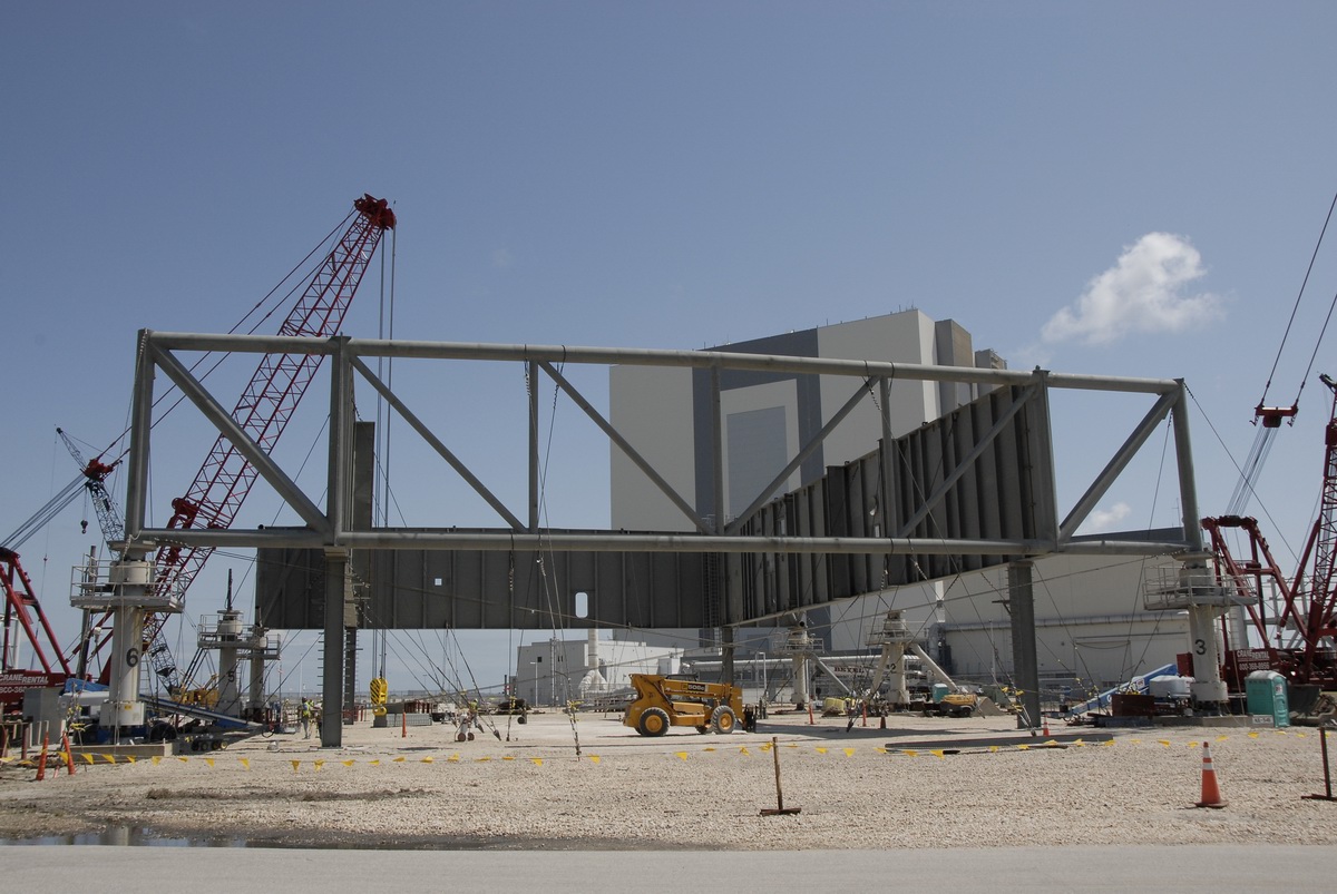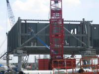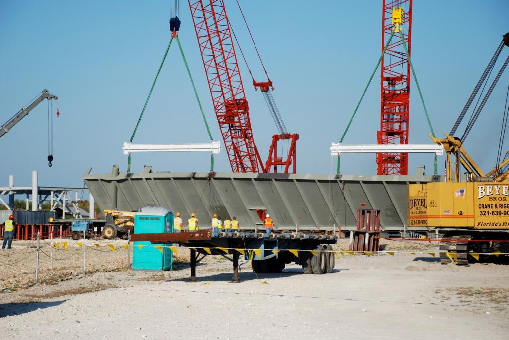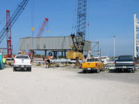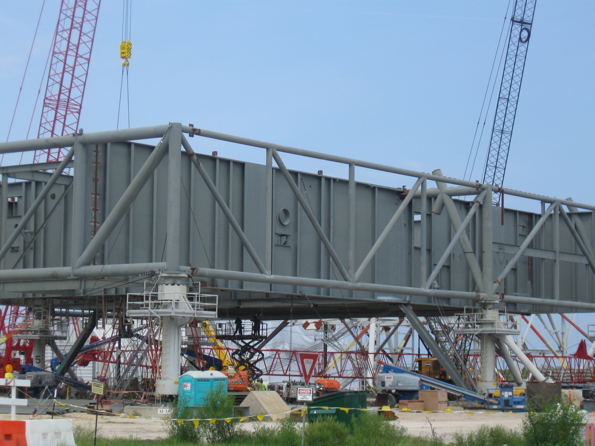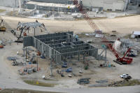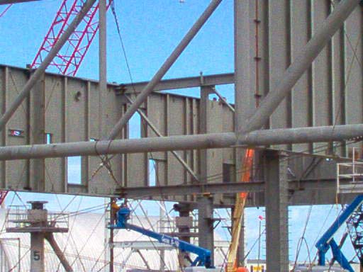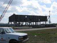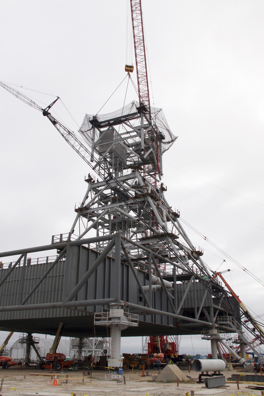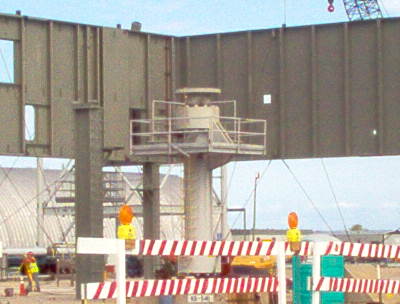 Les plaques d'acier sont encore au sol prête â être relevées. Un élément de la tour ombilicale.