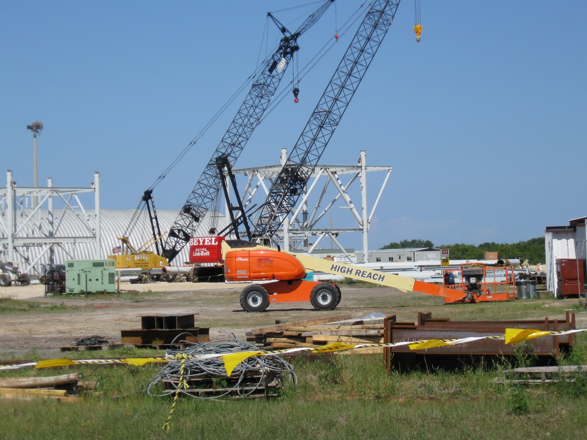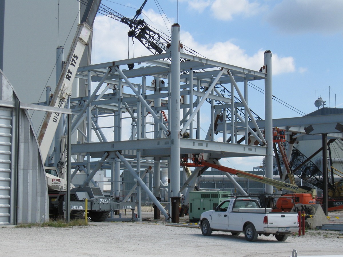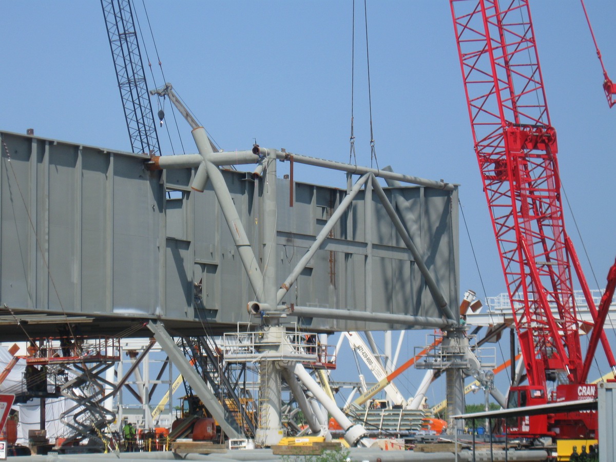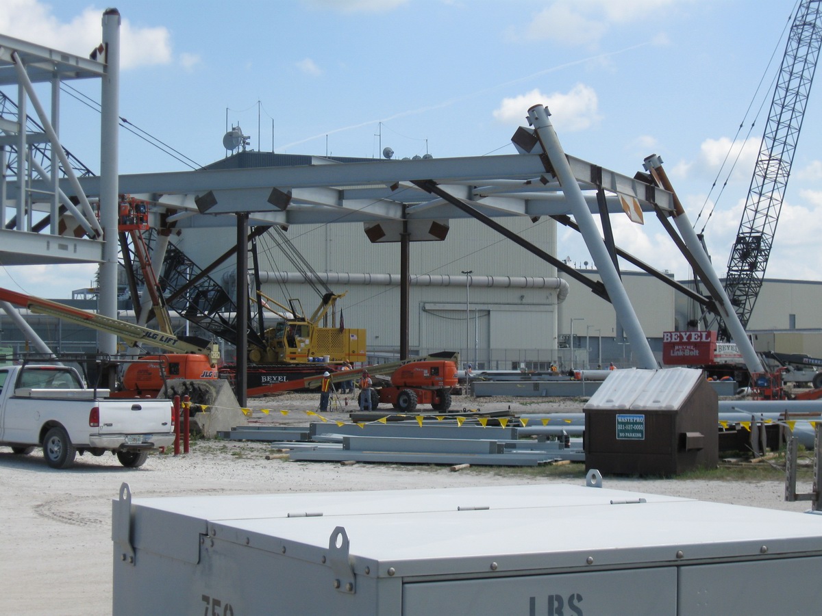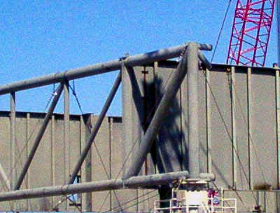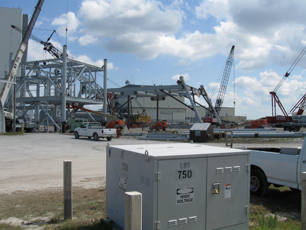 Les plaques d'acier sont encore au sol prête â être relevées. Un élément de la tour ombilicale.