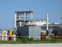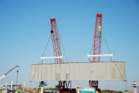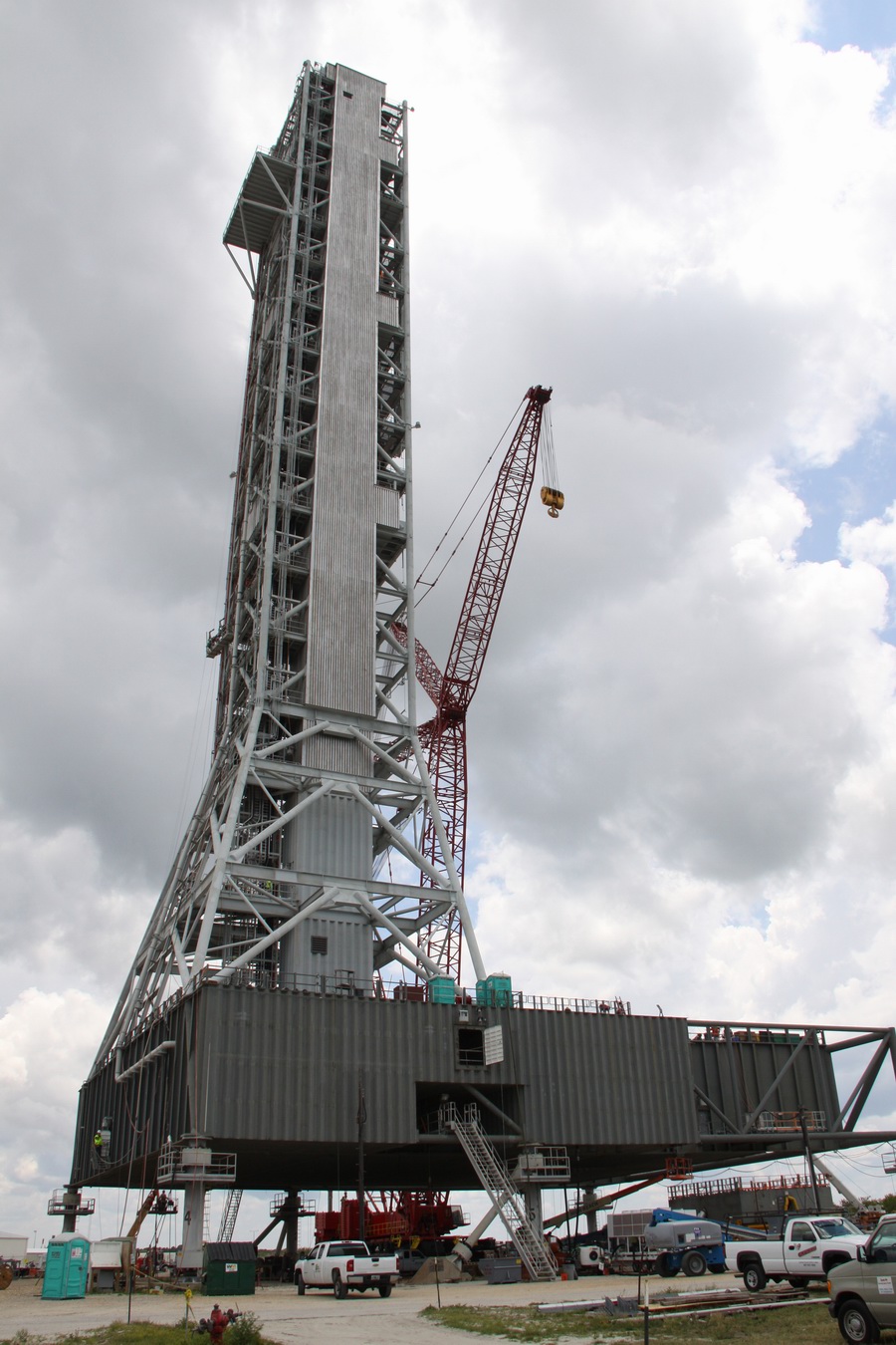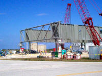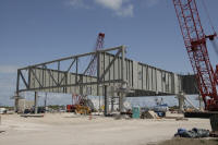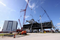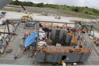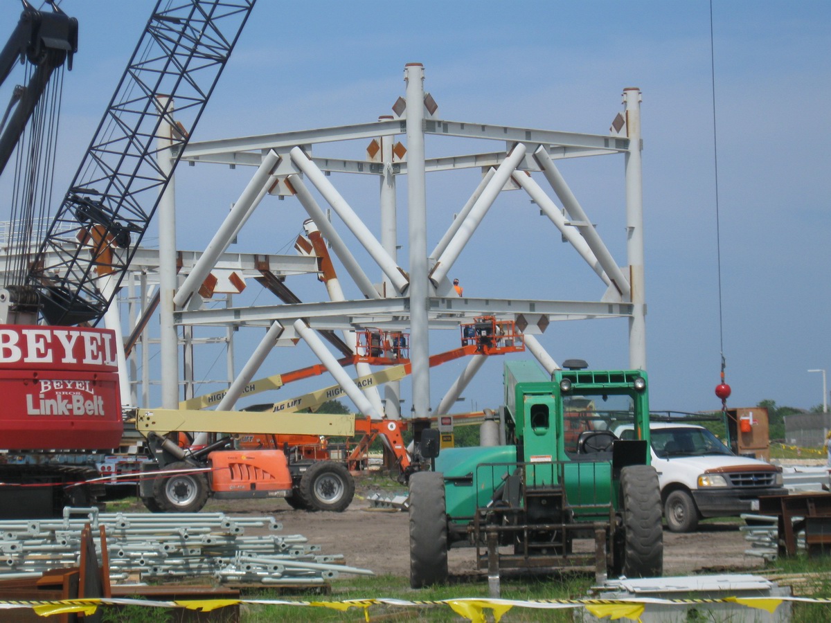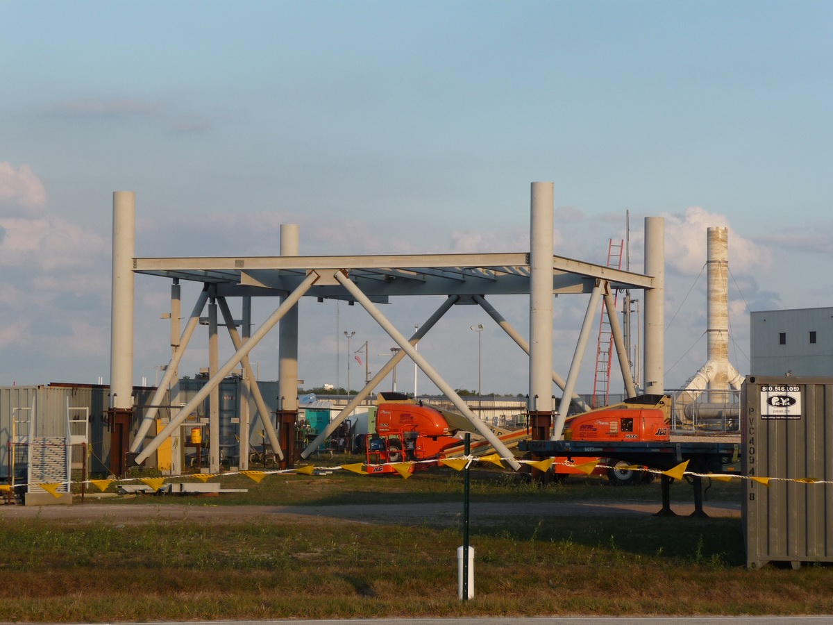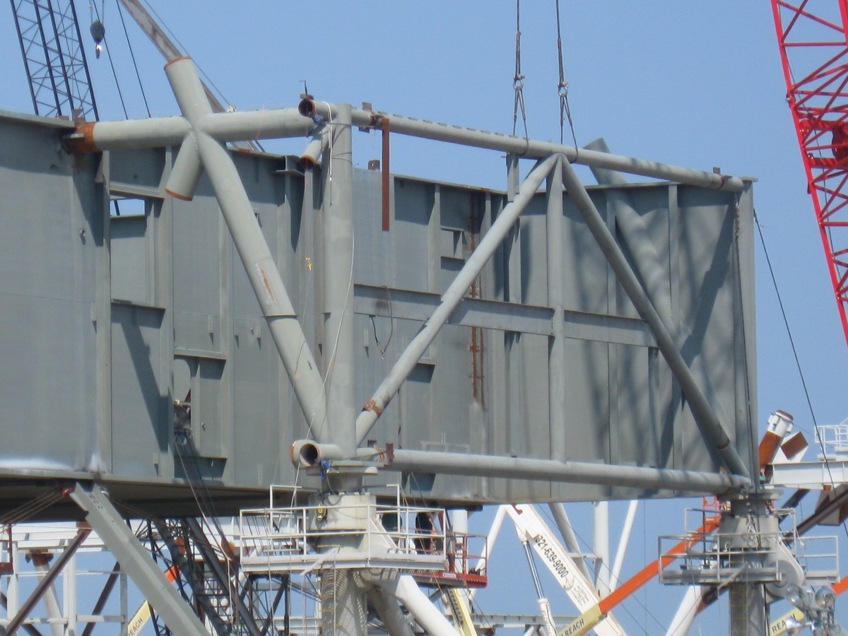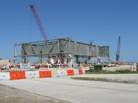 Les plaques d'acier sont encore au sol prête â être relevées. Un élément de la tour ombilicale.