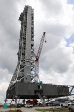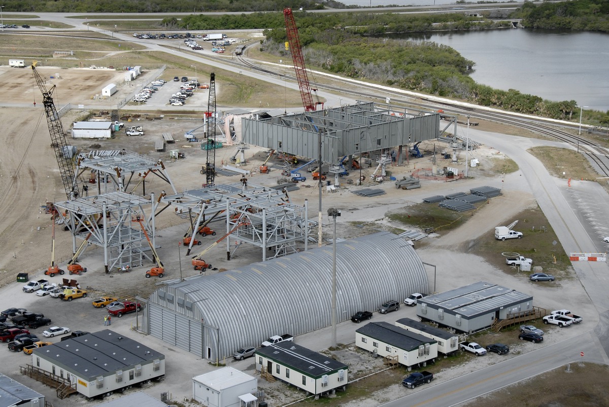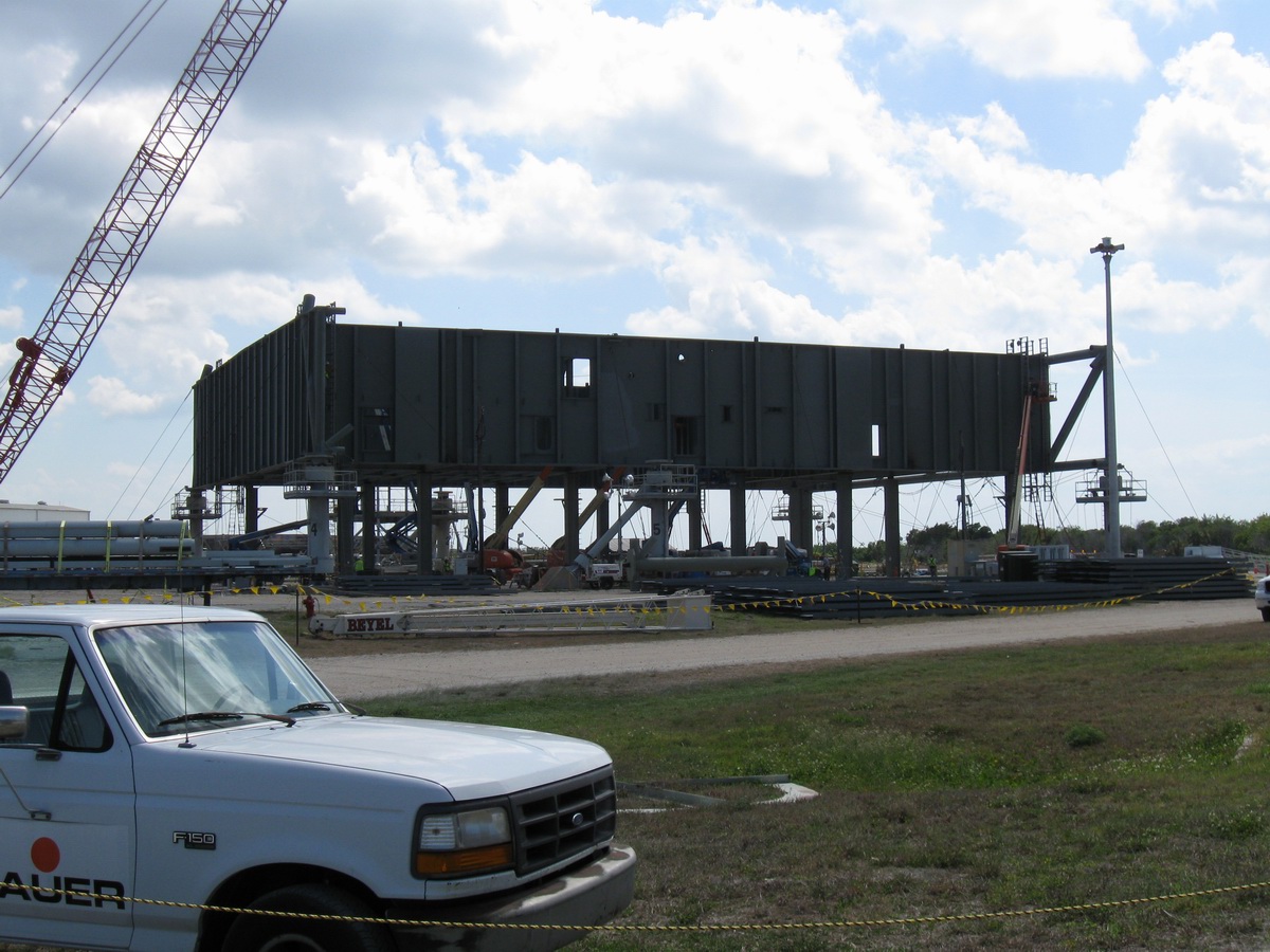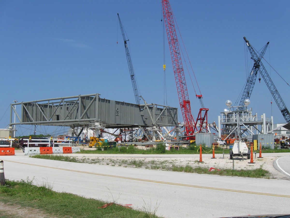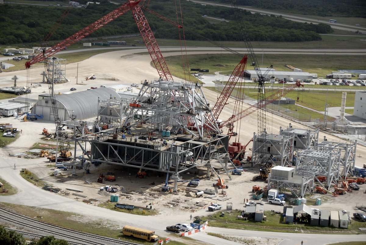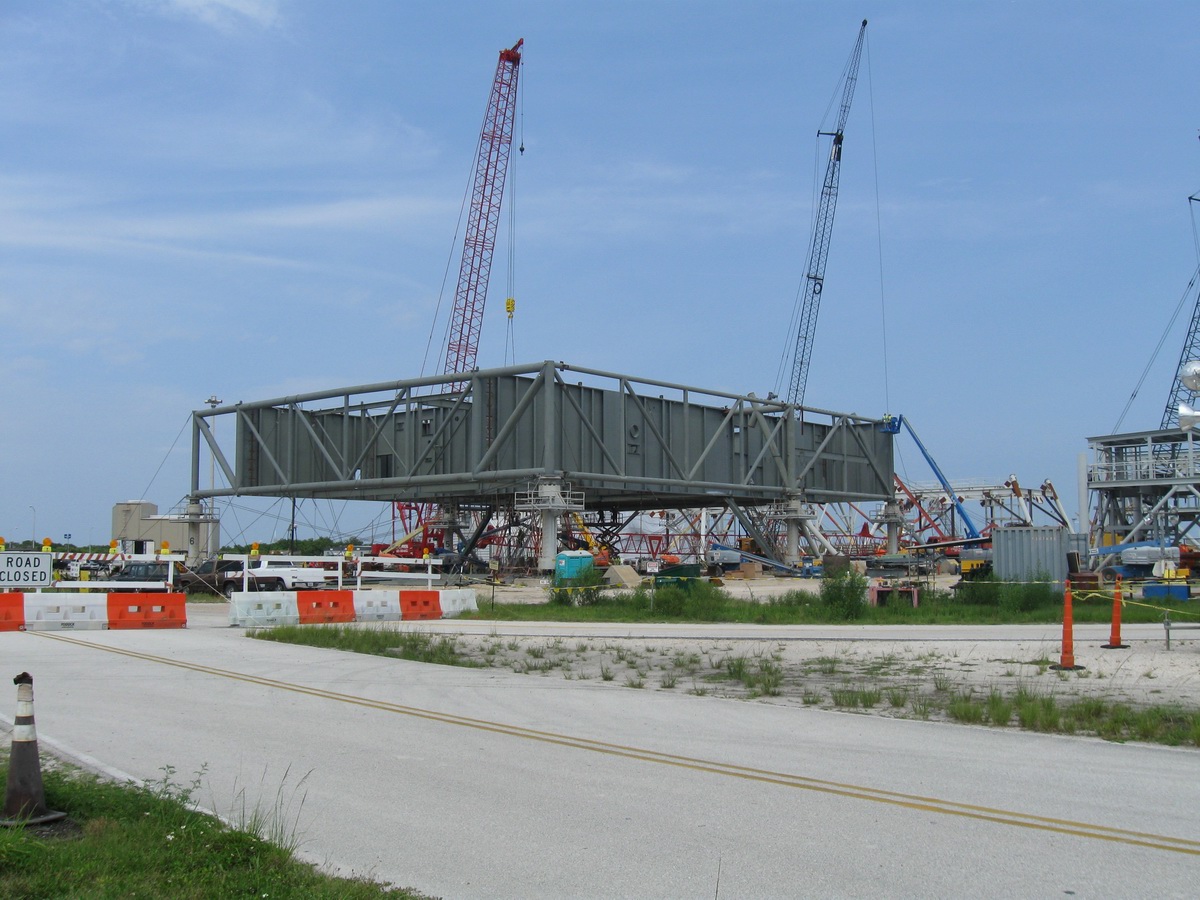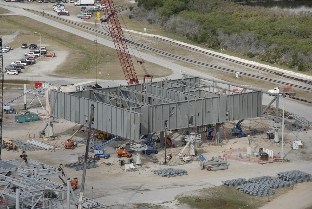 Mise en place du montant intérieur T6 (mars 2009) Travaux du nouveau ML Ares1 avec l'assemblage de la tour ombilicale. A noter la salle des machines pour les ascenseur et le toit déjà en place Avril 2009 Mai 2009 Vue du chantier de construction du ML Ares 1 le 14 mai 2009. Les montants intérieurs G8 et G10 ainsi que les G9 et 11 destinés à supporter Ares sont en place. 18 mai 2009 Juin, la pièce extérieure de la structure porteuse T6 est ajoutée sur le coté Est de la plateforme (side 4). Une nouvelle section de la tour a été monté en moins de 6 heures. Mise en place de T1A et T1B sur le coté Est. Mise en place de T7A Vue du chantier septembre 2009 Fin septembre, mise en place des premiers éléments de la tour ombilicale sur le ML. Fin janvier 2010, la construction de la structure métallique du ML Ares 1 se termine avec la mise en place de la 16 eme et dernière section. Haute de 121 m, elle et plus petite que les LUT rouge Apollo et plus grande que la FSS des pads 39. 200 ouvriers de Hensel Phelp d'Orlando ont participé à sa construction. D'ici la fin juillet, la structure basique sera achevé. Par la suite en 2011, le ML sera équipé des systèmes sol; ombilicaux, lignes d'alimentation en gaz, fluides électricité et ergols. Le ML devrait être terminé début 2014, éventuellement en 2013 pour le vol Ares 1Y "prime". L'administration US devrait se prononcer sur l'avenir du programme Ares 1 en février. Un rapport préliminaire recommande en effet d'utiliser des lanceurs commerciaux pour Orion et de fabriquer un lanceur lourd pour la lune et Mars. 1er février, le programme Constellation est annulé par l'administration américaine. Le développement des lanceurs Ares 1 et 5 et la cabine Orion suspendu. Le ML d'Ares 1 sera probablement terminé mais modifié pour le futur lanceur "lourd" que devrait développer la NASA. Avril, le 3eme segment du Launch Mount du ML d'Ares 1 est hissé sur la plateforme. Dans le nouveau plan spatial d'Obama, le ML servira de base pour un futur lanceur. 2 Launch Mount sont construit. Le 20 mai a lieu le montage du premier "launch mount" sur la plateforme du ML. Le "launch mount" devait supporter le lanceur solide Ares 1, basé sur le SRB du Shuttle. Juin, la construction du ML se termine au KSC. La nouvelle tour, haute de 108 m sera utilisée pour le prochain programme spatial US. La plateforme de même dimensions que le MLP du Shuttle est néanmoins plus légère afin de satisfaire au cahier des charges du Crawler transporter. Juillet, la NASA prévoit de déplacer le ML Ares 1 de son site de construction (emplacement Ouest) vers le site de maintenance des MLP (emplacement Est) juste à coté à la fin du mois d'août au cours d'une opération s'étendant sur 5 jours. Le MLP 1, qui a servit pour Ares 1X va être rentrer dans la baie 2 du VAB par le CT 2. Le CT 1 lui soulèvera le ML Ares trois fois et pesé avant d'être déplacer vers le site Ouest. Le CT 1 va être équipé de capteur de pesé pour cette opération. 1er octobre, soulevé par le Crawler 2, le ML Ares 1 est déplacé vers le site de maintenance Est à la place du MLP 1, déplacé lui quelques semaines auparavant dans la baie 2 du VAB. Sur ce nouveau site, le ML sera équipé en connections fluides, électriques et pneumatiques. Prévu pour le lanceur Ares 1, le ML restera à disposition pour un nouveau lanceur dans le cadre de la politique spatiale future des USA examiné au congrès. Le déplacement prévu pour le mois d'août a été repoussé suite à une panne des circuits électrique des crawler consécutif à un choc électrique lors d'un orage. Après révision, les deux engins ont repris du service, le CT 1 amenant Discovery sur son pad et le ML sur son site de maintenance. Le MLP 1 revient sur le site Ouest le 13 octobre. Les 2 Launch Mount du ML Ares 1 en octobre 2015, devant le MLP 1