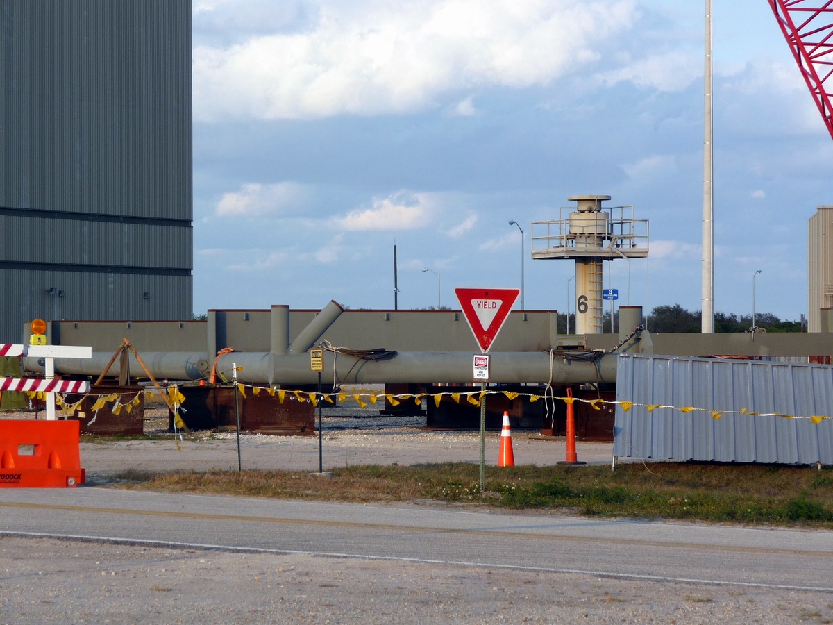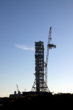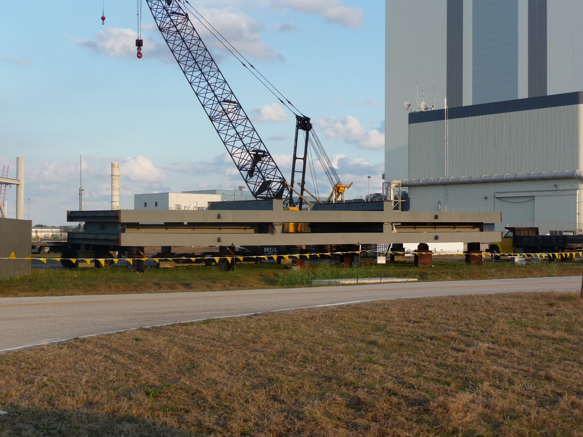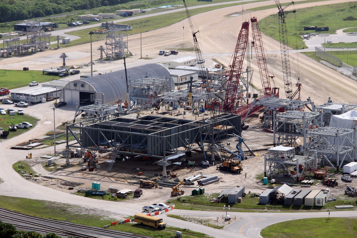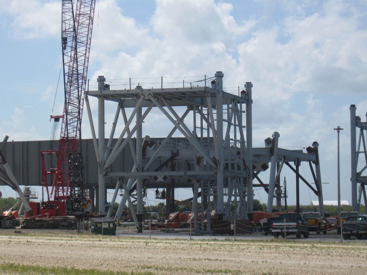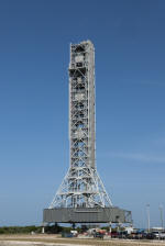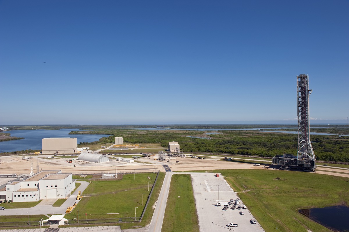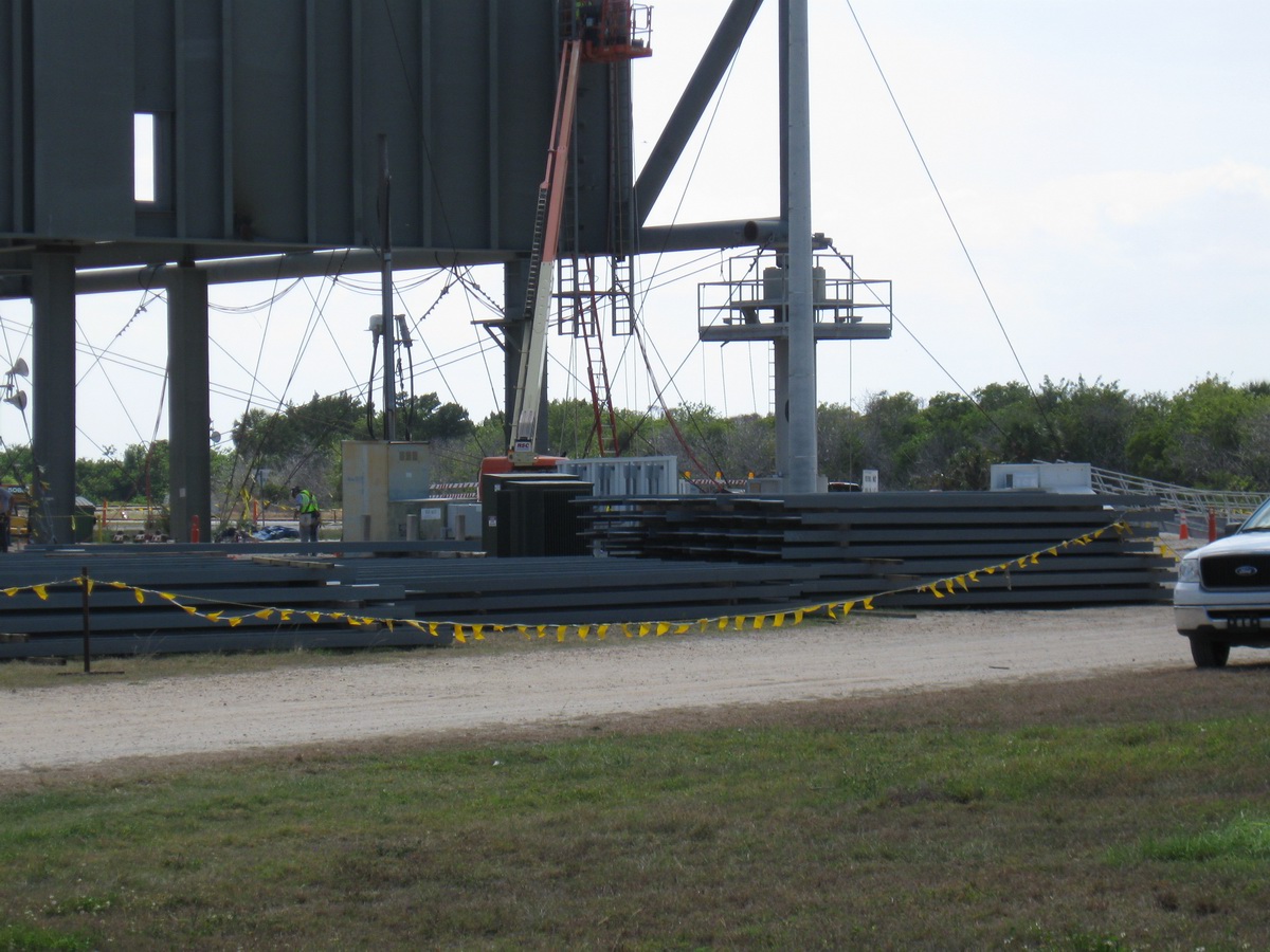 Mise en place du montant intérieur T6 (mars 2009) Travaux du nouveau ML Ares1 avec l'assemblage de la tour ombilicale. A noter la salle des machines pour les ascenseur et le toit déjà en place Avril 2009 Mai 2009 Vue du chantier de construction du ML Ares 1 le 14 mai 2009. Les montants intérieurs G8 et G10 ainsi que les G9 et 11 destinés à supporter Ares sont en place. 18 mai 2009 Juin, la pièce extérieure de la structure porteuse T6 est ajoutée sur le coté Est de la plateforme (side 4). Une nouvelle section de la tour a été monté en moins de 6 heures. Mise en place de T1A et T1B sur le coté Est. Mise en place de T7A Vue du chantier septembre 2009 Fin septembre, mise en place des premiers éléments de la tour ombilicale sur le ML. Fin janvier 2010, la construction de la structure métallique du ML Ares 1 se termine avec la mise en place de la 16 eme et dernière section. Haute de 121 m, elle et plus petite que les LUT rouge Apollo et plus grande que la FSS des pads 39. 200 ouvriers de Hensel Phelp d'Orlando ont participé à sa construction. D'ici la fin juillet, la structure basique sera achevé. Par la suite en 2011, le ML sera équipé des systèmes sol; ombilicaux, lignes d'alimentation en gaz, fluides électricité et ergols. Le ML devrait être terminé début 2014, éventuellement en 2013 pour le vol Ares 1Y "prime". L'administration US devrait se prononcer sur l'avenir du programme Ares 1 en février. Un rapport préliminaire recommande en effet d'utiliser des lanceurs commerciaux pour Orion et de fabriquer un lanceur lourd pour la lune et Mars. 1er février, le programme Constellation est annulé par l'administration américaine. Le développement des lanceurs Ares 1 et 5 et la cabine Orion suspendu. Le ML d'Ares 1 sera probablement terminé mais modifié pour le futur lanceur "lourd" que devrait développer la NASA. Avril, le 3eme segment du Launch Mount du ML d'Ares 1 est hissé sur la plateforme. Dans le nouveau plan spatial d'Obama, le ML servira de base pour un futur lanceur. 2 Launch Mount sont construit. Le 20 mai a lieu le montage du premier "launch mount" sur la plateforme du ML. Le "launch mount" devait supporter le lanceur solide Ares 1, basé sur le SRB du Shuttle. Juin, la construction du ML se termine au KSC. La nouvelle tour, haute de 108 m sera utilisée pour le prochain programme spatial US. La plateforme de même dimensions que le MLP du Shuttle est néanmoins plus légère afin de satisfaire au cahier des charges du Crawler transporter. Juillet, la NASA prévoit de déplacer le ML Ares 1 de son site de construction (emplacement Ouest) vers le site de maintenance des MLP (emplacement Est) juste à coté à la fin du mois d'août au cours d'une opération s'étendant sur 5 jours. Le MLP 1, qui a servit pour Ares 1X va être rentrer dans la baie 2 du VAB par le CT 2. Le CT 1 lui soulèvera le ML Ares trois fois et pesé avant d'être déplacer vers le site Ouest. Le CT 1 va être équipé de capteur de pesé pour cette opération. 1er octobre, soulevé par le Crawler 2, le ML Ares 1 est déplacé vers le site de maintenance Est à la place du MLP 1, déplacé lui quelques semaines auparavant dans la baie 2 du VAB. Sur ce nouveau site, le ML sera équipé en connections fluides, électriques et pneumatiques. Prévu pour le lanceur Ares 1, le ML restera à disposition pour un nouveau lanceur dans le cadre de la politique spatiale future des USA examiné au congrès. Le déplacement prévu pour le mois d'août a été repoussé suite à une panne des circuits électrique des crawler consécutif à un choc électrique lors d'un orage. Après révision, les deux engins ont repris du service, le CT 1 amenant Discovery sur son pad et le ML sur son site de maintenance. Le MLP 1 revient sur le site Ouest le 13 octobre. Les 2 Launch Mount du ML Ares 1 en octobre 2015, devant le MLP 1
