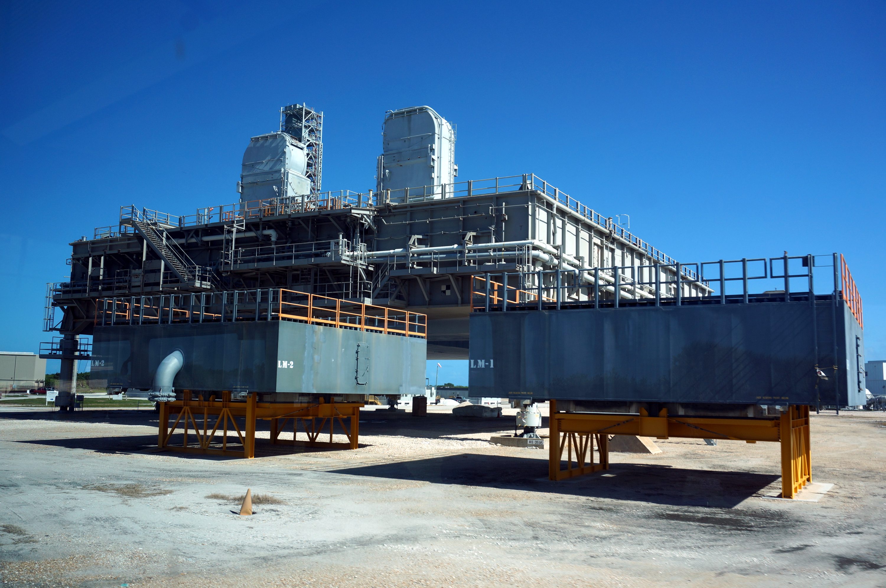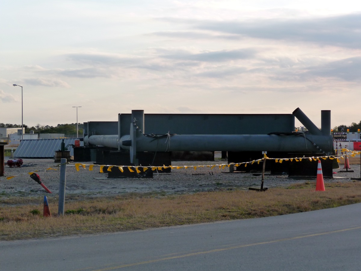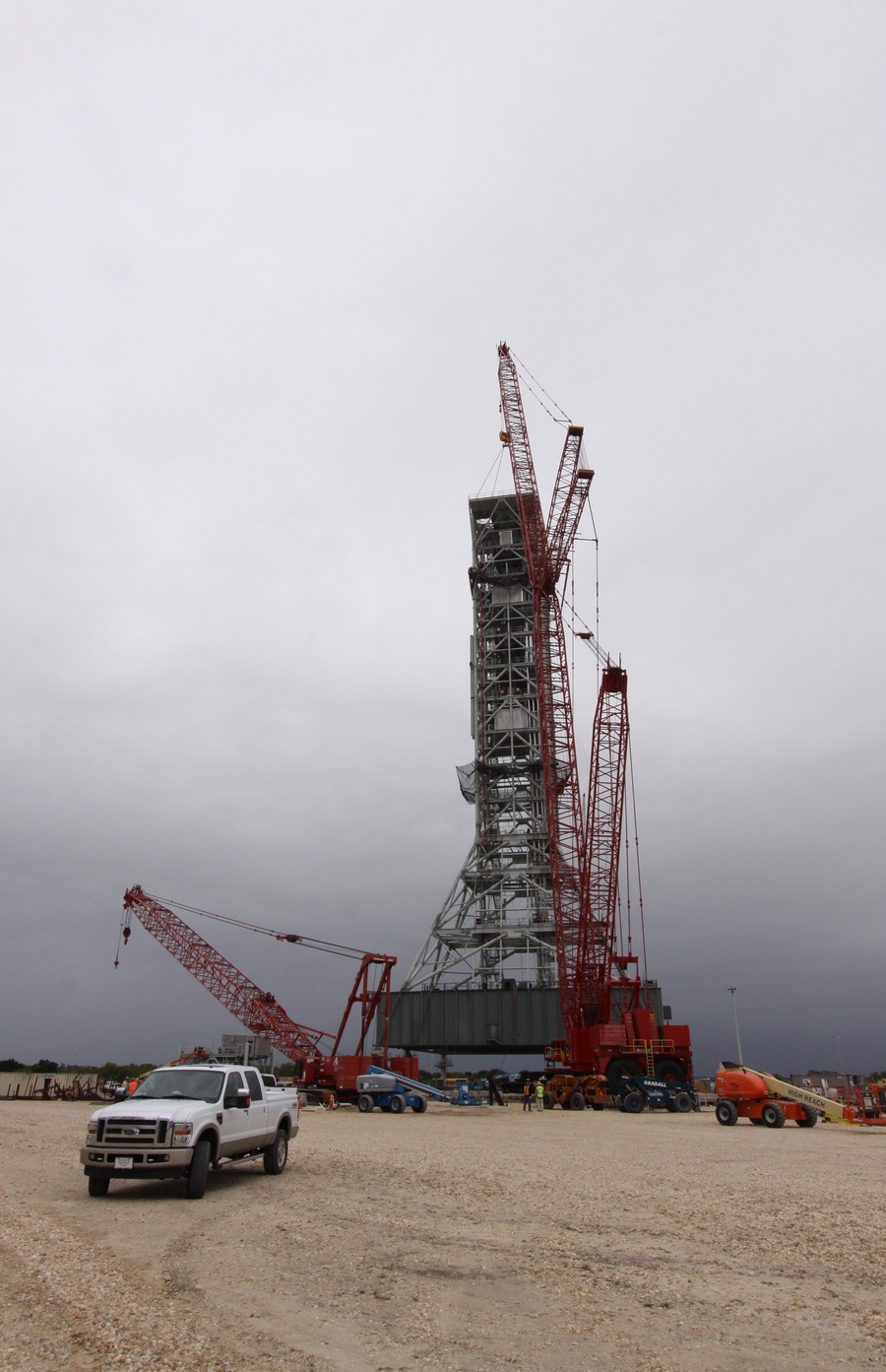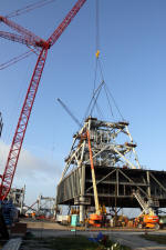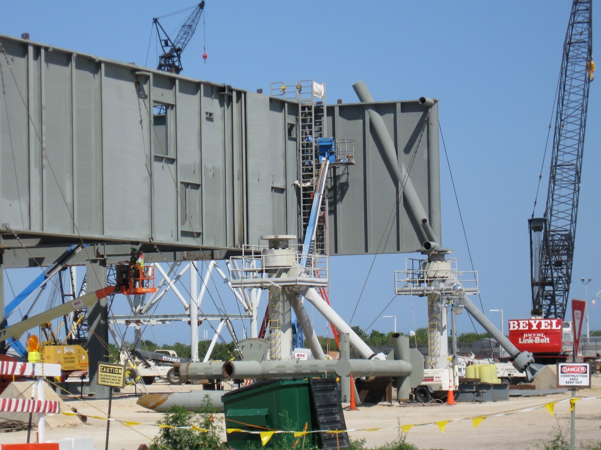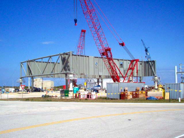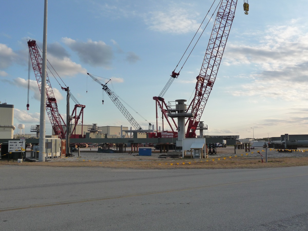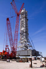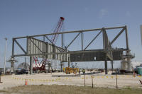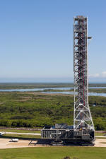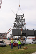 Mise en place du montant intérieur T6 (mars 2009) Travaux du nouveau ML Ares1 avec l'assemblage de la tour ombilicale. A noter la salle des machines pour les ascenseur et le toit déjà en place Avril 2009 Mai 2009 Vue du chantier de construction du ML Ares 1 le 14 mai 2009. Les montants intérieurs G8 et G10 ainsi que les G9 et 11 destinés à supporter Ares sont en place. 18 mai 2009 Juin, la pièce extérieure de la structure porteuse T6 est ajoutée sur le coté Est de la plateforme (side 4). Une nouvelle section de la tour a été monté en moins de 6 heures. Mise en place de T1A et T1B sur le coté Est. Mise en place de T7A Vue du chantier septembre 2009 Fin septembre, mise en place des premiers éléments de la tour ombilicale sur le ML. Fin janvier 2010, la construction de la structure métallique du ML Ares 1 se termine avec la mise en place de la 16 eme et dernière section. Haute de 121 m, elle et plus petite que les LUT rouge Apollo et plus grande que la FSS des pads 39. 200 ouvriers de Hensel Phelp d'Orlando ont participé à sa construction. D'ici la fin juillet, la structure basique sera achevé. Par la suite en 2011, le ML sera équipé des systèmes sol; ombilicaux, lignes d'alimentation en gaz, fluides électricité et ergols. Le ML devrait être terminé début 2014, éventuellement en 2013 pour le vol Ares 1Y "prime". L'administration US devrait se prononcer sur l'avenir du programme Ares 1 en février. Un rapport préliminaire recommande en effet d'utiliser des lanceurs commerciaux pour Orion et de fabriquer un lanceur lourd pour la lune et Mars. 1er février, le programme Constellation est annulé par l'administration américaine. Le développement des lanceurs Ares 1 et 5 et la cabine Orion suspendu. Le ML d'Ares 1 sera probablement terminé mais modifié pour le futur lanceur "lourd" que devrait développer la NASA. Avril, le 3eme segment du Launch Mount du ML d'Ares 1 est hissé sur la plateforme. Dans le nouveau plan spatial d'Obama, le ML servira de base pour un futur lanceur. 2 Launch Mount sont construit. Le 20 mai a lieu le montage du premier "launch mount" sur la plateforme du ML. Le "launch mount" devait supporter le lanceur solide Ares 1, basé sur le SRB du Shuttle. Juin, la construction du ML se termine au KSC. La nouvelle tour, haute de 108 m sera utilisée pour le prochain programme spatial US. La plateforme de même dimensions que le MLP du Shuttle est néanmoins plus légère afin de satisfaire au cahier des charges du Crawler transporter. Juillet, la NASA prévoit de déplacer le ML Ares 1 de son site de construction (emplacement Ouest) vers le site de maintenance des MLP (emplacement Est) juste à coté à la fin du mois d'août au cours d'une opération s'étendant sur 5 jours. Le MLP 1, qui a servit pour Ares 1X va être rentrer dans la baie 2 du VAB par le CT 2. Le CT 1 lui soulèvera le ML Ares trois fois et pesé avant d'être déplacer vers le site Ouest. Le CT 1 va être équipé de capteur de pesé pour cette opération. 1er octobre, soulevé par le Crawler 2, le ML Ares 1 est déplacé vers le site de maintenance Est à la place du MLP 1, déplacé lui quelques semaines auparavant dans la baie 2 du VAB. Sur ce nouveau site, le ML sera équipé en connections fluides, électriques et pneumatiques. Prévu pour le lanceur Ares 1, le ML restera à disposition pour un nouveau lanceur dans le cadre de la politique spatiale future des USA examiné au congrès. Le déplacement prévu pour le mois d'août a été repoussé suite à une panne des circuits électrique des crawler consécutif à un choc électrique lors d'un orage. Après révision, les deux engins ont repris du service, le CT 1 amenant Discovery sur son pad et le ML sur son site de maintenance. Le MLP 1 revient sur le site Ouest le 13 octobre. Les 2 Launch Mount du ML Ares 1 en octobre 2015, devant le MLP 1