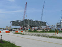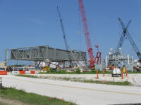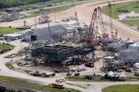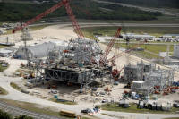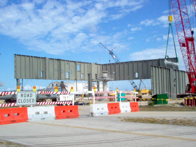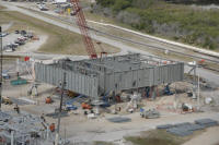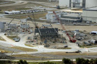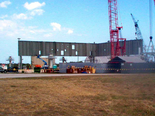 Photo montage montrant le site de construction du ML Ares 1 sur la parking Ouest près du VAB. La construction devrait durer jusqu'en novembre 2012. Le ML sera changé de place en octobre 2010 avec le MLP 1 du programme Shuttle. Ce dernier servira pour le vol Ares 1-X en juillet 2009, puis sera parqué sur le site Est, dépollué et sécurisé. il sera laissé au institution à partir de décembre 2009. Le MLP sera ensuite en fonction des budget soit modifié pour Ares 5, soit démantelé. Le ML Ares 1 sera amené dans le VAB pour des tests de validation fin 2012.
