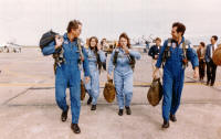 Specialist et un astronaute du programme "Teacher in space". Christa Corigan Mc Auliffe sera la première enseignante de l'espace. Agée de 37 ans, mariée et mère de deux enfants, professeur d'anglais et d'histoire américaine depuis 1970, elle a été sélectionnée en juillet 1985 dans le cadre du projet "teatcher in space" lancé le 27 août 1984 par le Pt Reagan. L'équipage de Challenger 51L, en haut Onizuka, McAuliffe, Jarvis et Resnick. En bas, Smith, Scobee et McNAir Christa McAuliffe, Barbara Morgan, les "teacher in space" au coté des pilotes Smith et Scobee. Judith Resnik Entrainement dans le cockpit de l'Orbiter: devant Smith et Scobee avec derrière Onizuka et Resnik. Au middeck, McAuliffe, Jarvis et McNair sous l'autorité de Barbara Morgan, la doublure de McAuliffe Barbara Morgan, Greg Jarvis et Christa McAuliffe. Les 7 astronautes ont été tué dans l'explosion de Challenger le 28 janvier 1986, 73 secondes après leur décollage. 10 NAS APRES QUE SONT DEVENUS LES CONJOINTS ET LEUR FAMILLE