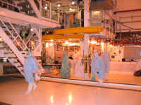20 à 30 personnes d'United Space Alliance se chargent des opérations de déchargement du Canister Transporter dans la salle de transfert, la tour RSS étant dans sa position de parking. Elle se replie contre l'Orbiter pour permettre ses opérations de déchargement. La PCR est une salle carré de 15 m de coté et de 24 m de hauteur avec des plateformes de travail de chaque coté sur 5 niveaux. Le PGHM est au centre. il est équipé de plateformes fixes et extensibles au centre afin de travailler dans la soute ou accrocher les charges utiles. Lors du déchargement du module Destiny pour ISS, seulement 20 techniciens assistaient la manoeuvre délicate. La charge utile qui est enfermée dans le Payload Canister est hissé dans la tour PCR à l'aide d'une grue de 90 tonnes située au sommet de la tour. Le Canister est guidé par des rails puis plaqué contre. Un système de joint permet d'avoir une salle à environnement contrôlée de class 100 000. Les portes de la tour sont ouvertes ainsi que celle du Canister. Le PGHM est avancé de 9 m. L'équipe de techniciens déploie alors les 5 plateformes et les échelles pour faciliter l'accès aux charges utiles. Le PGHM est avancé de 3 m à environ 25 cm des tourillons servant à la mise en place des charges dans la soute. Dans cette position, l'avant du PGHM est finement ajustée de tous les cotés jusqu'a ce que les crochets en forme de "J" soit attachés aux tourillons correspondants. Cet ajustement prend des heures. Une fois les crochets solidement attachés aux tourillons, ils sont légèrement soulevés afin de transférer tout le poids de la charge au PGHM. La charge est ensuite retiré du Canister selon la même procédure que pour le chargement. Les portes du PCR sont refermées, le Canister est descendu au sol. Après l'arrivée du Shuttle sur le pad, la tour RSS est remise en place contre la soute de l'Orbiter. Les portes du PCR et de la soute sont ouvertes. Le PGHM est positionnée de la même façon contre la soute, mais cette fois ci il devra poser sa charge utile sur les tourillons de l'Orbiter. Selon le nombre d'éléments à transférer, près de 40 personnes sont nécessaires. 1 Orbiter; 2 joint; 3 ajusteur de précision; 4 mécanisme du PCR; 5 tour RSS; 6 bras RMS; 7 guide Orbiter Des plateformes mobiles permettent de s'adapter aux différentes charges utiles de 1,5 m et 4,5 m de diamètre