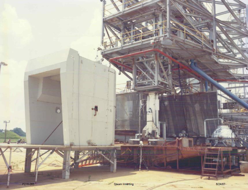 Les tests pour la base du KSC se sont déroulés d'août 1974 à décembre 1976 Les tests de la maquette du Shuttle se sont déroulé en 2 phases, une pour des mesures basiques acoustiques et l'étude de la surpression IOP et l'autre pour le système de de déluge par eau, avec un total de 153 mises à feu. Le cahier des charges était de 145 dB à l'intérieur de la soute de l'Orbiter. Diverses études et concept ont été étudié pour réduire le bruit dans la tranchée du pad, en sortie des fosses et au dessus de la cabine.. Les demandes pour configurer le pad de tir en tenant compte d'une réduction du bruit incluaient (1) des déflecteurs latéraux pour les SRB, (2) l'allongement des fosses SRB, (3) un déluge par eau dans la fosse SSME, (4) un déluge par eau dans la tranchée des SRB, (5) un déluge par eau sur le déflecteur principal et (6) des asperseurs "rains bird" sur le pont de la plateforme. La surpression lors du décollage de STS 1 à fait tomber 16 tuiles thermiques et endommager 148 autres. La dérive du STS au décollage a fissuré le pont du MLP sur 9 m. L'intense réflexion acoustique a fait déplacer les élevons sur le ailes de l'Orbiter Columbia. De nouveaux essais sont réalises en juillet et août 1981 et le système de déluge modifiés: (1) des grands sacs d'eau sont installés dans la fosse secondaire des SRB, (2) les buses au Nord sous les déflecteur latéraux SRB déconnectées et (3) l'eau redirigée vers la fosse SRB primaire directement sous le jet des boosters. Globalement, le système de déluge par eau SSWS est composé d'un déluge d'eau dans la fosse SSME et sur le déflecteur dans la tranchée pour réduire le bruit des gaz d'échappement, d'un déluge d'eau dans les fosses SRB pour réduire l'IOP à l'allumage et de "rainbirds" pour réduire la réflexion acoustique de la plateforme lors du passage du stack.