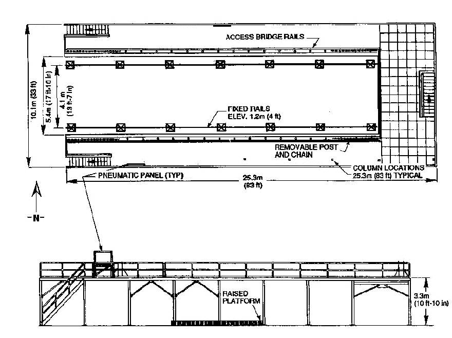 long sur 4,1 m de large. Il est équipé de deux rails posés à 1,2 m de haut