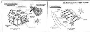 Le propergol des SRB est une mixture composée de perchlorate d' ammonium (faisant office d' oxydant avec 69,7% du poids), d' aluminium (le carburant 16%), oxyde de fer (le catalyseur 0,4 %), d'un polymère (12,04 %, liant assurant la cohésion du mélange) et d' un agent siccatif époxy (1,96 %). Le propergol est disposé dans une cavité en forme d' étoile à 11 branches dans la section avant du booster et en forme de double cône tronqué percé dans les segments arrières. Cette configuration permet d' avoir le maximum de puissance à l' allumage et de la réduire d' un tiers après 50 secondes de vol, quand le maximum de charges est atteint, Q max. Les SRB sont constitués chacun de quatre sections de propulsion et sont utilisés par paires. Pour chaque paire, les moteurs sont chargés strictement à l' identique garce à l' utilisation, dans chaque paire de sections, de composants de propergols issus de même lots, afin de réduire au maximum les déséquilibre de poussée. Après remplissage, les segments sont envoyés sur le site de lancement par rail sur des wagons spéciaux, recouverts de bâches de protection. Le rapport de détente de la tuyère est de 7/79 depuis la mission STS 8. La tuyère est articulée autour d' une suspension à cardans qui permet d' agir sur la direction du vecteur de poussée, chaque booster possédant ses propres générateurs de puissance APU et pompes hydrauliques. Le débattement de la tuyère est de 8°. Elle est constituer de couches de carbone qui s' érode pendant le vol. La tuyère est de type convergent/divergent, à dessin mobile. La jupe arrière en forme de cône subit les charges arrières à travers le booster et la plate forme MLP. Les quatre moteurs de séparation sont montés sur cette jupe. Elle contient également l' avionique, les vérins de contrôle avec les APU et les pompes hydrauliques, le système hydraulique et le système d' éjection de la tuyère extensible. La section avant de chaque booster contient également de l' avionique, un séquenceur, les moteurs de séparation avant, le système de séparation du nez, les parachutes (trois de 35 m de diamètre), une balise, une lampe de récupération, une caméra parachute sur certains vols et le système de destruction en vol. Chaque SRB possède deux ensembles électroniques intégrés, un à l' avant l' autre à l' arrière. Huit fusées de séparation, quatre à l' avant sur le nez et quatre à l' arrière sur la jupe, s' allument 1,02 s au moment de la séparation avec le réservoir. Chaque fusée mesure environ 79 cm de hauteur et 32 cm de diamètre. Un bloc de secours est situé sur chaque booster et le système parachutes. Il comprend un émetteur, une antenne, une lampe stroboscope, une batterie et l' électronique pour résister à l' eau de mer salé. Ce bloc est conçue pour être opérationnel pendant 72 heures et réutilisable 20 fois. La lumière flash est une exception, elle opère pendant 280 heures. La batterie est utilisable une seule fois. Les équipes chargées de la récupération des boosters, rapatrient les parachutes et les cônes avant. Les tuyères sont obturées, les moteurs sont purgés de l' eau de mer et les SRB sont tirés jusqu' au site de lancement par deux bateaux remorqueurs, les USS Freedom et Liberty. Chaque SRB est sorti de l' eau, démontés et lavés avec de l'eau claire pour limiter la corrosion du au sel. Les huit segments, les allumeurs et les tuyères sont ensuite envoyés chez Thiokol pour être restaurés. SYSTEME ELECTRIQUE Le système électrique du booster est relativement