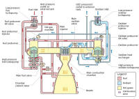 Au 1er août 2005, le centre Stennis (Mississippi) a réalisé 2200 mises à feu de moteur SSME en 30 années. C'est en effet le 19 mai 1975 que le premier moteur était mis à feu sur l'un des deux banc du centre A1 et A2. Dans les deux mois qui suivirent 9 autres essais étaient réalisé se focalisant sur les pré-chambre LH2-LO2 et l'allumage de la chambre de combustion principale. En 1978, trois moteurs équipèrent le Main Propulsion Test Article pour des essais grandeur réelle en configuration de vol. Au début de 1980, les moteurs donnent du soucis au ingénieurs de Rockwell juste avant le premier vol, mais ils seront rapidement réglés. D'avril 1981 à juillet 2005, pas moins de 342 moteurs partiront dans l'espace. Chaque éléments du moteur ainsi que les turbopompes sont fabriqués par les équipes de Rocketdyne (maintenant Prat & Witney) à Canoga Park en Californie, le centre Marshall se chargeant de gérer l'ensemble. Les moteurs sont ensuite assemblés au KSC et envoyés au centre Stennis pour subir une mise à feu de 520 secondes sur l'un des deux bancs d'essai. Les tests concluants, le moteur est renvoyé au KSC pour être monté sur un Orbiter. A l'issue de chaque mission, les moteurs sont démontés, vérifiés et renvoyés à Stennis pour un autre essai au banc. Les moteurs SSME, Space Shuttle Main Engines ou RS 25 sont en effet très particulier, le rapport de masse a été fortement abaissé. Ce rapport, définissant la masse du lanceur sur la masse de la charge utile était de 20 pour le Saturn 5, il est de 15 pour le Shuttle (2013/ 133, Orbiter + charges utiles). Les moteurs SSME sont allumés dès le décollage et cessent de fonctionner à la mise en orbite, réduisant encore la masse inutile. Les SSME consomment de l' hydrogène et de l' oxygène liquide très énergétique, 30 000 calorie par molécules. La vitesse d' éjection dépend de l' altitude et de la pression de combustion dans la chambre, elle est de 250 bars pour ce moteur avec 3600 m/ s. Une telle pression demande à l' entrée des turbopompe 500 bars. Le débit en LOX atteint 402 kg/ s et pour LH2 67 kg (vitesse de rotation des turbines 31060 et 37250 t/ mn). La poussée atteint 213 tonnes par moteur dans le vide et 170 au sol. De par le concept à flux intégré, les gaz issue du générateur sont réinjectés dans la chambre de combustion et participent à la poussée. Les puissances de ces turbopompes valent 27640 Cv pour LOX et 75840 CV pour LH2. L' injecteur est disposés au sommet du moteur en vue directe de la chambre. L' hydrogène liquide à moins 253°C circule dans une collection de tubes soudés dont est formé le divergent de la tuyère pour le refroidissement. Vue de loin, les moteurs SSME ont l' air petit et il le sont par rapport au monstrueux F1 du Saturn 5. 4,3 m de lo,g et 2,3 m de diamètre à la tuyère, il pèse 7900 kg à eux trois. FONCTIONNEMENT Le moteur SSME utilise un cycle de combustion dit en étages, hydrogène LH2 et oxygène LOX étant d' abord mis en contact à température relativement basse, dans des chambres de pré combustion puis à hautes températures dans la chambre principale. Une valve permet l' arrivée du combustible LH2 qui est dirigé vers le circuit de refroidissement des tuyères, grâce à des tubes soudés sur le divergent. Il passe aussi dans les conduits d' arrivée pour aboutir à la chambre de combustion principale. Une partie de LH2 servant au circuit de refroidissement est acheminée par l' intermédiaire d' une valve de contrôle, vers les parois du dispositif de préchauffage pour servir à la combustion et au refroidissement. L' autre partie, chauffée à température quasi ambiante est injectée dans la chambre principale et redirigé vers la turbine de la pompe basse pression. La valve principale du circuit LOX s' ouvre et le liquide s' écoule au travers de deux turbopompes vers l' injecteur principal et par l' intermédiaire des valves de préchauffage vers le dispositif de préchauffage. L' oxygène refoulé par la turbopompe haute pression va alimenter la pompe basse pression. La combustion est déclenchée par un dispositif d' allumage situé au sommet des systèmes de préchauffage et dans la chambre principale. Le système de préchauffage fonctionnant sur des mélanges d' une unité H2 pour une unité O2, produit une vapeur très riche en hydrogène qui entraîne les turbines haute pression avant de pénétrer dans le collecteur de gaz chaud. Cette vapeur est alors acheminée des turbines vers l' injecteur principal et mélangé pour la combustion à de l' oxygène supplémentaire provenant de la pompe haute pression.