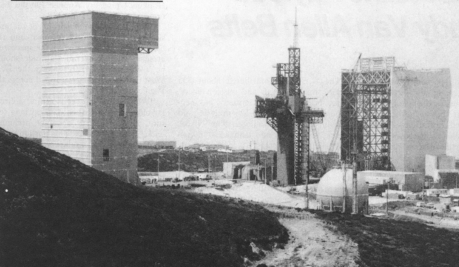 de lancement (droite) vers le bâtiment de contrôle en construction |