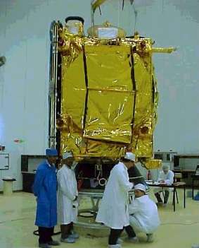 C' est le 44ème succès consécutif d'une Ariane 4. INSAT 2E, est le sixième satellite indien mis en orbite par le lanceur européen. Conçu et fabriqué par l'ISRO pour le gouvernement indien, INSAT 2E a une masse au décollage de 2550 kg. Il est équipé de 17 répéteurs en bande C pour les services fixes (FSS), ainsi que d'un radiomètre à très haute résolution et d'une caméra CCD pour les services météorologiques. Ce satellite offrira des services complets de télécommunications et de météorologie. Positionné à 83° Est, au dessus de l'Océan Indien, il desservira essentiellement l'Inde. 2 avril, V118, érection du troisième étage. 6 avril, V119, raccordement de