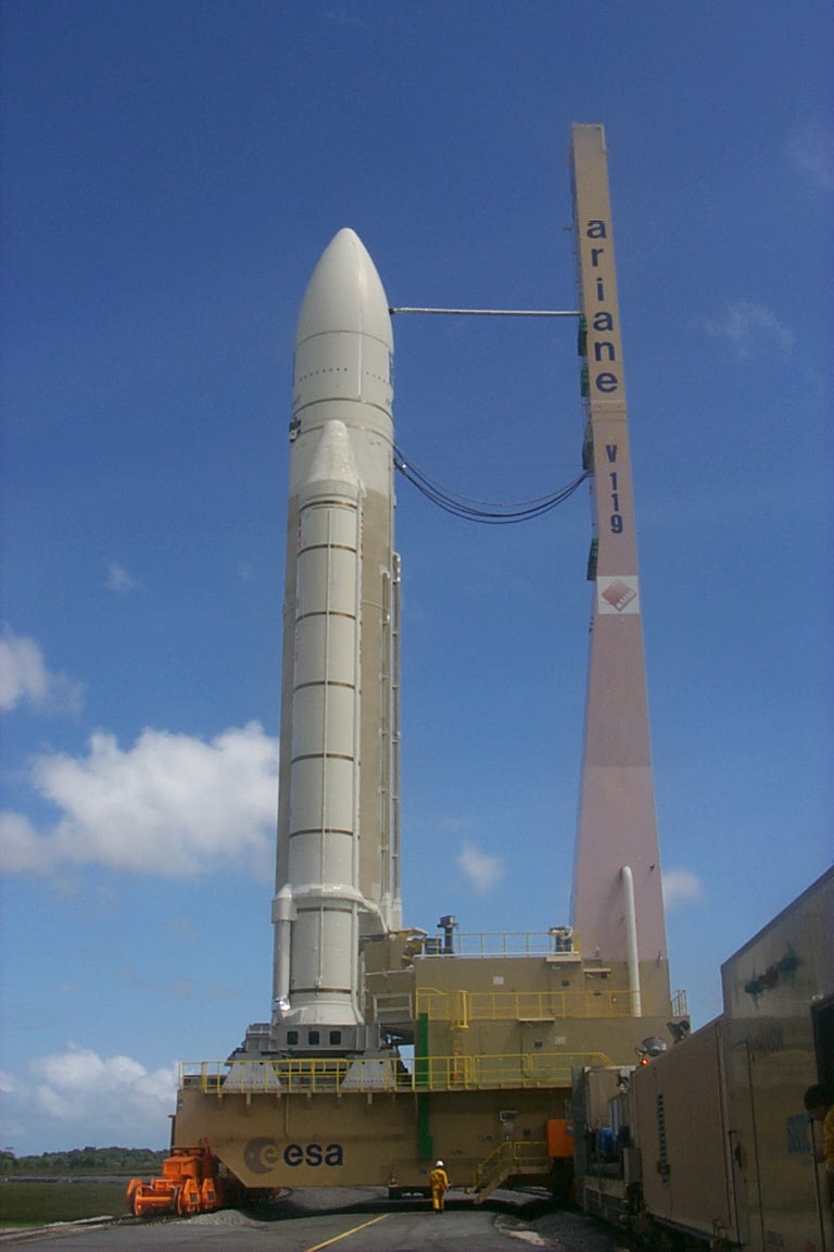 l'orbite (calculés à l'injection du troisième étage) : 13 novembre, V119, annonce officielle de la date de lancement d'Ariane 504 : le 10 décembre, la fenêtre de lancement s'ouvrira à 14 h 32 GMT, précisent les responsables du programme. 15 novembre, V119, dans le Bâtiment d'Assemblage Final Ariane 5, l'équipe responsable de la charge utile mène à bien les procédures de remplissage et de pressurisation de l'observatoire spatial européen XMM. Pour l'opération de remplissage, le satellite XMM, long de dix mètres, a été orienté verticalement et transféré de son banc polyvalent jusqu'à un bâti spécial. Le satellite a ensuite été positionné au-dessus d'un bac de vidange, dans la zone de préparation des charges utiles du Bâtiment d'Assemblage Final, dans l'éventualité où des ergols seraient accidentellement répandus. 500 kg d'hydrazine avaient été apportés d'Europe, jusqu'au Port Spatial, pour assurer le remplissage du satellite XMM.