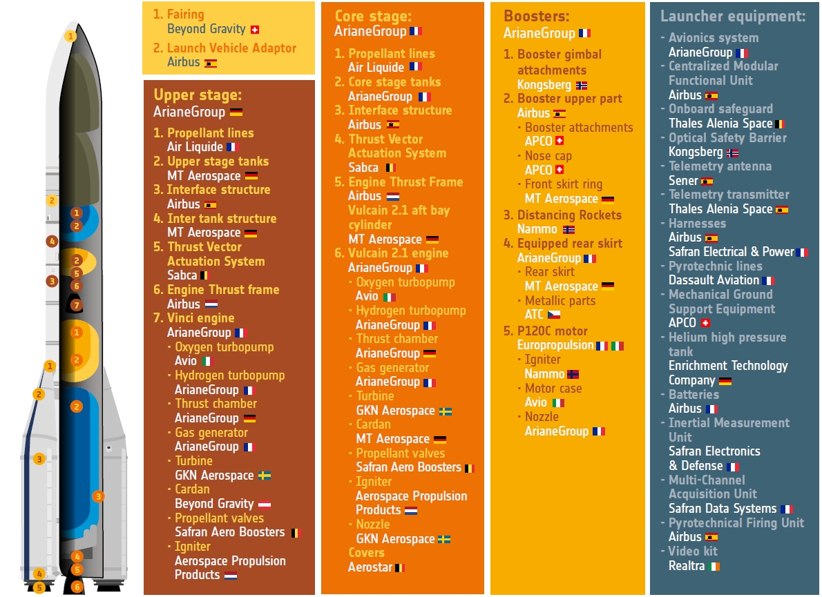 QUI FAIT ARIANE 6 Maitre d'oeuvre du programme, ArianeGroup coordonne près de 550 entreprises européennes pour faire Ariane. L'étage principal LLPM est fabriqué en France aux Mureaux par ArianeGroup, comme les moteurs Vulcain et Vinci. Les ESR P120 sont bobinés en Italie, les tuyères en France, à Bordeaux et la partie avant en Espagne. L'étage supérieur ULPM est fabriqué en Allemagne, à Brême. Le SYLDA est fabriqué en France. L'Espagne fabrique pas moins de 7 éléments d'Ariane 6, les IFS, InterFace Structure entre les premiers et second étages, le LVA, Launch Vehicle Adapter, les adaptateurs de charges utiles, 3 dispensers (ASAP-A6, HUB et MAS-H), le cône avant des ESR et 90% du câblage électrique du lanceur. La coiffe est fabriquée par la Suisse, les structures des ESR, le SYLDA et les adaptateurs fabriquées par l'Espagne, les moteurs Vulcain 2 et Vinci fabriqués par la France et l'Allemagne et les les équipements cryogénique fabriqués par la France. L'Allemagne, la Roumanie, les pays Bas et la Suisse fabriquent les éléments destinés à l'étage inférieur, l'étage supérieur et les ESR. L'Allemagne intègre les éléments de l'étage ULPM (réservoirs LOX, LH2, intertank et moteur), la France intègre l'étage LLPM (réservoirs LOX, LH2, intertank et moteurs), l'Italie intègre les ESR. L'ensemble prend le bateau pour la Guyane. Au CSG, la coiffe, le SYLDA et les adaptateurs (upper composite) sont assemblés dans la partie haute du BAF, le LLPM core est intégré avec le UPPM dans le BAL (central core) et les ESR dans le BIL. C'est dans l'usine ArianeGroup de Brême en Allemagne qu'est assemblé l'étage ULPM. Les 2 réservoirs LH2 et LOX sont fabriqué par MT Aerospace, ils rejoignent l'usine pour être intégré et constitué l'étage proprement dit. Ils reçoivent chacun une couche d'isolation avant d'être placé dans leur box de montage respectif: le réservoir LH2 reçoit ces conduites d'alimentation (Air Liquide), la structure inter-réservoir (MT Aerospace) tandis que le réservoir LOX est équipé de ces canalisations d'alimentation, du cone de poussée et du moteur Vinci. Les 2 parties sont ensuite assemblé dans un autre box avant de recevoir dans le box final, la structure inter-étage (Airbus) et la tuyère du Vinci. L'étage LLPM est assemblé lui aux Mureaux, en France dans l'usine d'ArianeGroup. Dans cette immense bâtiment, 6 zones assurent la fabrication des éléments de l'étage, la zone de soudage, de timbrage, d'isolation, Assembly Iintégration & Tests, Vuab et la zone d'intégration. Les panneaux servant à la fabrication des réservoirs sont soudés ensemble par friction. Ils sont ensuite testé en pression dans la salle de timbrage avec du gaz sec. Avant d'être installé dans la zone AIT, les réservoirs sont isolés. Dans cette zone, ils sont équipés de leur isolation externe, des canalisations d'alimentation et d'intérface. Dans la zone Vuab est assemblé la baie de propulsion du moteur Vulcain 2.1. Tous les éléments, réservoirs LH2, LOX, inter-réservoir, Vuab sont ensuite assemblé dans la zone d'intégration, l'étage ainsi constitué est au final, après dernières vérifications placé dans son container. La tuyère des ESR est fabriqué en Gironde au Hallian, puis acheminé par route à Fos Sur Mer puis au Havre par bateau, point de ralliement des autres parties du lanceur, l'étage ULPM, venu de Brême et le LLPM venu de Paris, tous deux par barge et les demi coiffe venues de Suisse (Beyond Garvity). Au Havre, les éléments en container sont roulés dans le Canopé, le navire d'ArianeGroup fonctionnant au gaz et à voile, direction la Guyane. En Guyane, au CSG, les carcasses vides des P120C, ESR sont amenées verticalement dans l'usine REGULUS, le bâtiment des puits de coulée pour recevoir leur propergols solide. Une fois remplis et le propergols cuits, le P120 est amené sur un fardier spécial dans le BBP, Bâtiment de Basculement du propulseur pour être mis en position horizontale. Il rejoint l'extension CIH (Cellule d'Intégration Horizontale) du BIP, Bâtiment d'Intégration Propulseur (hérité d'Ariane 5) et reçoit sa tuyère, la jupe arrière et le cône avant. Le P120C est ensuite transporté à l'horizontale et verticalisé dans l'EFF (ESR Finsh Facility) où il est finalisé devenant un ESR. Il est ensuite stocke dans le BSB (Bâtiment de Stockage Booster) en attente de son vol et sa mise en place en ZL4.