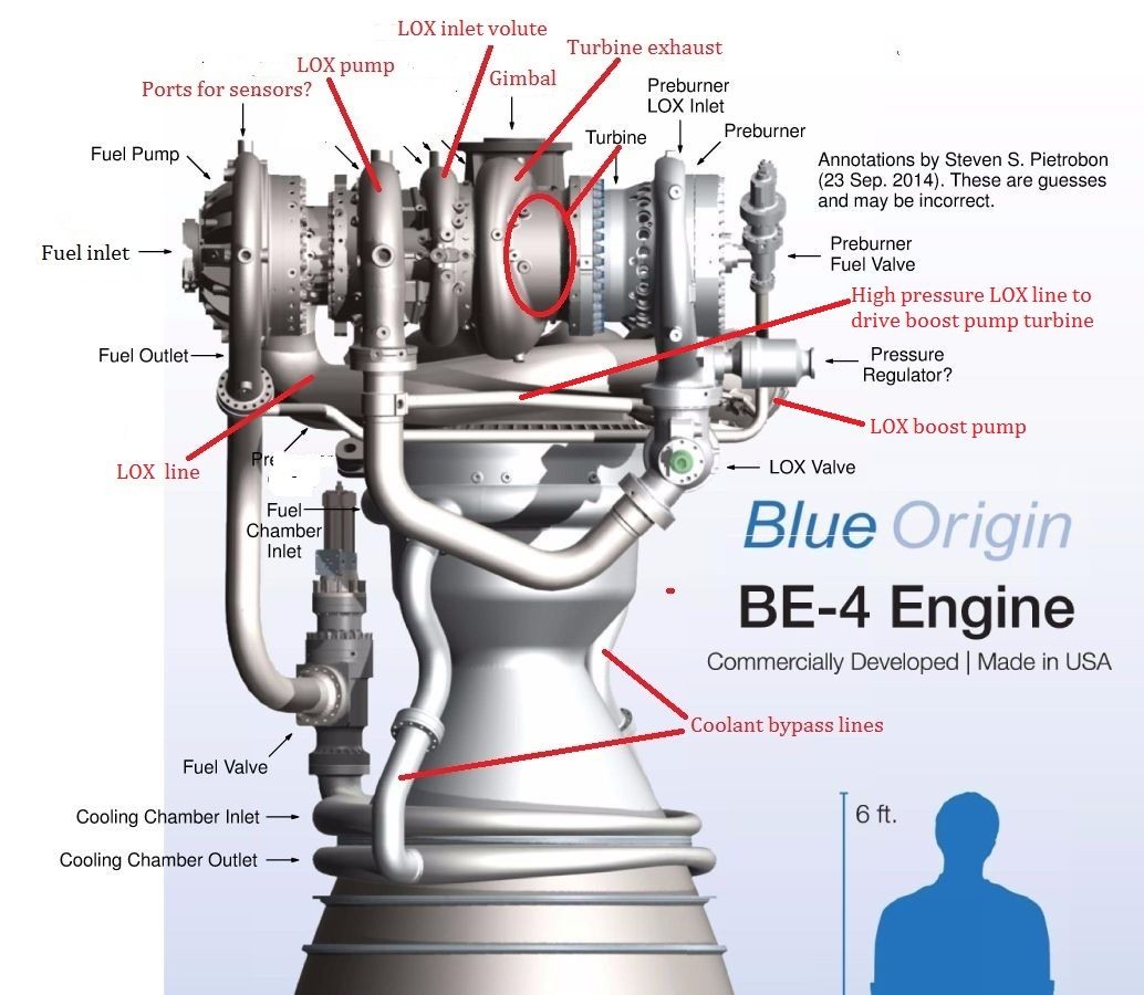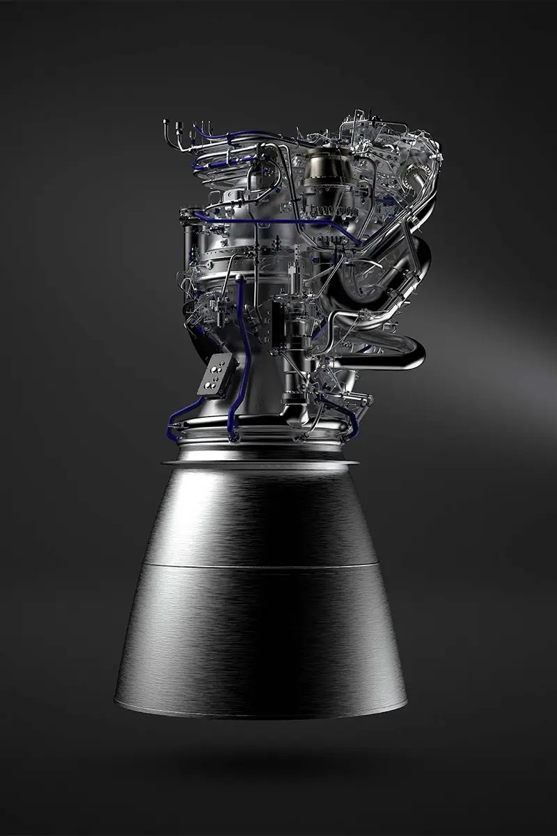 BE 4 Le premier moteur à combustion étagé riche en oxygène conçu et fabriqué aux États-Unis alimente la prochaine génération de fusées orbitales américaines, dont le New Glenn. Le BE-4 est le moteur à combustion étagée riche en oxygène alimenté au gaz naturel liquéfié (GNL) le plus puissant jamais utilisé. Le BE-4 est capable de produire une poussée de 245 à 271 tonnes avec une ISP de 355 secondes. Une grande partie des ergols passe par une pré-chambre de combustion où ceux-ci sont en partie brulés. Les gaz en sortie de cette préchambre entrainent les turbines avant d'être injectés dans la chambre de combustion. La pression dans celle-ci est de 134 bars, ce qui est relativement faible compte tenu du système d'alimentation utilisé mais réduit les couts de remise en état lorsque le moteur est réutilisé. Une turbine unique entraine les deux turbopompes qui mettent sous pression les ergols. Sa vitesse est de 19 000 tours par minute et elle développe une puissance de 70 000 chevaux. Le moteur brûle 780 kilogrammes d'ergols par seconde.