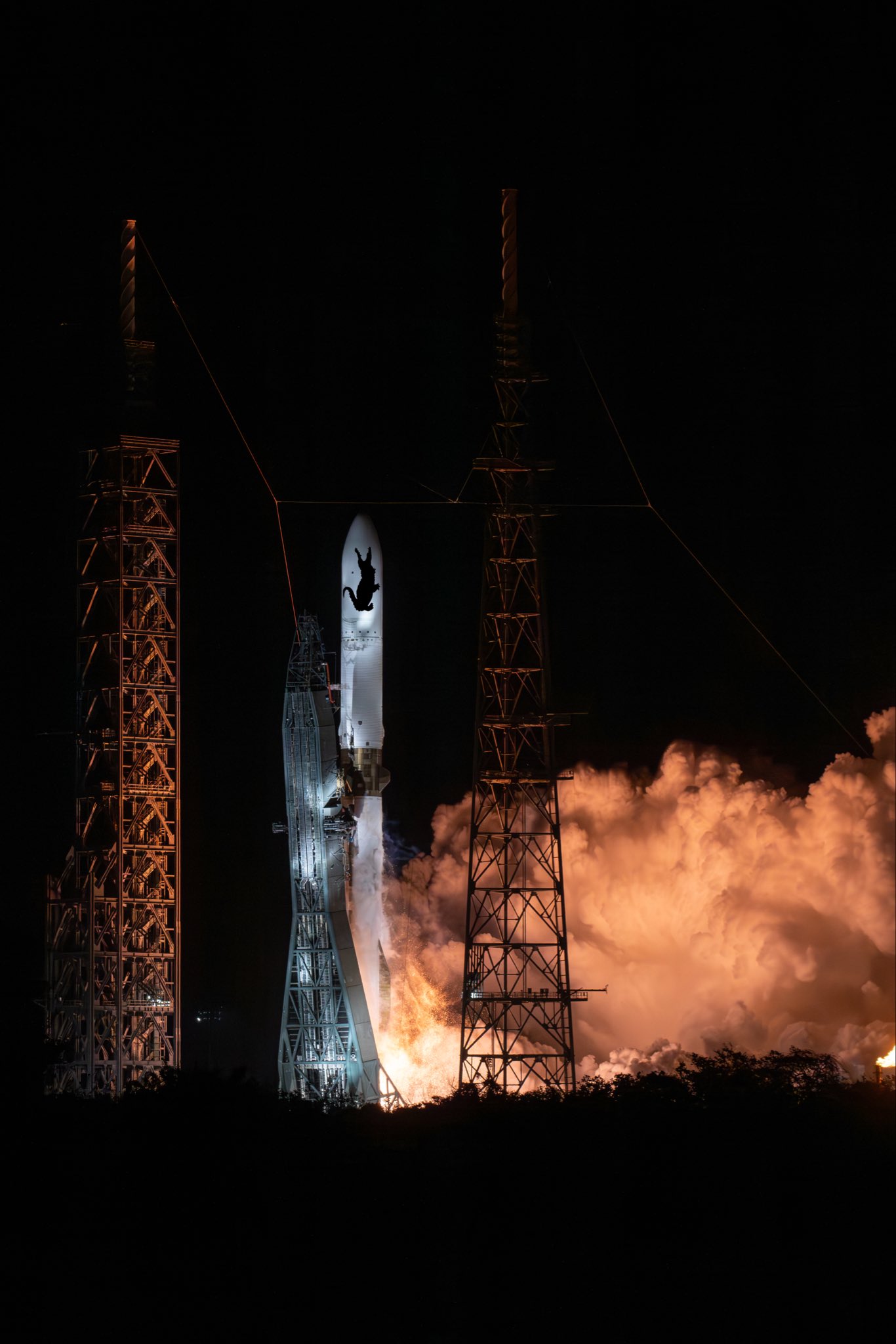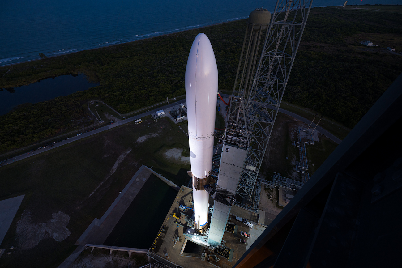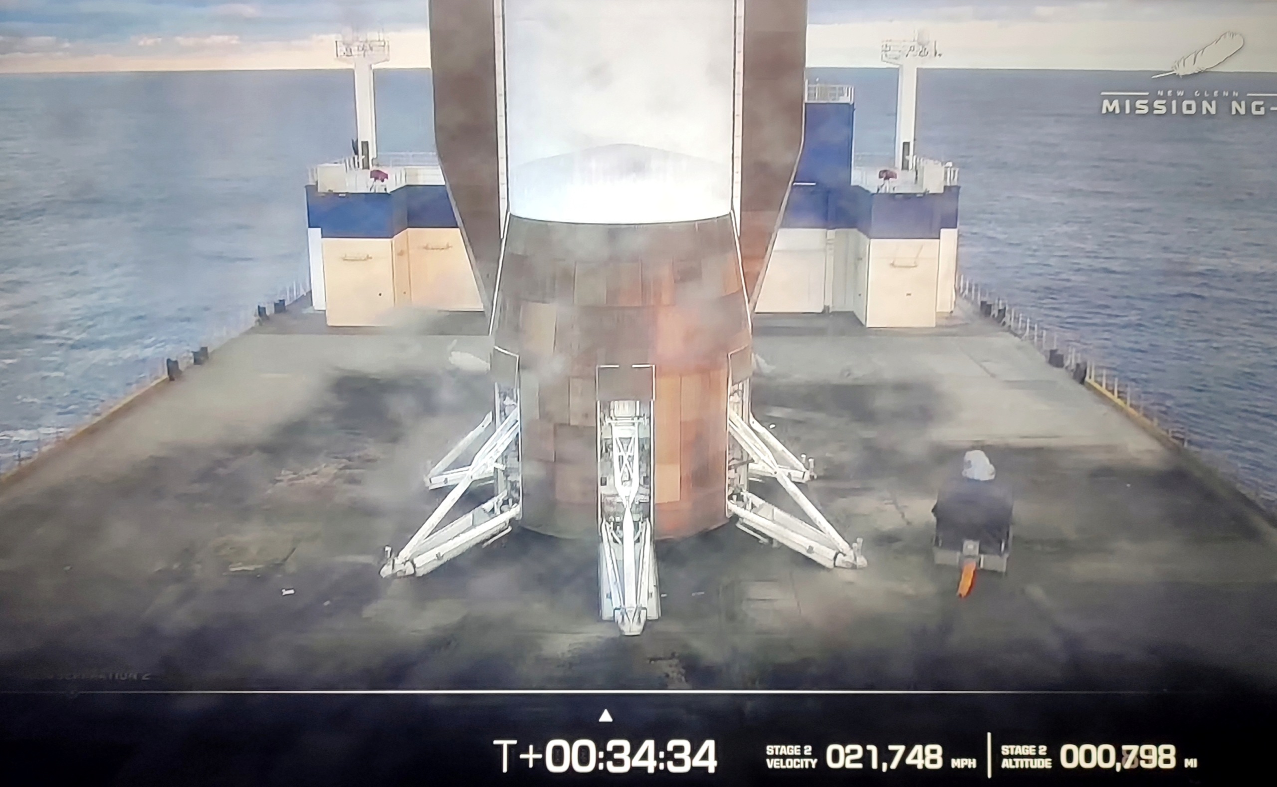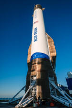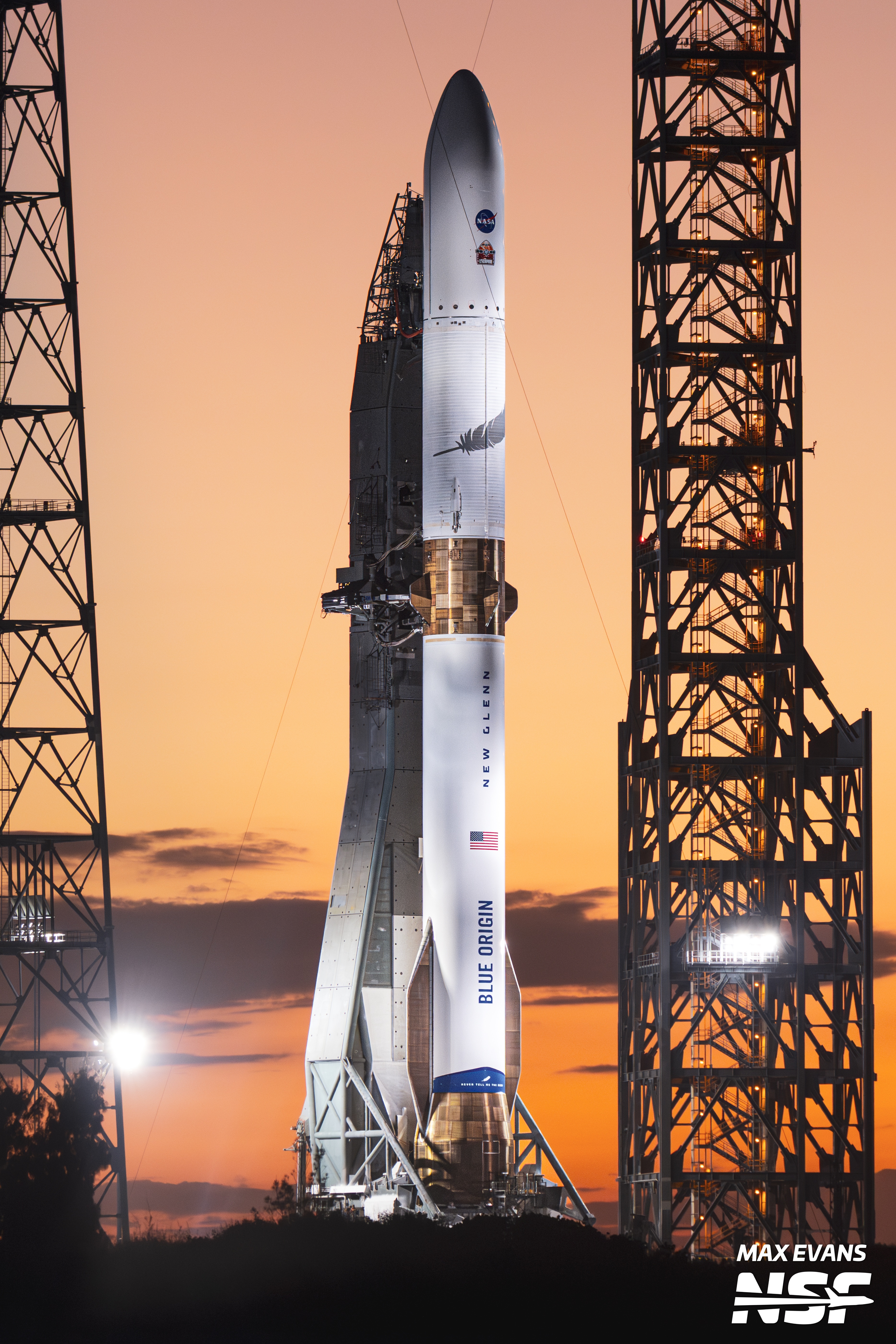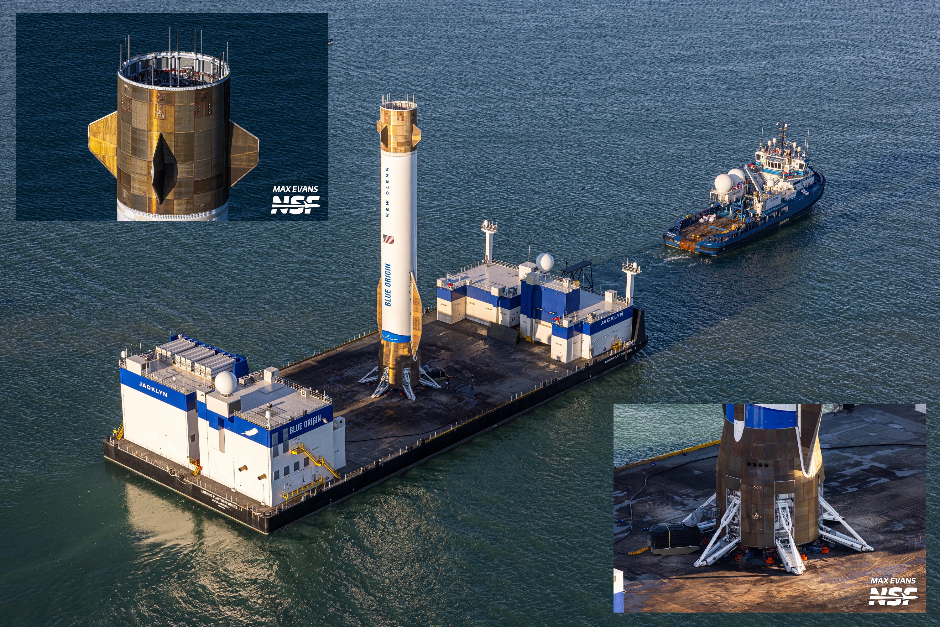 L'étage principal de 57 m de haut, Glenn Stage 1 (GS1), connu sous le nom de « So You're Telling Me There's a Chance » ou GS1-SN001, tentera d'atterrir sur le Landing Platform Vessel 1 (LPV1) de Blue Origin nommé Jacklyn en l'honneur de Jeff. La mère de Bezos. L'étage utilisera 3 de ces 7 moteurs BE-4 et également des ailerons et des propulseurs pour guider son chemin vers Jacklyn , qui se déroulera dans l'Atlantique à des centaines de kilomètres au large des côtes de Floride. 10 janvier, le lanceur NG-1 est sur le pad de tir. La coiffe du New Glenn contient des milliers de signatures d'employés de Blue Origin - un hommage au travail acharné et à la passion pour la mission que nous avons tous ici à Blue.