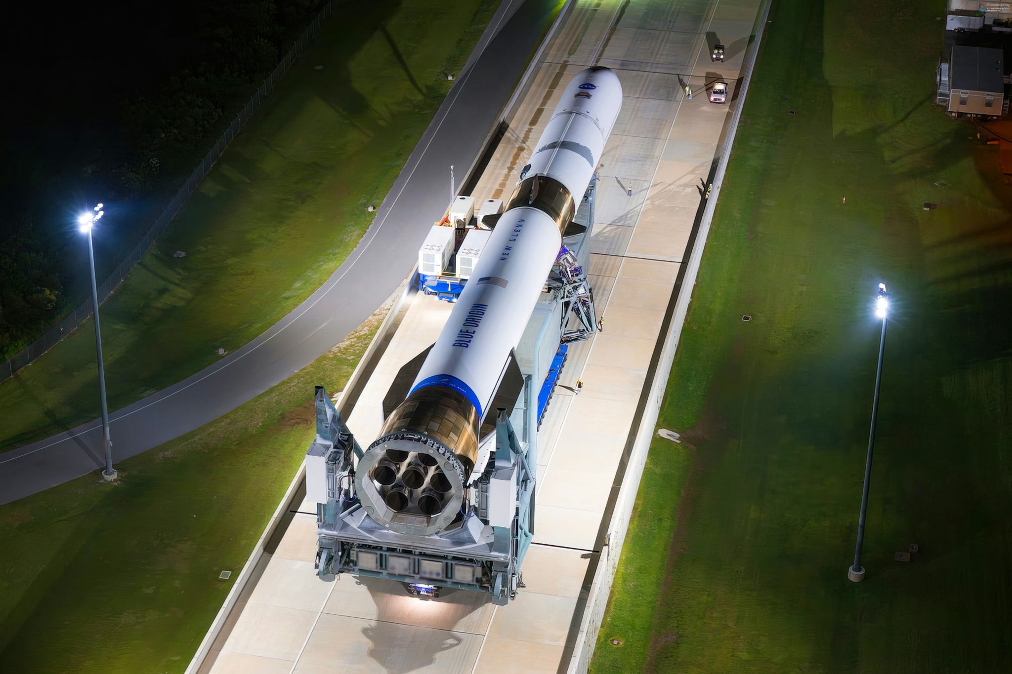 21 février 2024, un lanceur complet New Glenn avec premier, second étage et coiffe, mais sans les moteurs est mis sur le LC36 pour être mis à la verticale en soirée. La campagne de tests permet aux équipes de pratiquer, de valider et d'accroître leurs compétences en matière d'intégration de véhicules, de transport, d'assistance au sol et d'opérations de lancement. Le voyage vers le pad de tir a commencé fin décembre dans le hangar du complexe 36. Les tests se termineront dans une semaine après plusieurs démonstrations de chargement d'azote simulant les véritables ergols cryogéniques qui seront utilisés pour le vol, Integrated Tanking Test (ITT), de contrôle de pression et de systèmes de ventilation du lanceur. Les installations du pad et les systèmes au sol sont terminés et seront activés pour la première fois lors de la campagne de tests. Le PDG et fondateur de Blue Origin, Dave Limp et Jeff Bezos admirant le New Glenn sur le pad. Selon Blue Origin, "le premier étage n'est pas uniquement destiné aux tests, mais il sera éventuellement utilisé lors d'une véritable tentative de lancement de New Glenn. Actuellement, il manque encore à cette étage les pattes d'atterrissage, les virures du bas et les ailerons au sommet. Il manque également à ce premier étage ses 7 moteurs BE-4. Ces moteurs destinés au tir statique terminent les tests de qualification dans les installations de Blue Origin à l'ouest du Texas. Concernant les tests à venir qui devraient avoir lieu dans les prochains jours, ils n'ont pas besoin des moteurs ou autre matériel manquant sur le booster". Après le test, le premier étage sera équipé d'une structure arrière et de moteurs BE-4, couplés à un nouvel étage supérieur, puis renvoyé sur le LC36 cet été pour un véritable tir statique. Blue Origin prévoit le premier vol le plus tôt possible. « Nous lançons cette année. Notre plan est de lancer deux fois cette année." En 2022, Blue Origin a changé d'avis sur le navire de récupération et a démoli un bateau qu'il avait initialement prévu de modifier et d'utiliser comme plate-forme d'atterrissage en aval. Peu de temps après, il a été annoncé qu'ils utiliseraient à la place une barge similaire à SpaceX, ce qui permettra de réduire les couts d'accès à l'espace. Le premier étage atterrira bien sur cette barge, qui est bientôt prête. Initialement, Blue Origin ne devait pas tenter un atterrissage en mer dès le premier vol. « Cela semble agressif, mais ce n'est pas le cas. Pensez au nombre de fois où nous avons atterri avec le New Shepard en un rien de temps. Tous les systèmes avioniques, les systèmes de vol et tout ce que nous avons appris, nous les avons transférés – même les gens sont tous venus travailler pour New Glenn. Bien que très ambitieuse, l'entreprise semble penser que le premier lancement et ses différentes opérations sont à portée de main. Le délai d'exécution entre les vols des premiers étages récupérés sera initialement de 30 jours. Une installation de reise à neuf des étages GS-1 sera construite près du LC36. La remise à neuf initiale du booster aura lieu à l'installation d'intégration SLC-36. La flotte New Glenn devrait démarrer avec la production de 4 boosters et achève déjà les travaux de fabrication du 4e premier étage du lanceur. Trois second étages ont été achevés et trois autres sont en cours de production. Les 7 premières coiffes sont prêtes. Les lancements de New Glenn commenceront avec un deuxième étage consommable mais ils travaillent sur la réutilisation du 2 ème étage ainsi que des carénages. La capacité initiale sera de 12 lancements par an, mais ils travaillent pour doubler ce chiffre pour atteindre 24 lancements, voire plus. 5 mars 2024, retour de la maquette du New Glenn dans son hangar du LC36 après 3 tests de remplissage des réservoirs en ergols le 27 février durant 3 heures et le 4 mars durant 6 heures. Le lanceur va être démonté, les étages rejoindront l'usine toute proche pour être équipés avec des éléments de vol. 12 mars 2024, le "pathfinder" du premier étage du New Glenn retourne dans son usine à Canaveral, après 3 tests de remplissage des réservoirs du premier étage sur le LC36. L'étage sera équipé de ses moteurs pour le tir statique. 23 mai 2024, retour sur le LC36 pour la maquette du New Glenn avec le premier étage "pathfinder" et un simulateur du second. Les tests ont pour but de valider le transporteur érecteur et des mises sous tension des pompes qui fournissent de la pression au système hydraulique du lanceur, la validation du système au sol alimentant le lanceur et un test de rétraction rapide des connexions ombilicales. La partie arrière du premier étage GS-1 de vol avec les 6 jambes d'atterrissage en cours d'essais. 14 juin, LC36, la maquette du New Glenn est mis à la verticale pour des essais des systèmes sol. 2 juillet 2024, tests de rétraction des ombilicaux de l'érecteur sur le LC36.