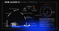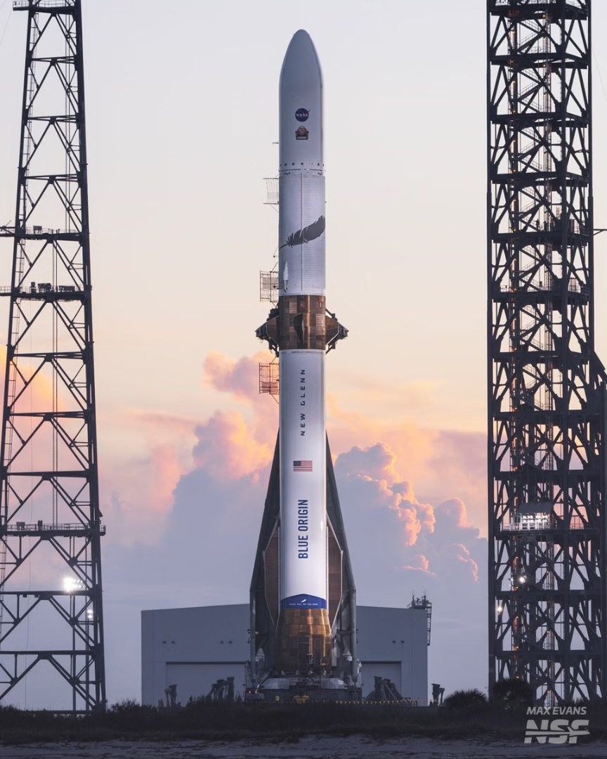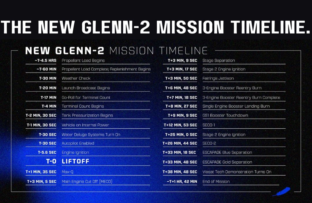 9 novembre, la tentative est ajournée suite à une mauvaise météo sur l'océan Atlantique, un problème de systèmes sol et un navire de croisière se déplaçant dans la zone interdite autour du pad. Avec la FAA, BO planifie un décollage pas avant le 12 entre 19h50 et 21h17 TU, l'agence US interdisant à partir du 10 novembre, les lancements de jour. Le lancement a été coordonné par le programme de services de lancement de la NASA, basé au Centre spatial Kennedy. Le lanceur a été attribuée dans le cadre du contrat de services de lancement VADR (Venture-Class Acquisition of Dedicated and Rideshare) de l'agence. Le contrat global a une valeur maximale de 300 millions de dollars sur une période de cinq ans. Lorsqu'il a été attribué à Blue Origin avec sa fusée New Glenn, la mission ESCAPADE devait être lancée fin 2024 lors du vol inaugural de la fusée. Cependant, comme New Glenn n'était pas prêt à voler à temps, la mission a été reportée au deuxième lancement de la fusée. L'étage GS 2 effectuera deux allumages des moteurs BE-3U avant le déploiement des deux satellites, environ 33 minutes après le décollage. La démonstration technique de Viasat débutera environ cinq minutes après le largage du second satellite ESCAPADE, Gold. 12 novembre, le lanceur New Glenn est prêt au lancement. Cependant, en raison d'une activité solaire très intense et de ses effets potentiels sur le vaisseau spatial ESCAPADE, la NASA reporte le lancement jusqu'à ce que les conditions météorologiques spatiales s'améliorent. Nous évaluons actuellement les possibilités de définir une nouvelle fenêtre de lancement en fonction des prévisions météorologiques et de la disponibilité des sites de lancement.