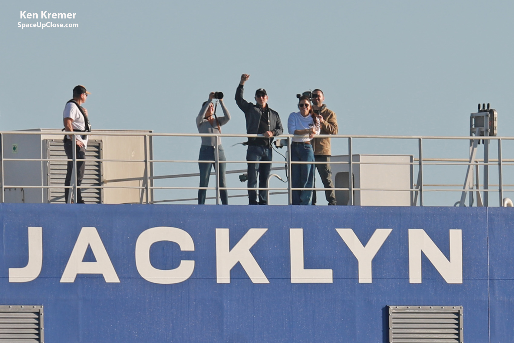 Malgré les annonces de fortes perturbations solaires le 13 novembre, BO décide tenter un lancement à 19h 57 TU. Mais un "hold" à T-20 seconde interromps la séquence. Le décompte reprend ensuite pour un H-0 à 20h45 TU. Nouveau "Hold" à H-17 mn et reprise pour un lancement parfait à 20h55 TU. Le premier étage fonctionne "nominalement" avant d'être largué à T+3mn 29s, à environ 80 km d'altitude. Après une série de manoeuvre (allumage des 3 moteurs à T+ 7mn à 70 km d'altitude durant 30 secondes puis rétro allumage à T+8mn 30s pour l'atterrissage) , il revient se poser à l'image des étages de Space x sur la barge "Jacklyn" au large des Bermudes à T+9 mn 20 mn. L'étage GS2 poursuit son vol et s'éteint une premier fois à T+13 mn puis se rallume à T+ 25 mn durant 2 mn pour l'injection en orbite et la séparation des 2 sondes à T+34 mn. En passant à moins de 965 kilomètres de la Terre en novembre 2027, les sondes ESCAPADE effectueront des survols à assistance gravitationnelle pour accélérer leur progression, renforcés par leur propulsion embarquée, avant de finalement se diriger vers Mars. Au total, les deux sondes spatiales passeront une année entière sur leur orbite initiale en forme de haricot, au-delà de la Lune et sur retour, puis dix mois supplémentaires en route vers Mars. Elles n'atteindront la planète rouge qu'en septembre 2027. Jeff Bezos après le succès du vol NG2 L'étage GS1 sur le pont du "Jacklyn", on voit bien la taille de l'étage, 7 m de diamètre par rapport aux homme tout autour...