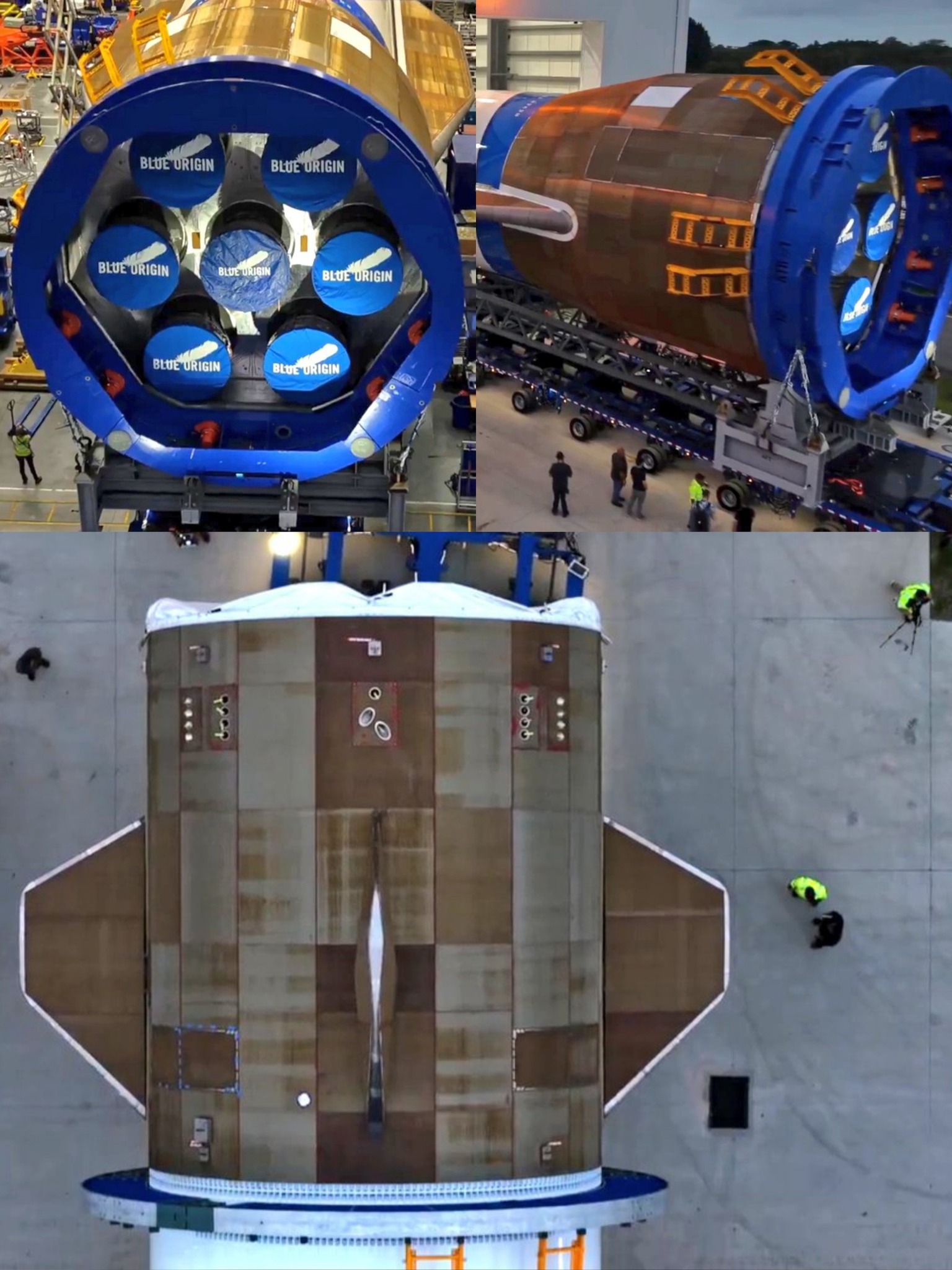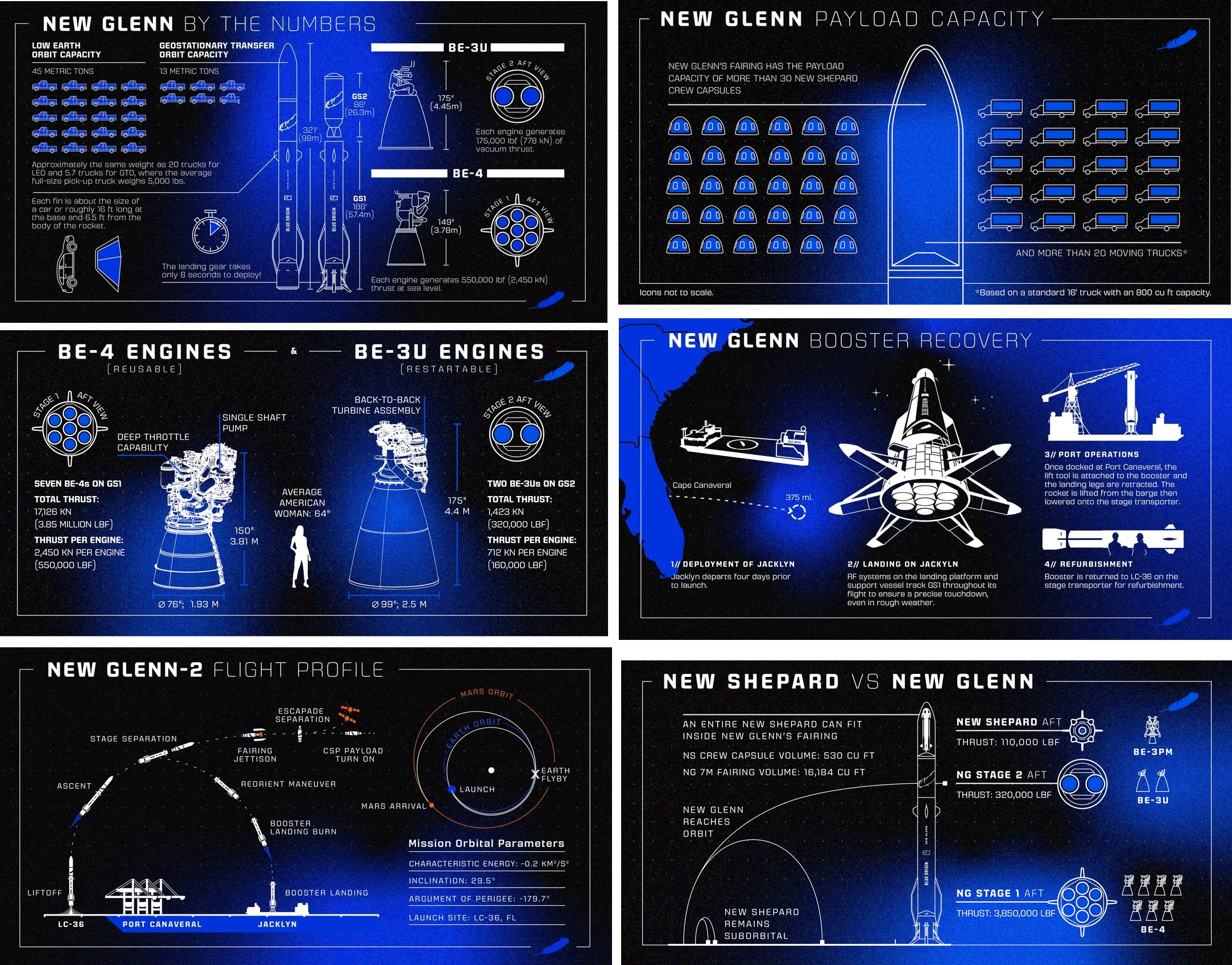 d'achèvement. Juillet 2021, à la suite de la décision par SpaceX de développer le Starship, Blue Origin développe un deuxième étage entièrement réutilisable en acier dans le cadre du projet Jarvis. Un premier exemplaire de réservoir en acier est amené à SLC-36 pour des tests en août 2021. Aout, premières vues des essais préliminaires du projet "Jarvis" sur le LC36, destiné à développer un étage entièrement réutilisable pour le New Glenn. Les équipes de Blue Origin ont déplacé le réservoir en acier "tank" au Nord du LC36 pour une série de tests visant à déterminer sa force et sa capacité à maintenir des propulseurs sous pression. Le projet Tank est un aspect du programme réutilisable de l'étage supérieur, l'autre aspect est de sélectionner et de finaliser une conception pour cet étage, soit avec des ailes, soit avec un moteur Aerospike qui servirait de bouclier thermique pendant la rentrée à travers l'atmosphère de la Terre, soit enfin une approche similaire au Starship de Space X qui se pose au sol, utilisant une combinaison d'ailerons et de moteurs de freinage. Octobre 2021, New Glenn devait initialement effectuer son vol inaugural en 2020, mais a été retardée au 4e trimestre 2022 – une source proche des progrès de la fusée a déclaré que cet objectif était extrêmement optimiste, affirmant que le lancement inaugural n'aurait pas lieu avant 2024. L'exode des talents depuis un certain temps chez Blue Origin expliquerait les retards. Depuis le début de cette année, 20% du personnel est partie sans être renouvelés, Blue Origin emploie 4000 personnes, les départs représentent cette des centaines de salariés. La cause majeure de ces départs serait le fait du leadership de Bob Smith, qui dirige l'entreprise depuis 2017. Ce dernier aurait demandé le retour au bureau e octobre pour plusieurs employés alors en travail à distance. D'abord en accord avec Smith, Jeff Bezos aurait retardé ce retour à janvier 2022. Novembre 2021, la maquette "pathfinder" du premier étage du New Glenn GS-1 est à l'extérieur du site de production de Canaveral posée sur son transporteur en partance pour le LC36 en vue de tests au sol. Blue Origin a déclaré que le simulateur GS1 "permettrait à l'équipe de s'entraîner aux opérations au sol pour le premier étage massif de New Glenn, y compris le transport du complexe de fabrication de fusées au LC-36 pour l'intégration". Le simulateur se compose de modules arrière, médians et avant séparables, qui émulent la masse, le centre de gravité, la ligne de moule externe et les interfaces externes des modules de vol. Test de séparation des demi coiffe du New Glenn au NASA Glenn Research Center Armstrong Test Facility Space Environments Complex. Mars 2022, Blue Origin visait la fin de 2022 pour le premier lancement de New Glenn, "mais cela ne se produira pas et nous n'avons pas encore de nouvel objectif." Profit de vol, le New Glenn décolle. Après la séparation, le premier étage descend de manière autonome jusqu'à une plate-forme d'atterrissage située à 1 000 km en aval. Les deux BE-3U s'enflamment, propulsant le deuxième étage dans l'espace. La coiffe se sépare, délivrant les charges utiles en orbite en toute sécurité. L'usine de fabrication du New Glenn à Canaveral, en avril 2022 Avril 2022, Amazon signe 27 lancements de satellites avec le New Glenn, dont 12 fermes pour sa constellation Kuiper. La constellation de 3 236 satellites avancés du projet Kuiper vise à fournir un service haut débit à faible latence à l'échelle mondiale. Les 61 lancements se dérouleront sur une période de cinq ans. Le New Glenn se partage les lancements d'Amazon entre Vulcan (45) et Ariane 6 (35 à 40). En plus du projet Kuiper, New Glenn transporterait également des charges utiles pour trois des six plus grands opérateurs de satellites au monde : Eutelsat, JSAT et Telesat. La NASA avait précédemment sélectionné New Glenn pour son catalogue de services de lancement, approuvant la fusée pour participer aux missions scientifiques et d'exploration avancées de la NASA. 23 avril, journée portes ouvertes sur le LC36 avec devant le hangar d'intégration, le "pathfinder" du New Glenn Juin 2022, un premier moteur BE-4 est installé sur le banc d'essai du centre Marshall, à Hunstville, banc qui accueillait il y a 50 ans les moteurs F1 du Saturn 5. La banc 4670 a été remis à neuf par Blue Origin. Second étage du New Glen, GS-2 au complexe LC36, juillet 2022 Aout 2022, Blue Origin abandonne un navire de transport qu'il avait prévu autrefois de transformer en plate-forme d'atterrissage pour ses lanceurs de classe orbitale New Glenn. Connu sous le nom de Stena Freighter au moment de la vente, Blue Origin a acheté le navire à la mi-2018. Mis à part une cérémonie de rebaptême rapide en décembre 2020 au cours de laquelle Jeff Bezos, a nommé le navire Jacklyn en l'honneur de sa défunte mère, la société a laissé le navire en grande partie intact dans un port de Floride. De petites équipes de travailleurs travaillaient occasionnellement à la modernisation du cargo roulier pour une vie future en tant qu'actif de récupération de fusée, mais ont réalisé très peu de progrès visibles malgré le travail sur Jacklyn pendant plusieurs années. Aujourd'hui, quelques mois après qu'un porte-parole de Blue Origin a reconnu pour la première fois que la société évaluait « différentes options » pour la récupération du booster New Glenn, Jacklyn a quitté le port de Pensacola en Floride pour le port texan de Brownsville, où des documents montrent que le navire sera démoli. Selon un rapport non confirmé, Blue Origin pourrait à terme faire appel aux mêmes sous-traitants que SpaceX pour transformer les barges existantes en plates-formes d'atterrissage de fusées océaniques. Blue Origin avait espéré qu'un grand navire à quille lui permettrait de lancer New Glenn tout en récupérant son co