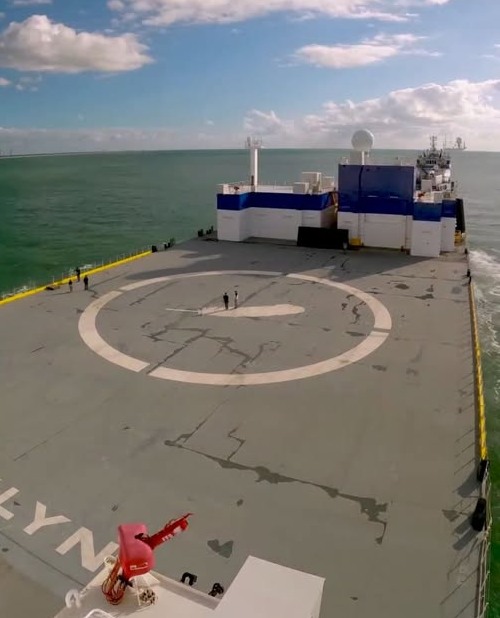 L'atterrissage du booster du NG se fera sur la barge "Jacklyn" entièrement autonome et ne nécessitant aucun équipage. La barge est sur place dans l'océan Atlantique au large des Bahamas 4 jours avant le décollage. Elle mesure 380 pieds de long avec un système de traction à l'avant de 400 pieds de long et 150 de large avec un tirant d'eau de 11 pieds. 2 moteurs à l'avant et à l'arrière assurent les manoeuvres. Tracté par un bateau, la barge arrive à destination et se positionne par ses propres moyens selon les coordonnées de vol pour l'atterrissage du booster. Lorsque le booster atterrit, un engin autonome le ROV Remotely Operated Vehicle vient se "brancher" à la base de l'étage pour le sécuriser en le remplissant d'azote. 6 supports dit de transit sécurisent le booster sur la barge permettant à l'équipage de monter à bord pour finaliser les opérations. Le processus dure 10 heures. Pour le retour à Cap Canaveral, l'équipage retourne sur le bateau de transport.