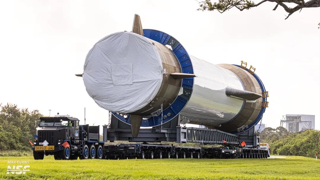 Septembre 2024, la base du premier étage GS 1 avec le bouclier thermique entre les 7 moteurs. La NG a une trajectoire très particulière, et son premier étage va beaucoup plus vite qu’une F9 par exemple. Le retour va être très, très chaud. Trois des sept moteurs pivotent pour offrir l'autorité de contrôle du New Glenn lors de l'ascension, de la rentrée atmosphérique et de l'atterrissage sur le Jacklyn, le navire de récupération en mer. Cette capacité de pivotement, ainsi que le train d'atterrissage et les propulseurs du Système de Contrôle de Réaction, sont essentiels pour rendre notre booster entièrement réutilisable. Fait amusant : la condition de gimbal maximale du véhicule se produit lors de l'ascension, lorsqu'il doit lutter contre les vents en haute altitude 30 octobre 2024, le premier étage du NG1 sort de son usine à Cap Canaveral et est amené dans le bâtiment d'intégration du LC36 en vue de sa préparation pour les 2 prochaines étapes clés, la répétition générale avec remplissage des ergols "Wet dress" pour simuler un lancement et la mise à feu statique des 7 moteurs BE4 sur le pad. Le transporteur sur lequel repose l'étage comprend deux remorques reliées par un support et un ensemble de renforts conçus en interne. Ce véhicule de transport compte 22 essieux et 176 pneus. Il est tracté par un Oshkosh M1070, un transporteur de chars de l'armée américaine reconverti, avec 505 chevaux et 2474 Nm de couple. Il a été baptisé "GERT" Giant Enormous Rocket Truck. La distance entre le pare-chocs avant du GERT et l'arrière de la remorque est de 94.5 m. Bien que situé à 14 km du complexe de lancement, le voyage est beaucoup plus long, 37km et prend plusieurs heures à des dimensions du chargement qui nécessite un long détour. Il y aura tentative de retour sur la barge "Jacklyn" (LPV-1 Landing Platform Vessel 1). La barge mesure 116 m de long pour 45 de large et 7 de profondeur. Jacklyn est le prénom de la mère de Jeff Bezos. "Notre plateforme d'atterrissage en mer pour le NewGlenn est l'un des plus grands navires télécommandés au monde. Un système impressionnant à bord du Jacklyn est notre Véhicule Télécommandé de Récupération (ROV), qui se connecte au premier étage réutilisable de New Glenn immédiatement après son atterrissage. Cette connexion fournit l'alimentation électrique, les liaisons de communication et pneumatiques entre l'étage et la plateforme. Le ROV a une empreinte au sol similaire à celle d'un pick-up F-150, mais il est nettement plus haut, atteignant environ 4,3 mètres lorsque son bras manipulateur est déployé. Lors de l'atterrissage, il est contrôlé depuis un navire de soutien situé à cinq à dix milles nautiques du Jacklyn. Ce dispositif présente un avantage majeur : il accélère considérablement les délais de remise en service des missions tout en assurant une meilleure sécurité pour l'équipage. Jacklyn a été utilisé pour la première fois sur un cargo roulier de 1997 à 2018 sous le nom de Stena Freighter . Le navire a été acquis par Blue Origin en 2018 et les travaux ont rapidement commencé pour préparer les opérations de récupération de New Glenn Novembre 2024, pas de lancement avant la fin de cette année. Pour Bezos, un lancement avant fin 2024 permettra de pouvoir être sélectionné pour certains contrats supplémentaires de l'USAF (1ere part des "Lane 1 awards" de l'USAF NSSF Phase 3). 12 novembre 2024, les étages GS-1 et GS-2 sont maintenant assemblé annonce Blue Origin, constituant le lanceur NG1. Les moteurs BE4 sont vraiment très gros. Les moteurs centraux en ligne, 1 à 3 sont orientables et réallumable pour le retour. Les autres sont fixes et ne s'allument qu'une seule fois. 22 novembre 2024, le lanceur NG1 est amené sur le LC36 pour un essai de mise à feu. 8 décembre 2024, remplissage en ergols du premier étage du lanceur GS1 suivit le 10 du second étage. L'étage GS-1 contient 850 m3 de LOX et 708 m3 de méthane, équivalent à 24 et 20 remorques citernes. Le plein se fait en 30 minutes environ, pour le tir statique, il ne faudra que 3mn 5 s.